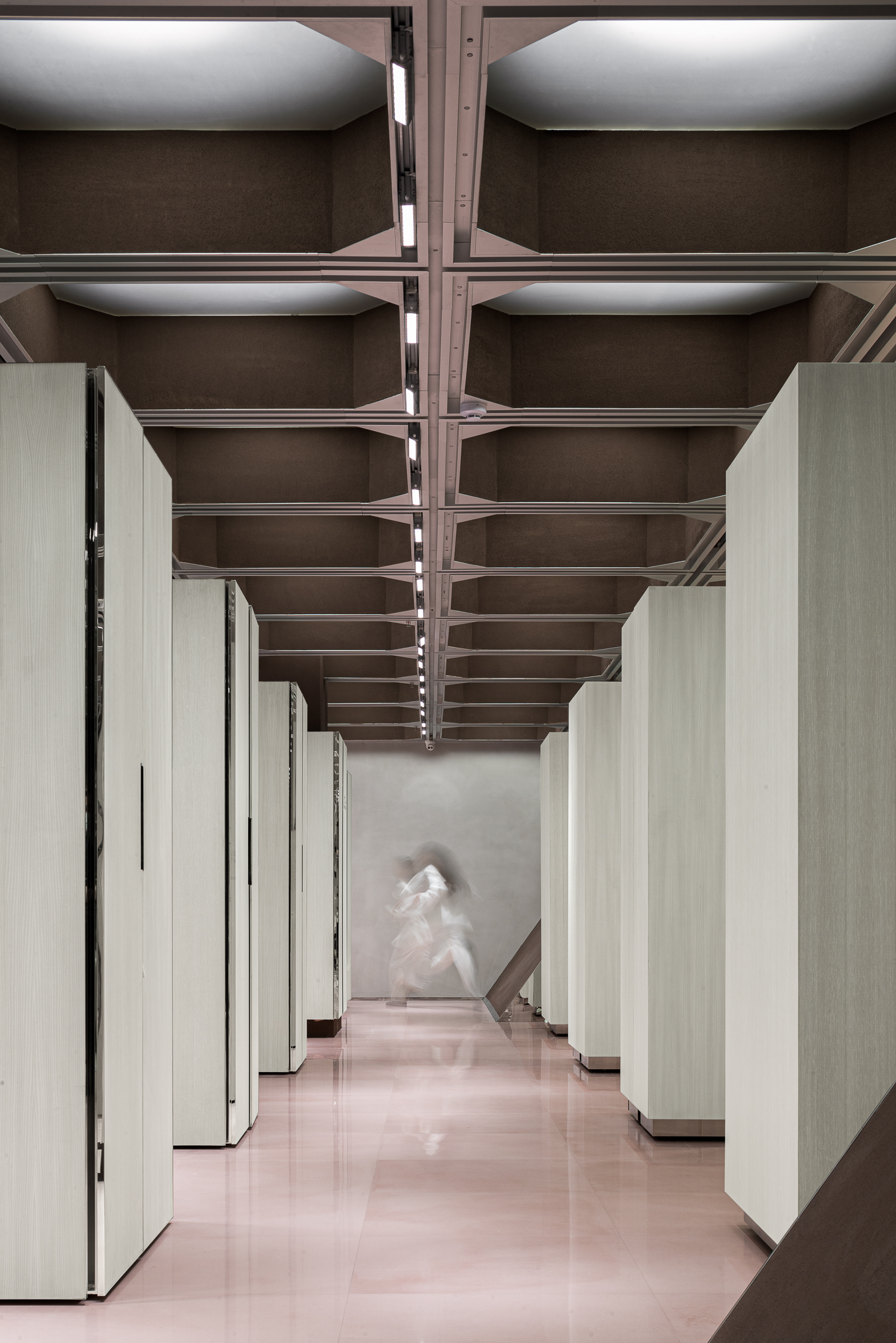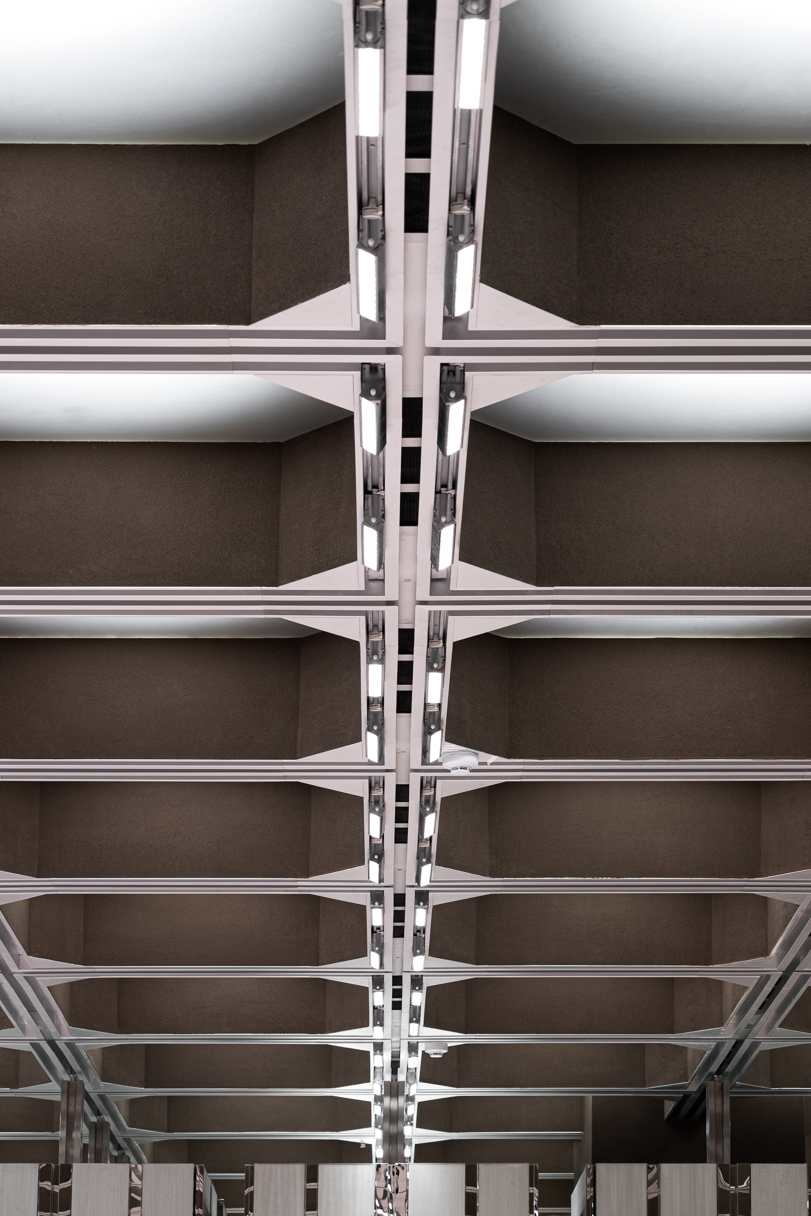 천장은 질서정연한 구조미를 가진 패턴으로 디자인되었고, 그 이면에는 조명, 소방 설비, 공조 시스템, 캐비닛 이동 레일 등 복잡한 설비가 통합되어 숨겨져 있다. 건축가는 이를 하나의 구조·조명 장치로 통합해, 기능과 미학이 동시에 읽히는 천장 풍경을 만들었다.