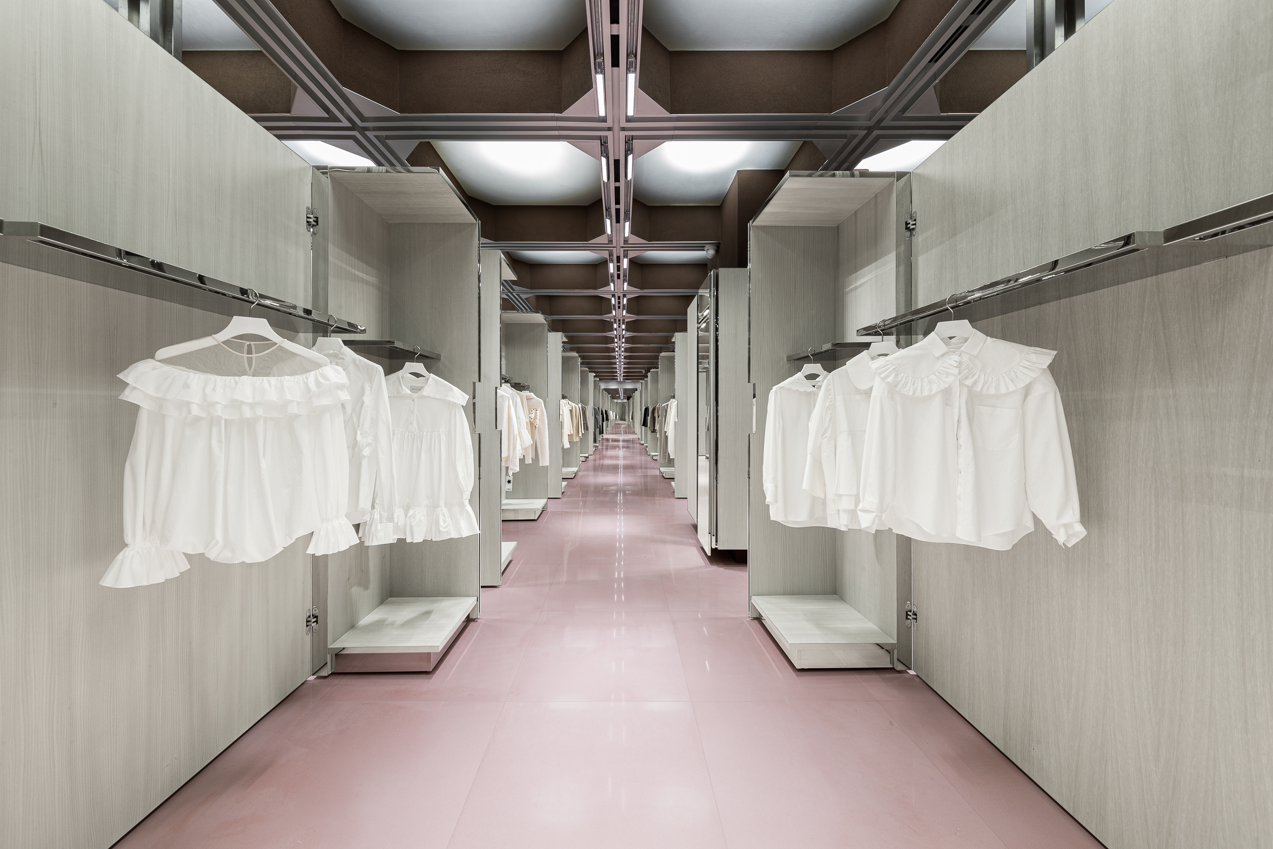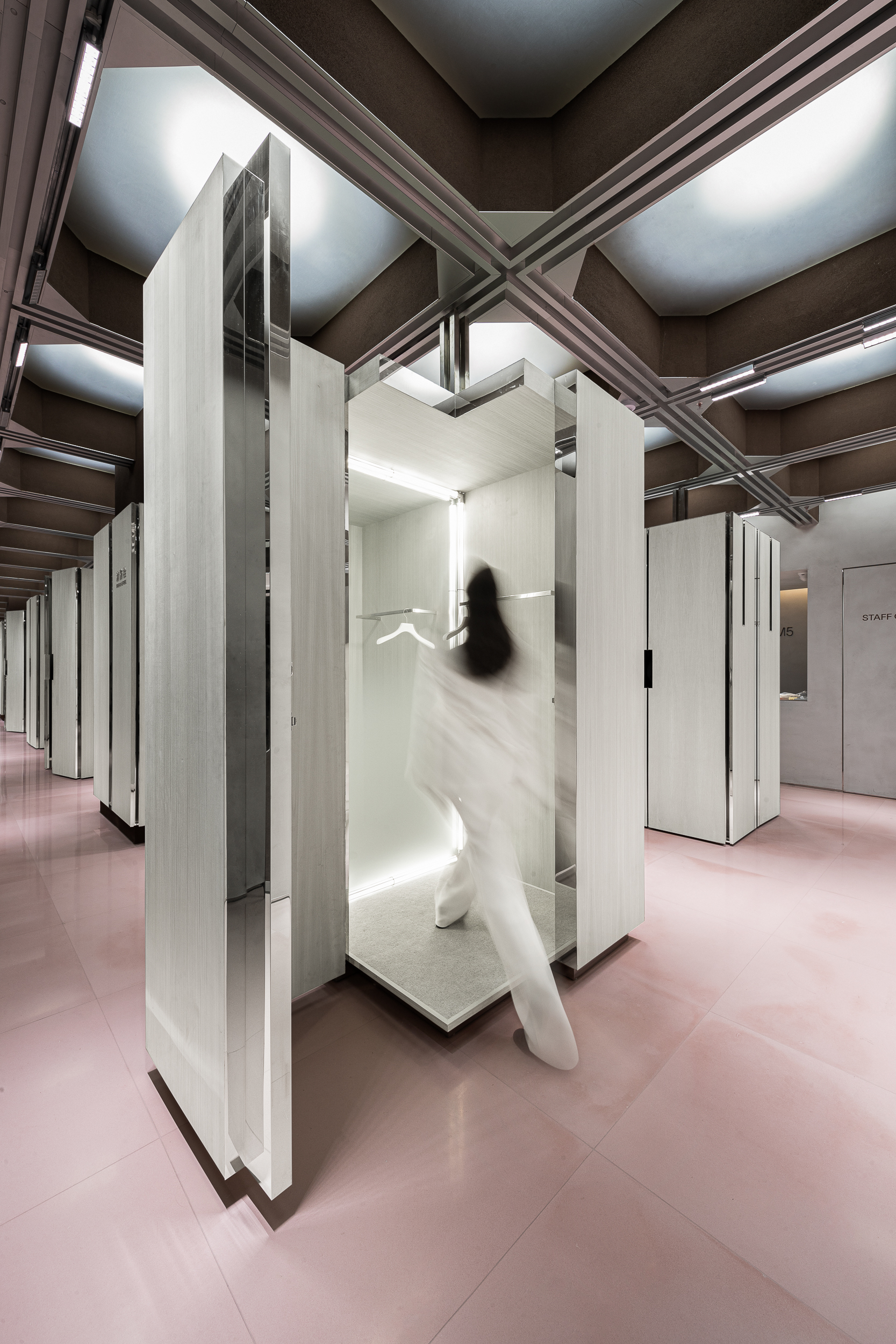 • 데일리 모드(Daily Mode) 에서는 기둥들이 규칙적으로 배열되어, 브랜드 의류가 걸린 캐비닛 사이를 거닐며 쇼핑하는 경험을 만든다.