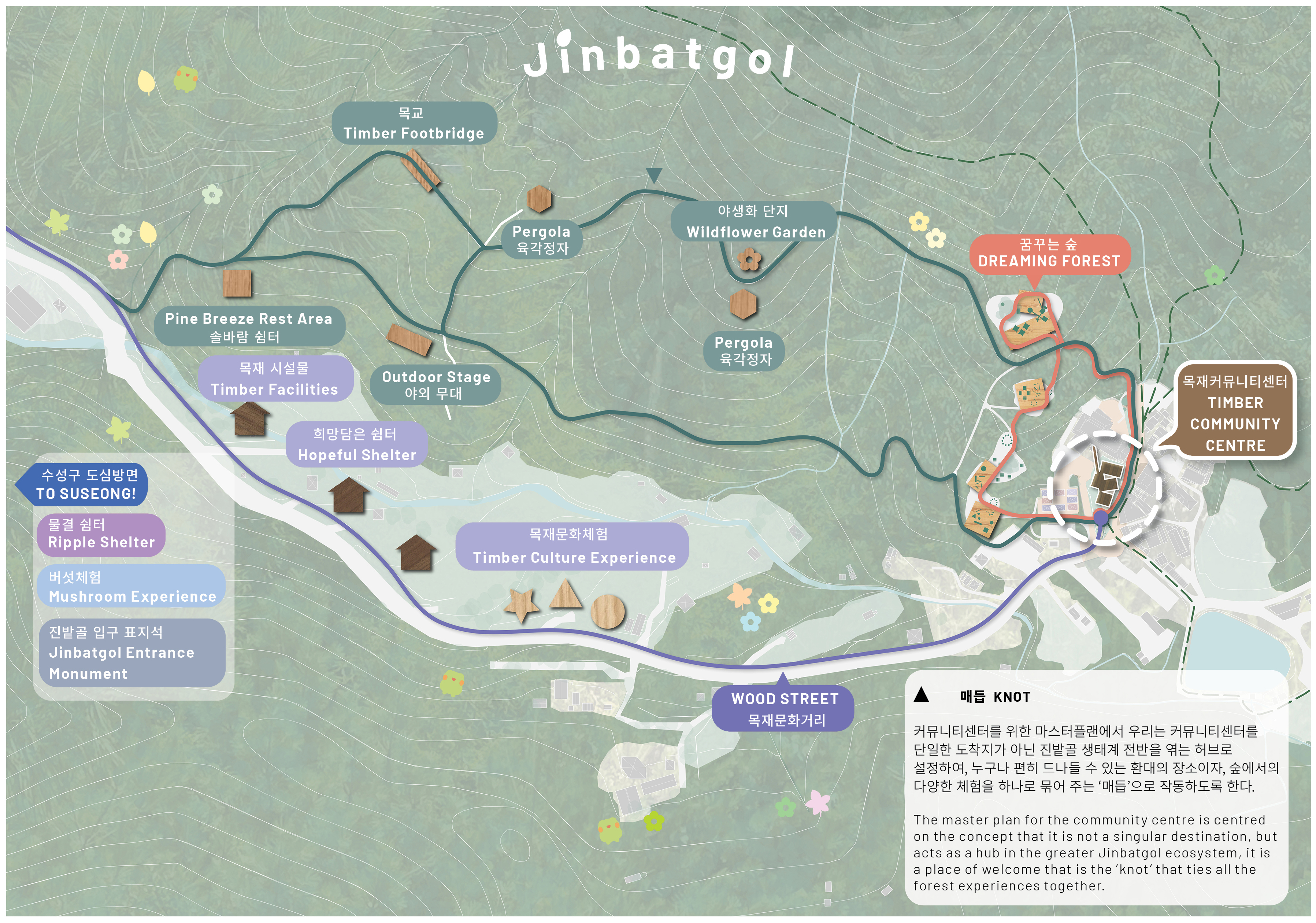 진밭골 목재친화도시 목재커뮤니티센터는 ‘리빙 그라운드(Living Ground)’를 개념으로, 마치 그 땅에서 돋아난 듯한 목재의 풍경으로서 설계된 커뮤니티 시설이다. 경사진 삼각형 대지에 주변 민가의 스케일을 고려하여, 건물을 도시와 숲, 청소년수련원과 진밭골 목재거리를 매개하는 문턱이자 매듭으로 설정하였다.