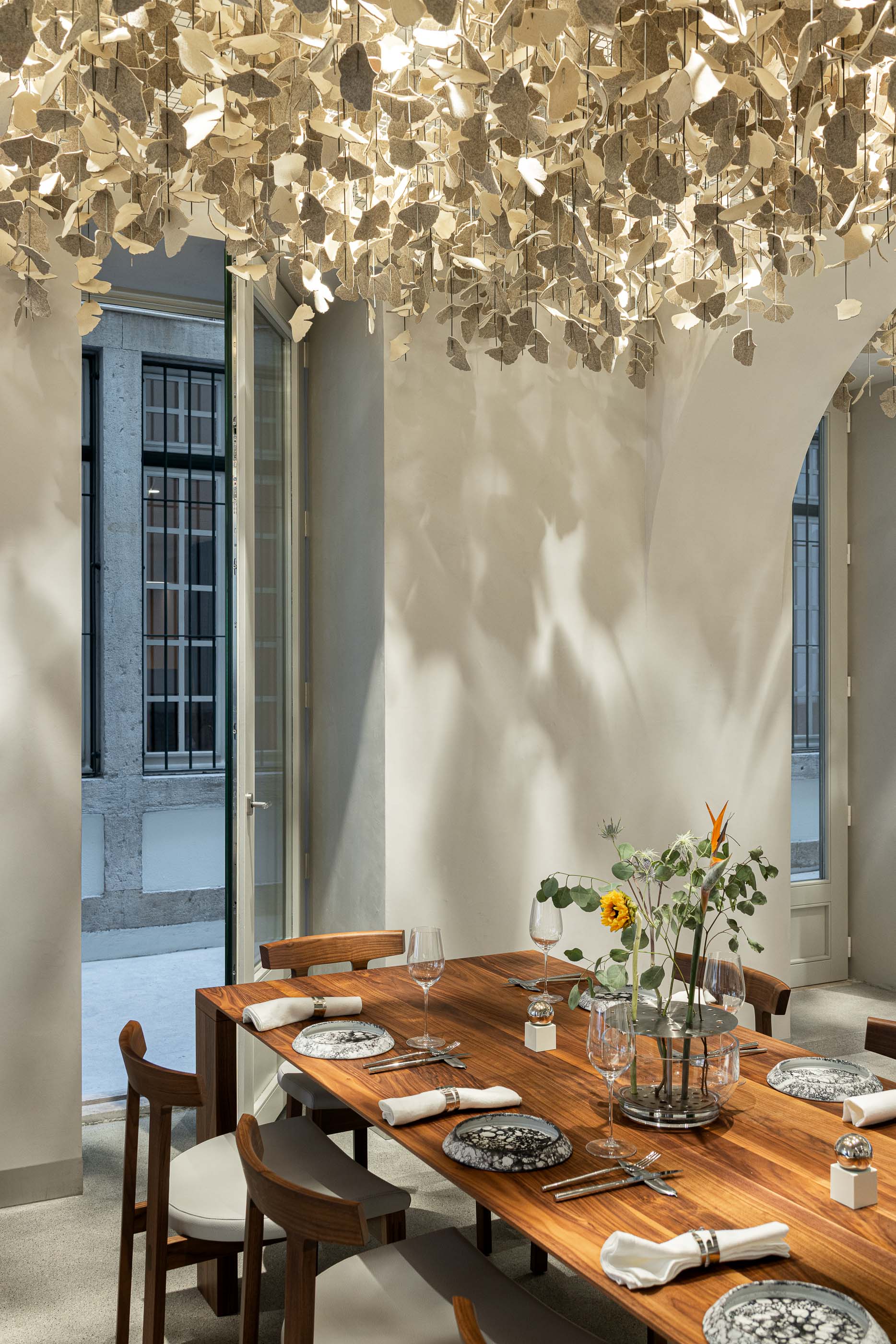 조명 계획 역시 공간의 분위기를 결정짓는 중요한 요소다. 첫 번째 공간을 채우는 부채 형태의 조명은 확산적이면서도 시각적 리듬을 만들고, 부렐(burel)로 제작한 은행나무(Ginkgo Biloba) 조명은 섬세하고 따뜻한 표정을 더해 방문객을 부드럽게 맞이한다.