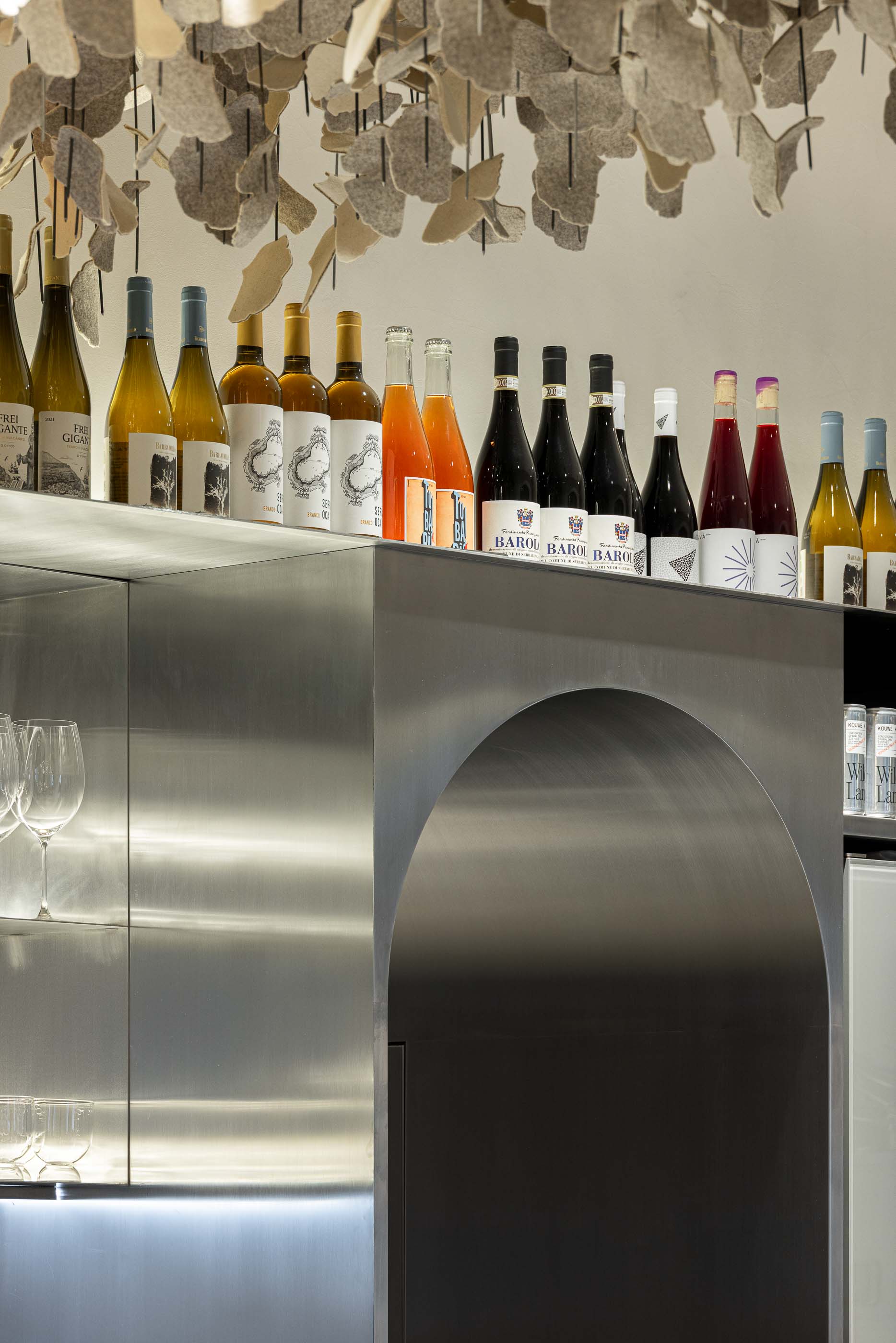 가장 중심이 되는 네 개의 아치는 밝은 회색 톤으로 마감되어 벽과 천장과 부드럽게 이어지며, 건물의 오랜 시간성을 현대적 분위기 속에 자연스럽게 끌어안는다. 바닥의 연속적인 테라조 마감은 이 중립성을 더욱 강화하며, 스테인리스 설비와 오크·월넛·가죽으로 만든 가구가 도드라질 수 있는 배경이 된다.