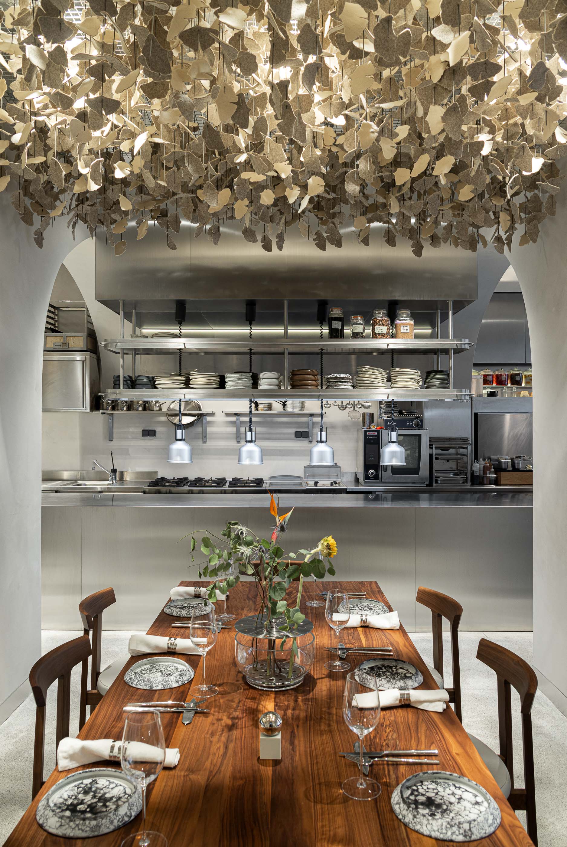 가장 중심이 되는 네 개의 아치는 밝은 회색 톤으로 마감되어 벽과 천장과 부드럽게 이어지며, 건물의 오랜 시간성을 현대적 분위기 속에 자연스럽게 끌어안는다. 바닥의 연속적인 테라조 마감은 이 중립성을 더욱 강화하며, 스테인리스 설비와 오크·월넛·가죽으로 만든 가구가 도드라질 수 있는 배경이 된다.