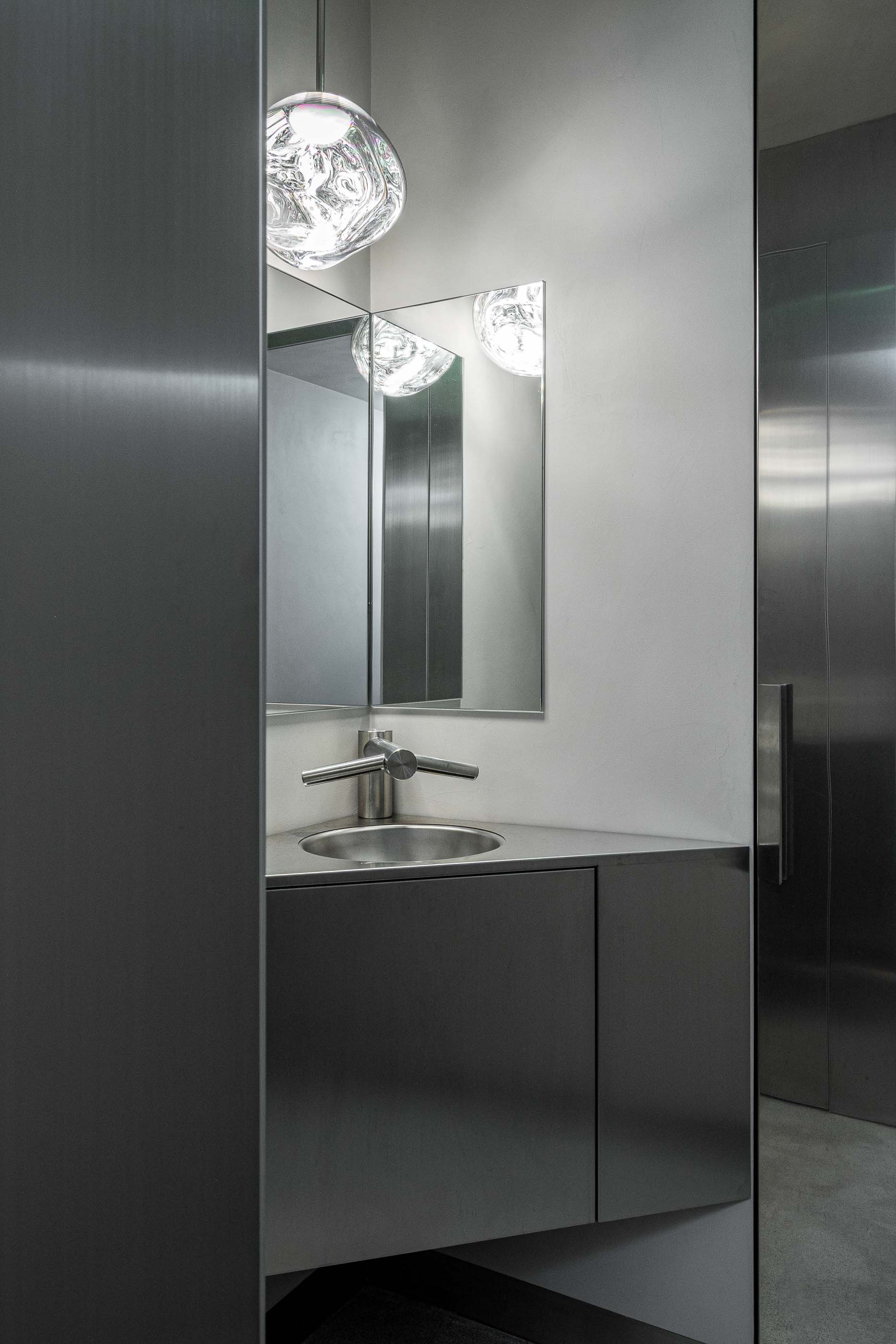 공간의 길이를 따라 배치된 긴 카운터는 주방·서비스 영역과 다이닝룸을 분리하며, 후면부에서는 삼각형 형태의 아일랜드가 바와 카페 구역의 중심을 형성한다. 화장실은 순환 동선 뒤쪽에 숨겨져 있어, 전체적으로 깨끗하고 간결한 공간 흐름을 유지한다.