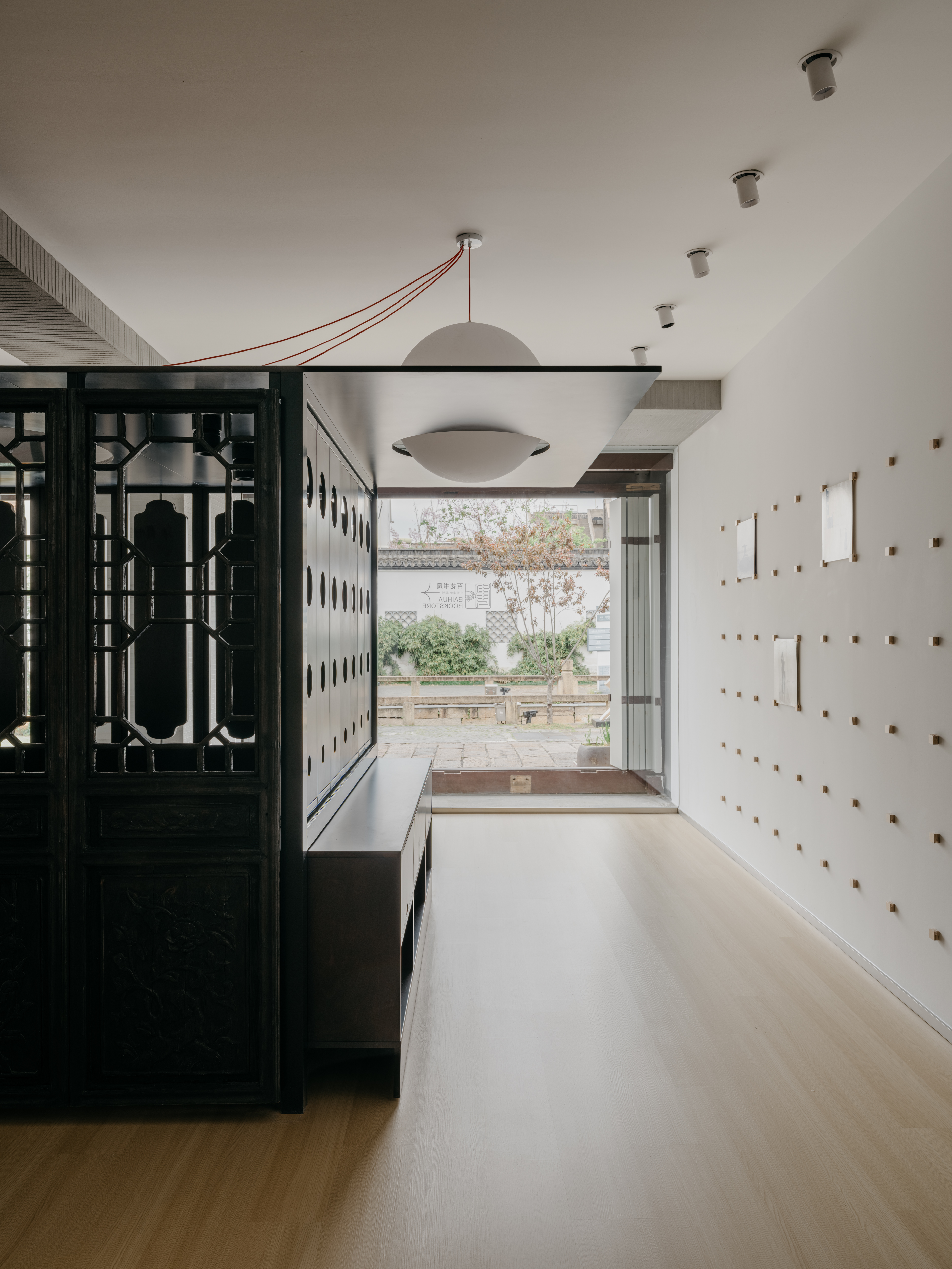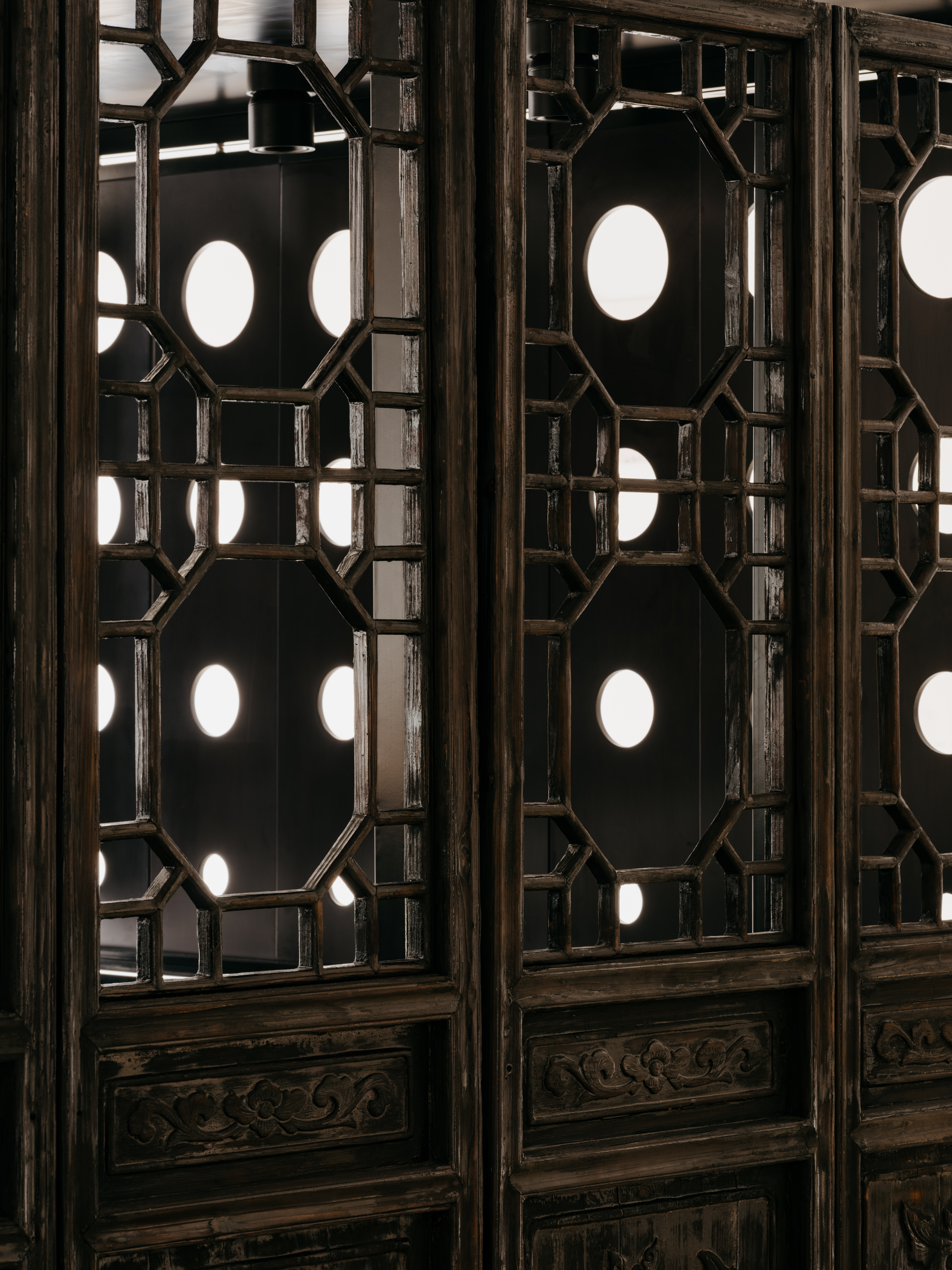 당밍단 북측 파사드는 기존 공간에서 발견된 헌 목재문을 탄화 기법으로 가공해 새로운 질감을 입혔다. 손때 묻은 목질의 온기를 드러내는 방식이다. 반면 남측 파사드는 도금 천공 강판으로 구성해 전통성과 현대성이 대비되는 표정을 만든다. 천공 패턴은 곤곡 배우의 초승달 장식을 추상화한 형태로, 가까이에서 보면 서예적 리듬감을 지닌다. 기존 건물의 조각창은 장식적 보존이 아닌, 새로운 구조 속에서 의미를 갱신하는 서사적 요소로 재배치되었다.