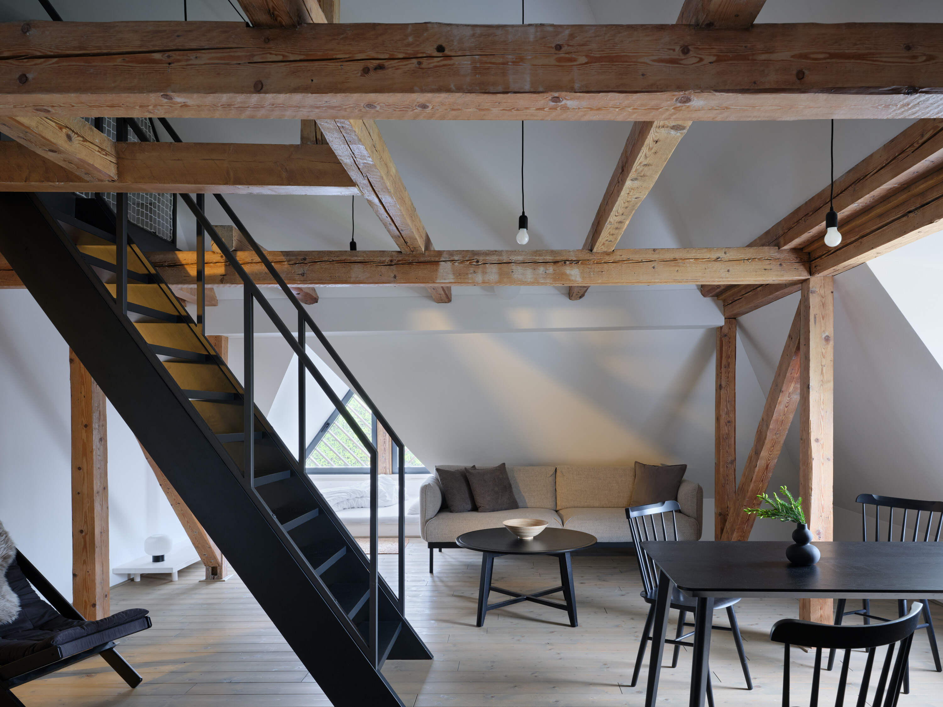 공사 중 발견된 사실은 프로젝트의 성격을 더욱 분명하게 했다. 2층과 3층에 기존 마감 아래 감춰져 있던 전통 통나무 구조가 드러난 것이다. 이 정도 규모의 목조 구조는 크르코노셰 지역에서도 매우 드문 사례로, 팀은 이를 새로운 디자인의 핵심 요소로 보존하고 과감히 노출시키기로 했다. 전시 공간으로 재탄생한 상층부는 이 목구조의 장인적 디테일을 고스란히 드러내며, 다락의 객실 역시 드라마틱한 목재 트러스가 실내 풍경을 형성한다. 반면 하층부의 조적조 벽체는 새로운 콘크리트 증축부와 결합되며 과거와 현재의 재료적 대비를 보여준다.