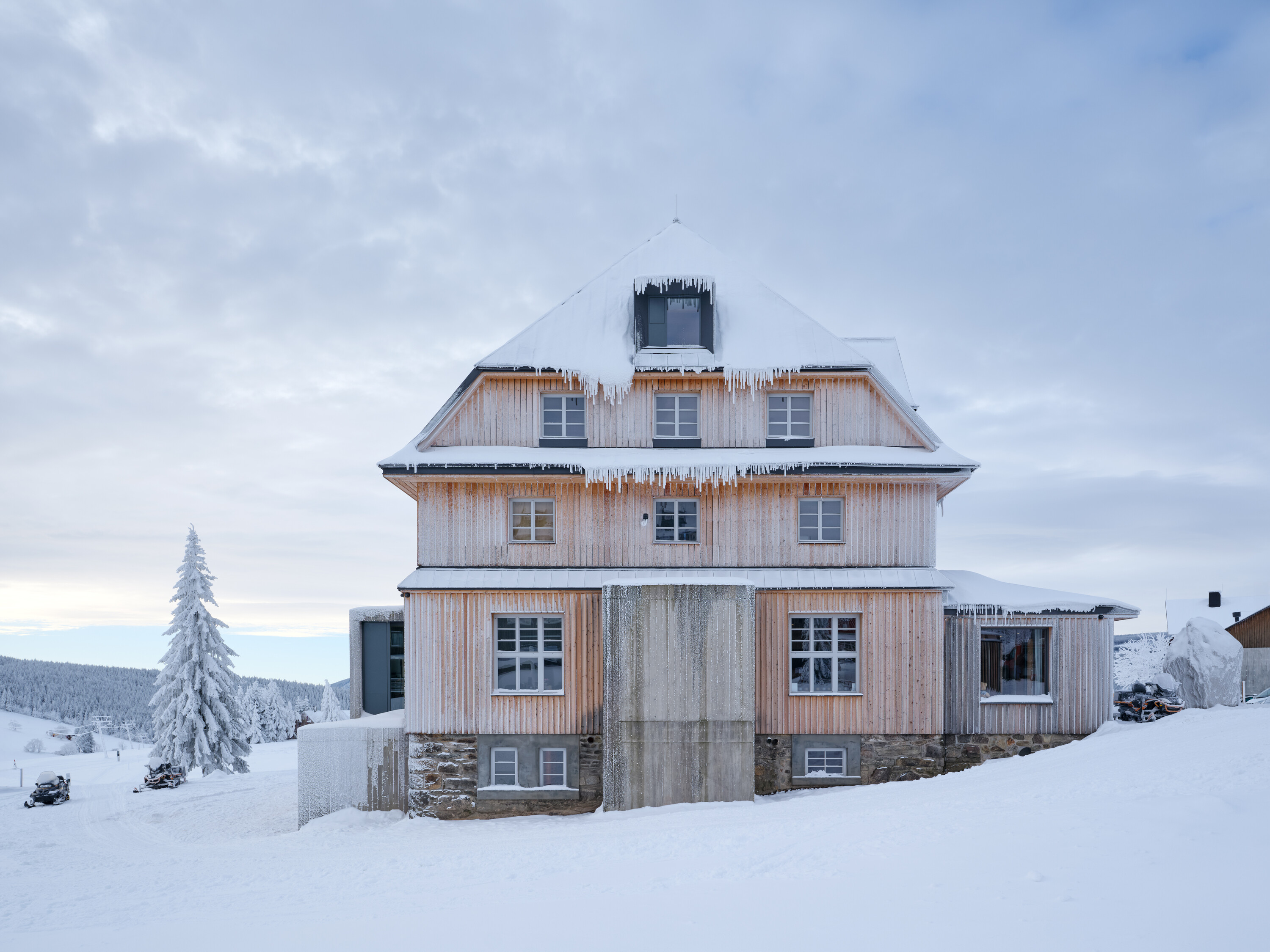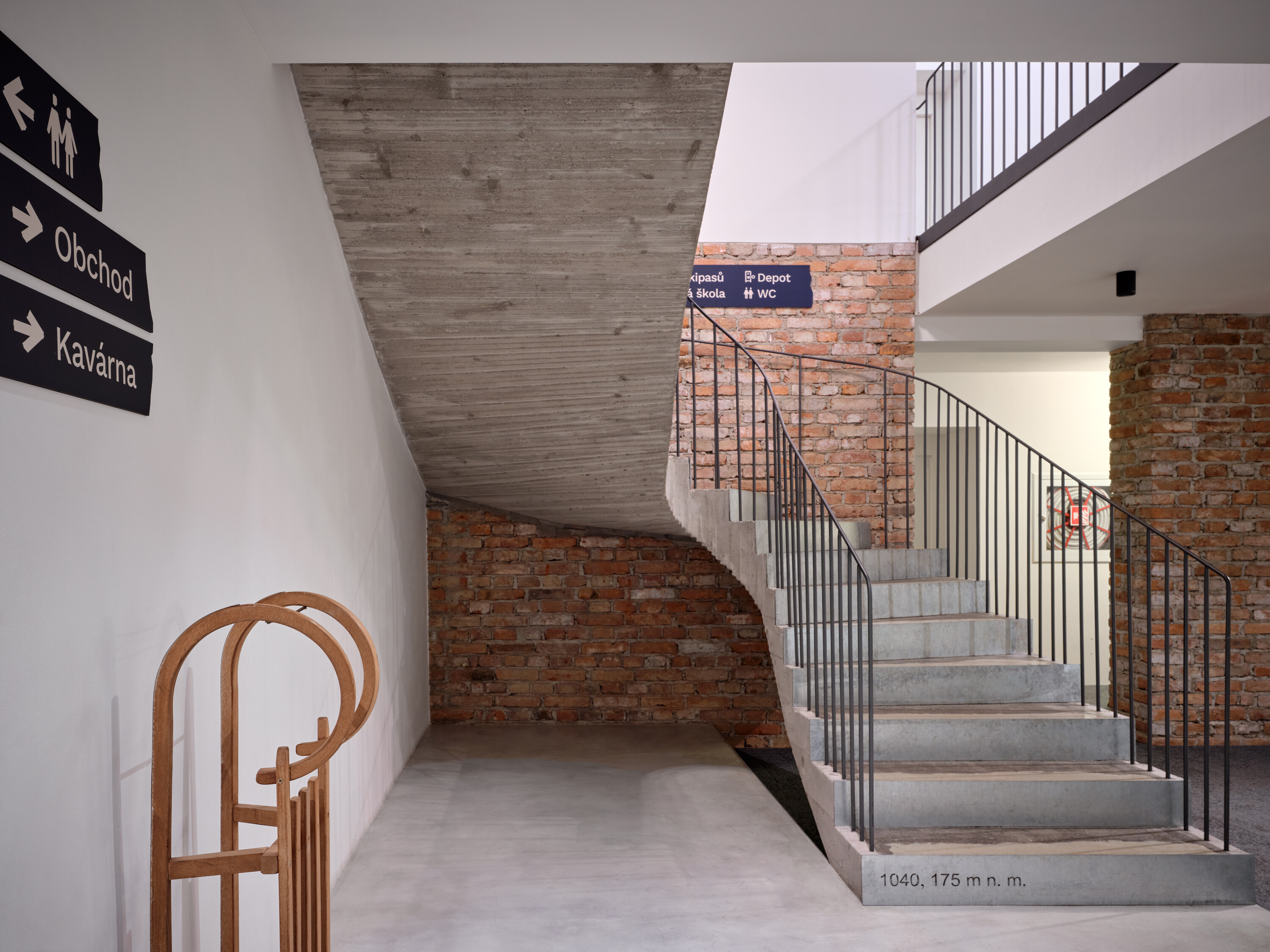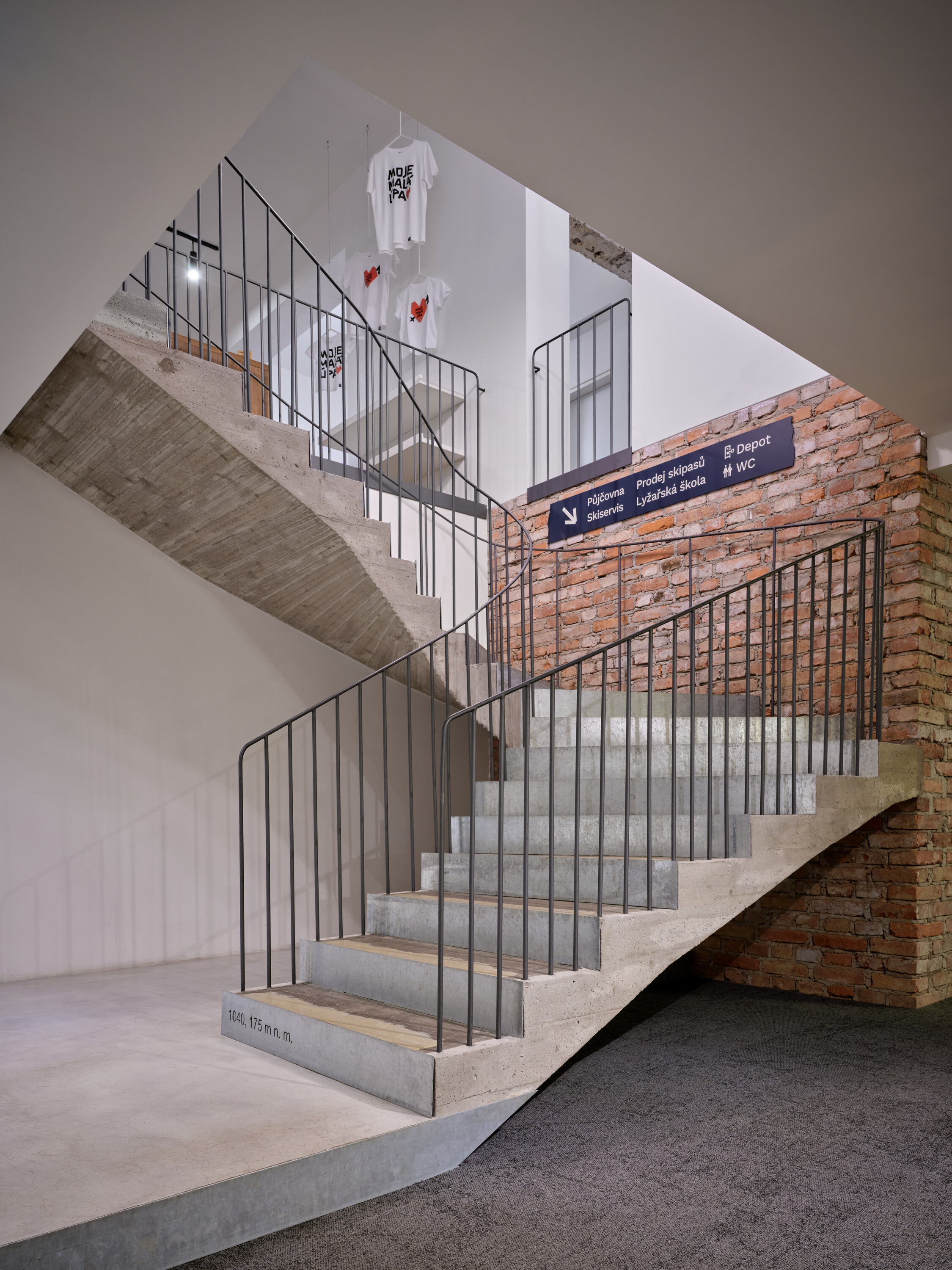 공사 중 발견된 사실은 프로젝트의 성격을 더욱 분명하게 했다. 2층과 3층에 기존 마감 아래 감춰져 있던 전통 통나무 구조가 드러난 것이다. 이 정도 규모의 목조 구조는 크르코노셰 지역에서도 매우 드문 사례로, 팀은 이를 새로운 디자인의 핵심 요소로 보존하고 과감히 노출시키기로 했다. 전시 공간으로 재탄생한 상층부는 이 목구조의 장인적 디테일을 고스란히 드러내며, 다락의 객실 역시 드라마틱한 목재 트러스가 실내 풍경을 형성한다. 반면 하층부의 조적조 벽체는 새로운 콘크리트 증축부와 결합되며 과거와 현재의 재료적 대비를 보여준다.