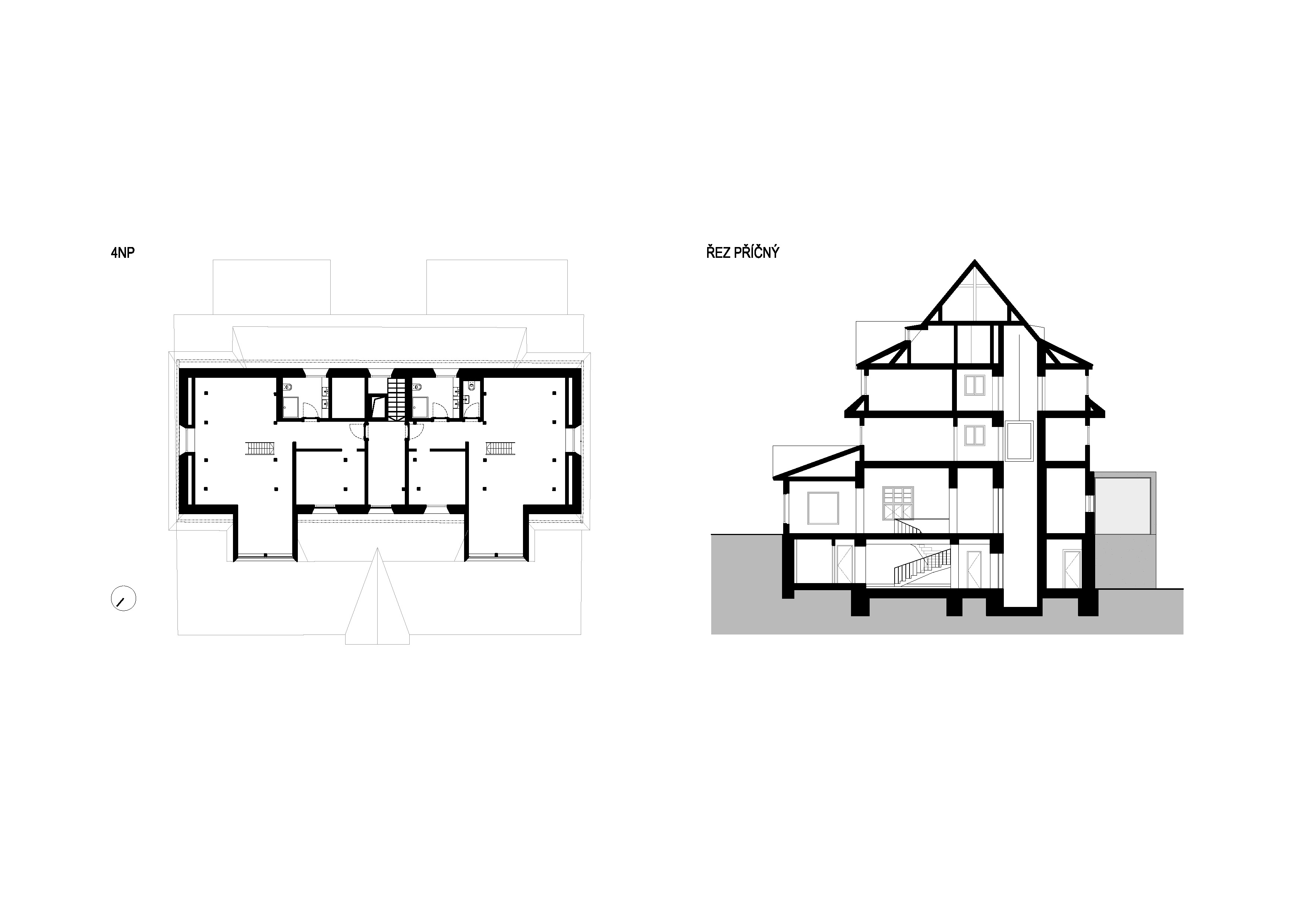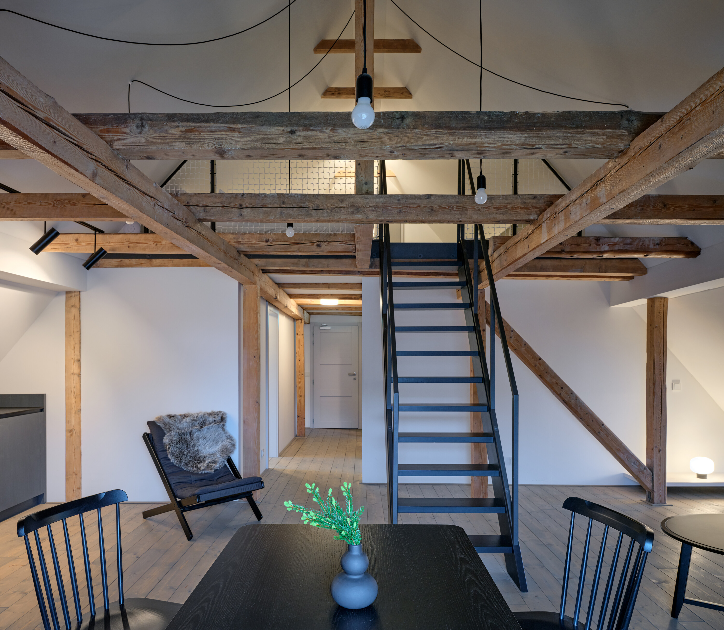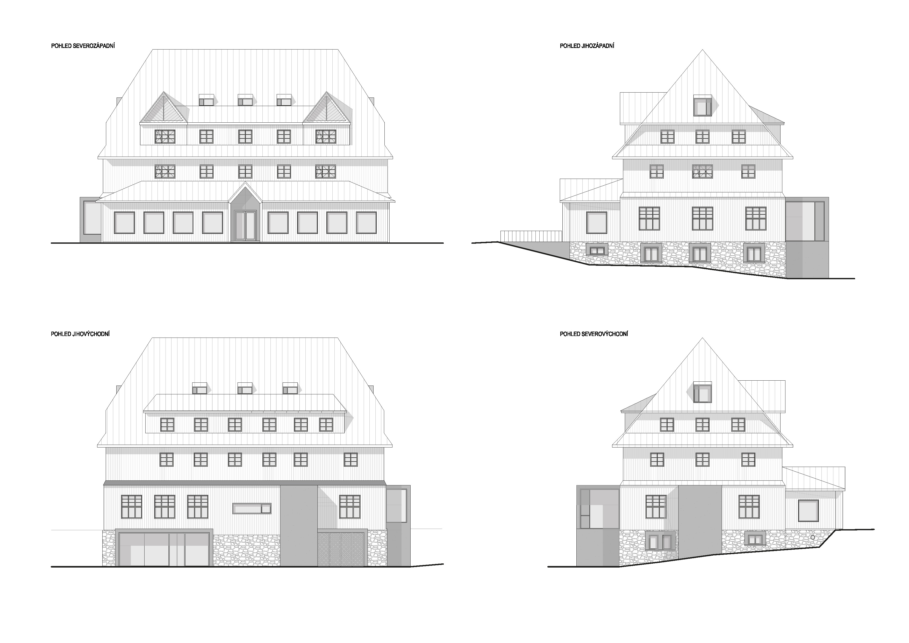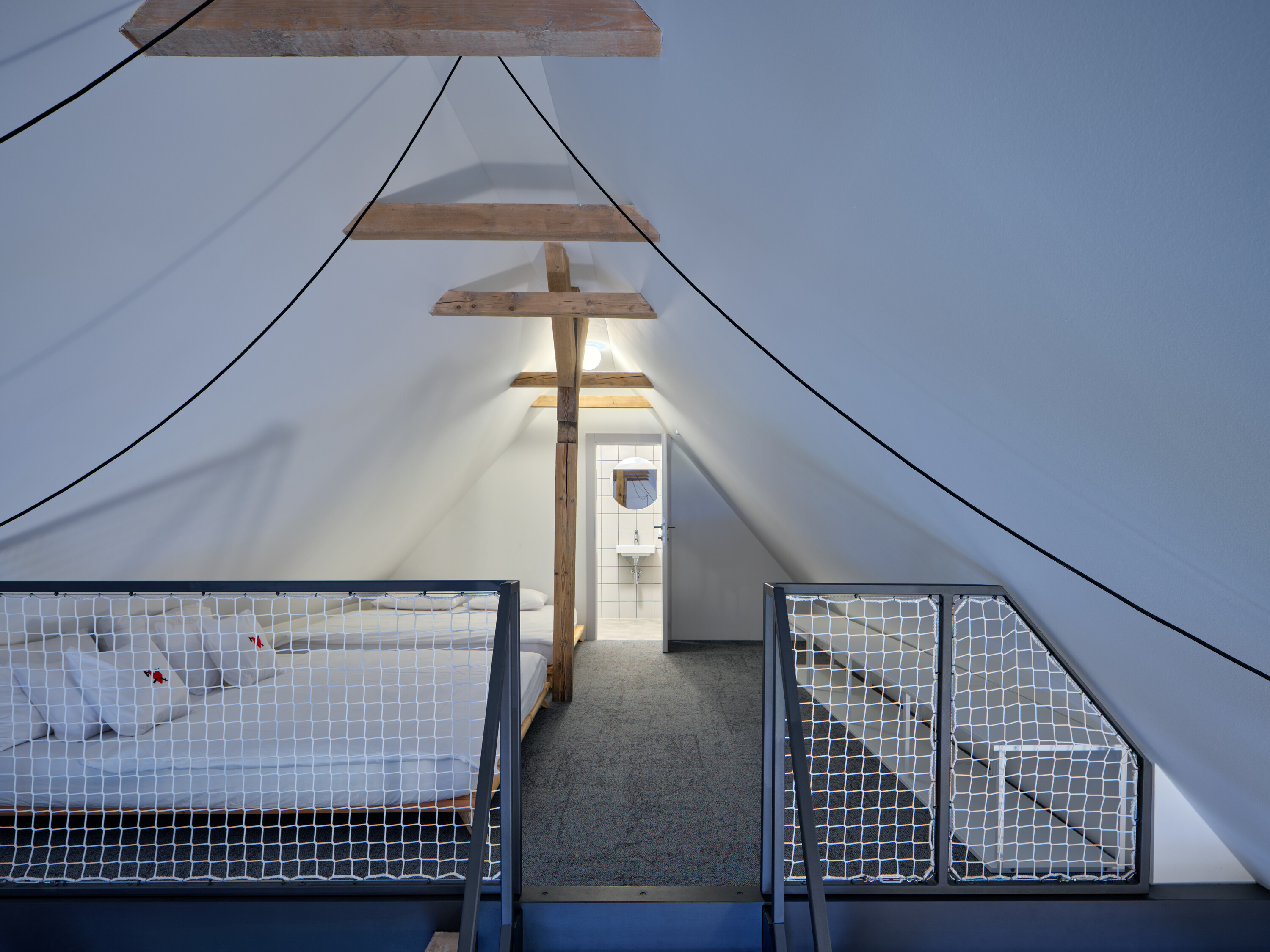 공사 중 발견된 사실은 프로젝트의 성격을 더욱 분명하게 했다. 2층과 3층에 기존 마감 아래 감춰져 있던 전통 통나무 구조가 드러난 것이다. 이 정도 규모의 목조 구조는 크르코노셰 지역에서도 매우 드문 사례로, 팀은 이를 새로운 디자인의 핵심 요소로 보존하고 과감히 노출시키기로 했다. 전시 공간으로 재탄생한 상층부는 이 목구조의 장인적 디테일을 고스란히 드러내며, 다락의 객실 역시 드라마틱한 목재 트러스가 실내 풍경을 형성한다. 반면 하층부의 조적조 벽체는 새로운 콘크리트 증축부와 결합되며 과거와 현재의 재료적 대비를 보여준다.