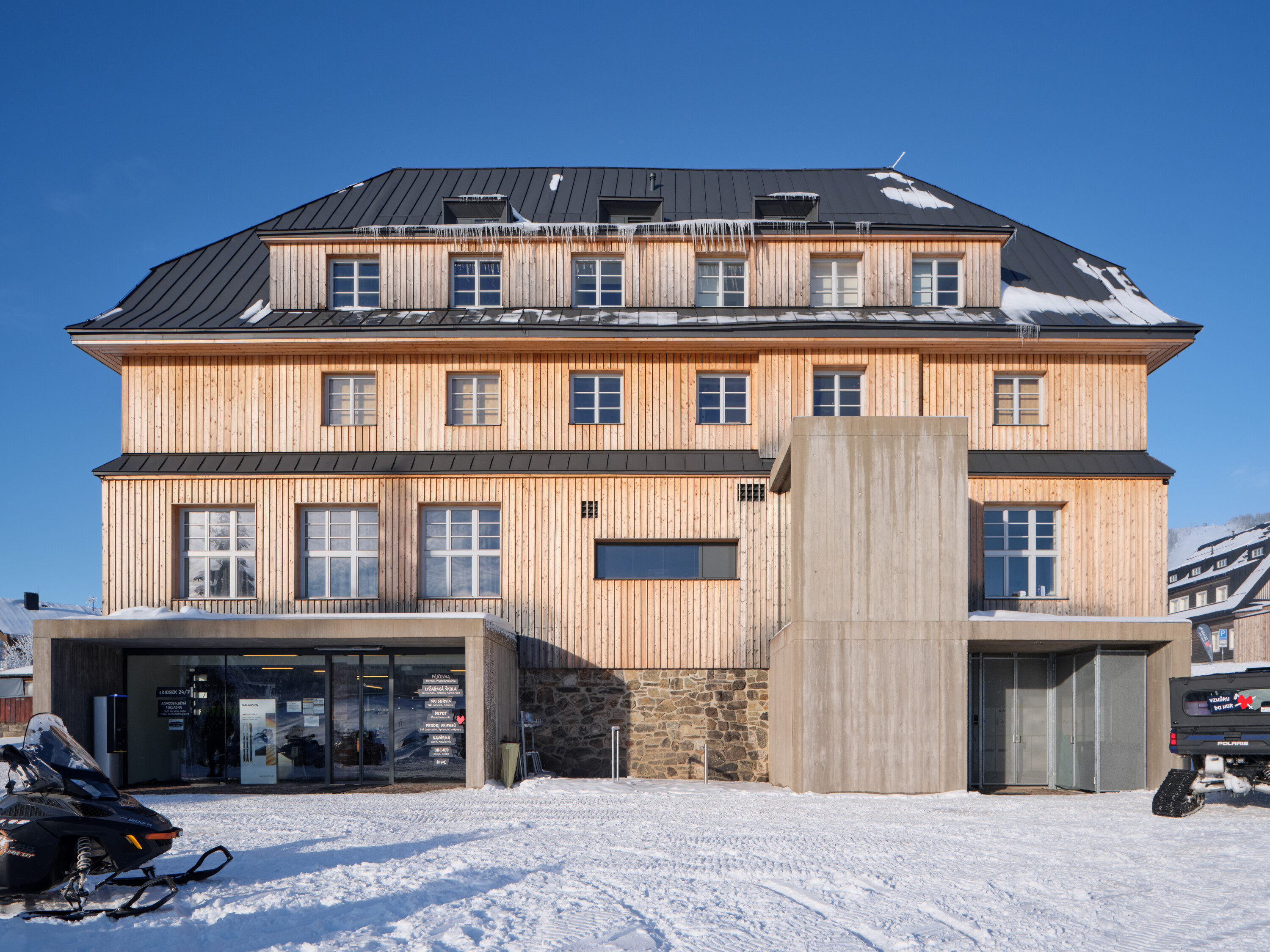 1928년에 건축된 옛 호르엑 호텔은 한때 여행객을 위한 숙박시설로 기능했지만, 이번 프로젝트를 통해 마을 일상과 직접 연결되는 복합 커뮤니티 센터로 완전히 새롭게 태어났다. 건물을 완전히 철거할 것인지, 혹은 보존을 전제로 재건축할 것인지에 대한 논의는 ‘기존과 새로운 것의 균형’이라는 결론에 도달했고, 결과적으로 원형을 유지한 재구축 + 콘크리트 증축부라는 형태가 채택되었다.