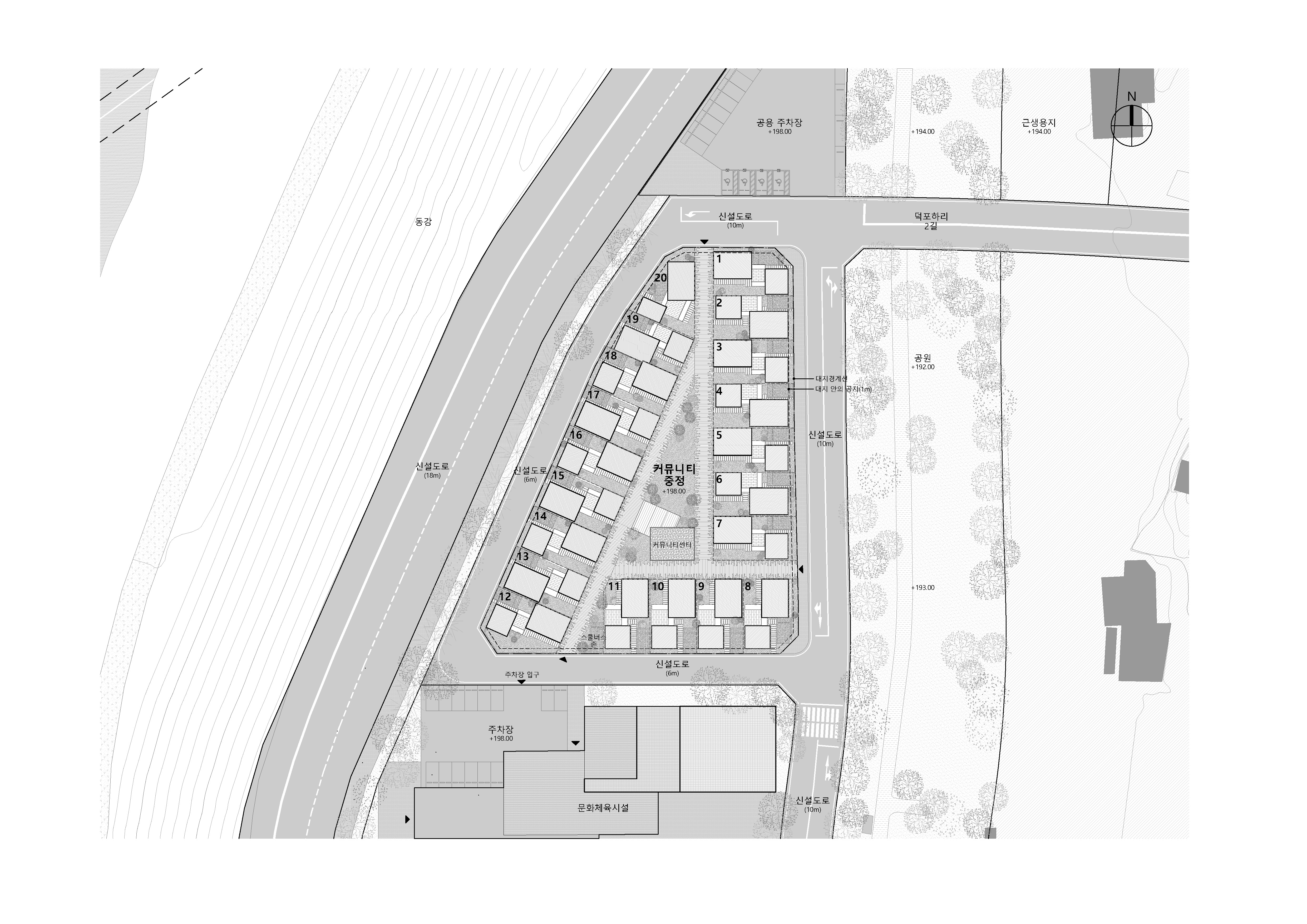 서로 어긋나 배치된 주거모듈들은 그 사이를 통해 동강으로의 시야와 공기의 흐름을 제공하고 그 틈에 위치한 각 주호의 정원은 낮은 울타리를 통해 안전하고 아늑한 커뮤니티 영역과 연결된다. 커뮤니티 영역과 맞닿은 각 주호의 별채는 어린이 놀이방, 공부방, 작업실 등 마을의 필요를 위한 준공공공간으로도 사용될 수 있다.