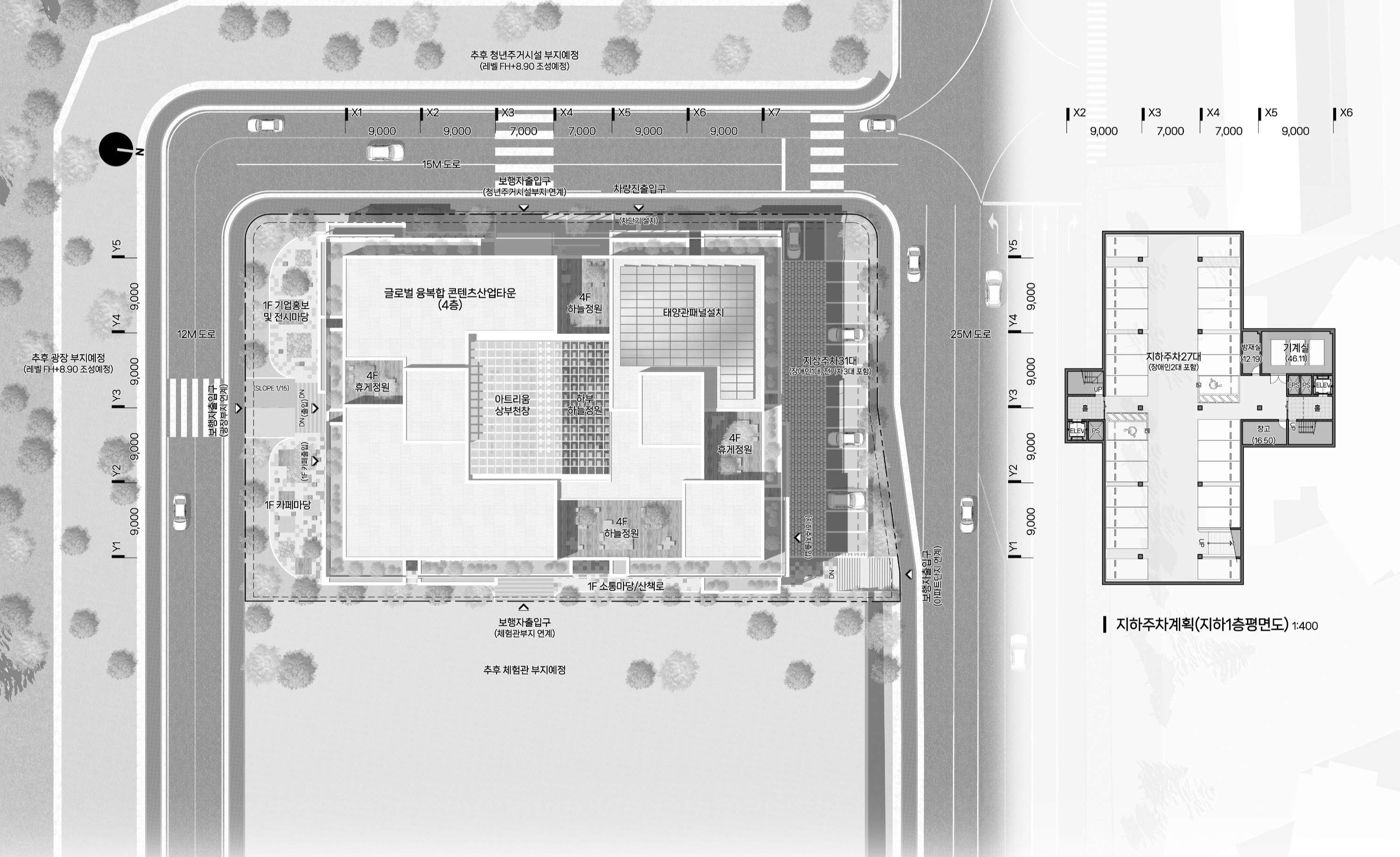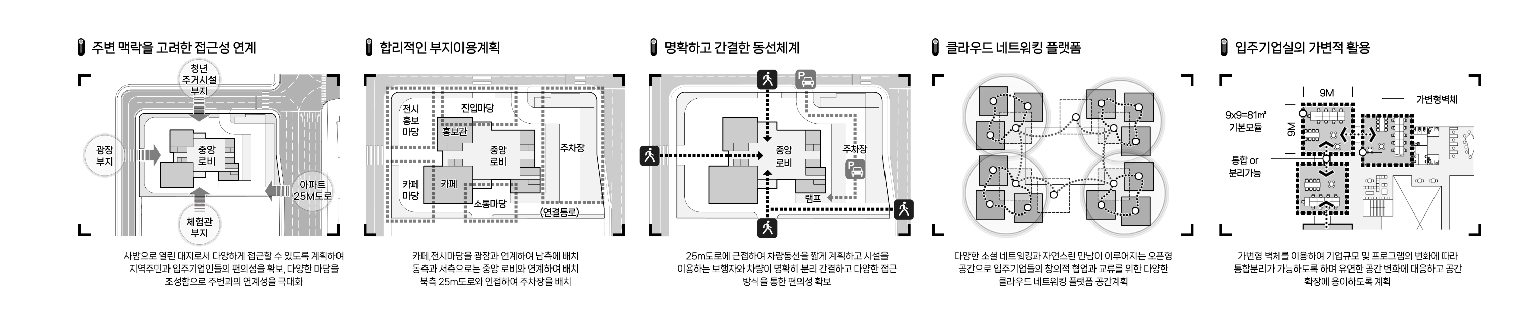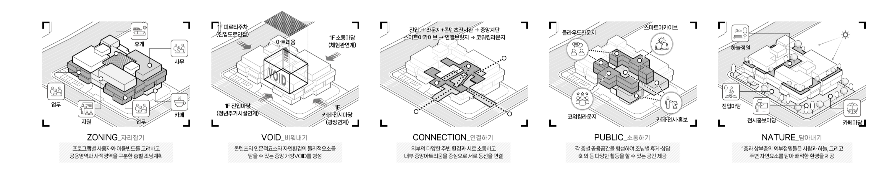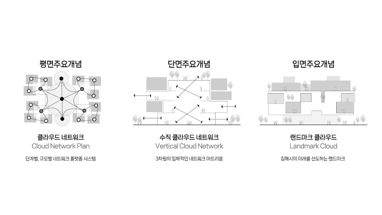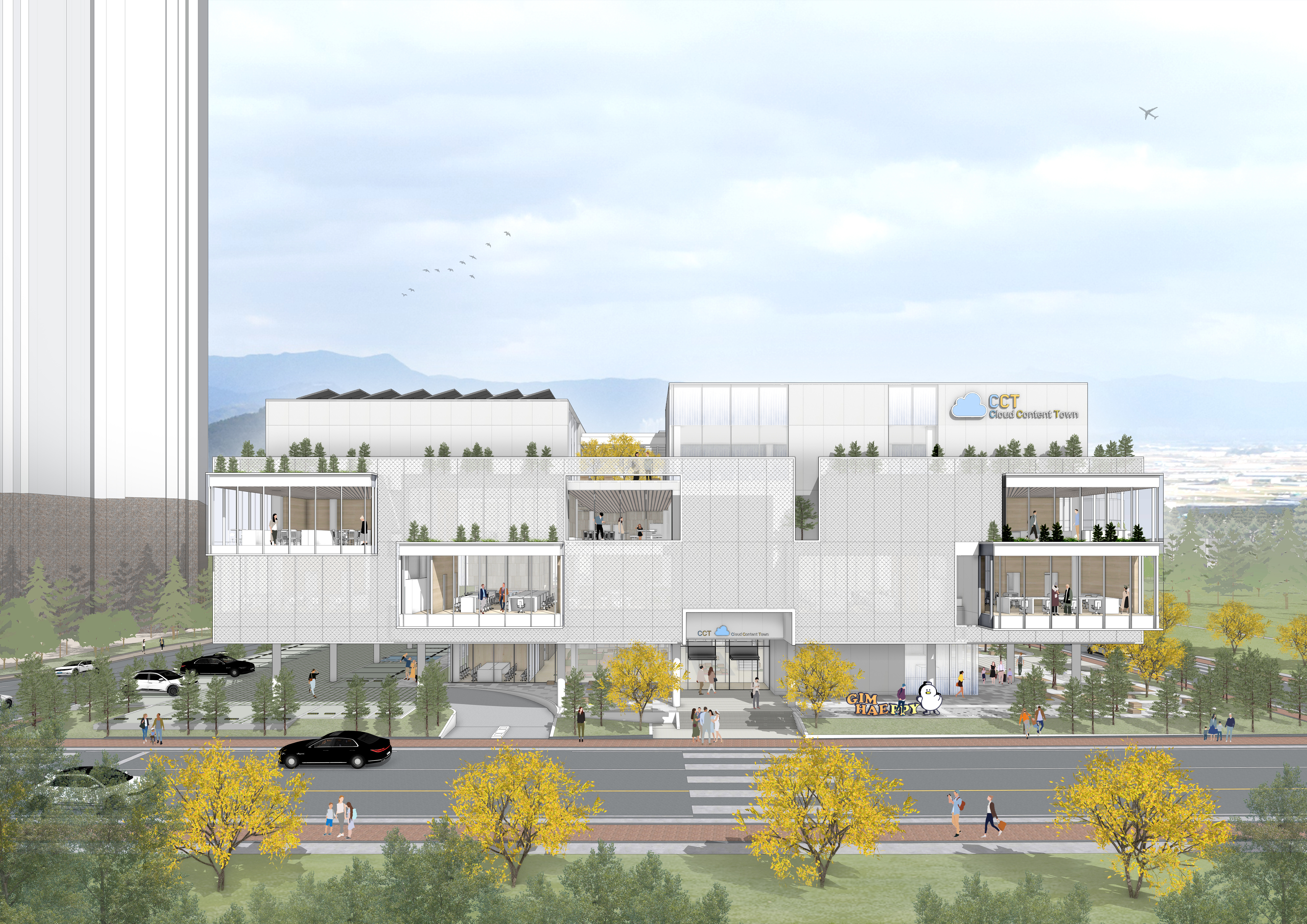핵심 키워드는 클라우드(Cloud)’로 디지털 세상의 정보가 구름처럼 모이고 흩어지듯, 창의적인 생각들이 자유롭게 융합되는 공간을 만들고자 한다. 클라우드라는 개념은 평면과 단면, 입면 디자인 전체를 관통하는 주제로 가장 중요한 것은 소통의 위계이다. 개별 기업들이 사용하는 단위 공간 사이사이에는 소규모 소통 공간인 클라우드 라운지를 배치해 우연한 만남을 유도했다. 이 공간들은 다시 코워킹 라운지스마트 아카이브 등과 같은 중규모 소통 공간으로 확장되며, 최종적으로는 건물의 중심을 관통하는 거대한 아트리움에서 하나로 연결된다. 이처럼 작은 구름들이 모여 거대한 네트워크를 형성하듯, 공간의 위계가 자연스럽게 연결되는 입체적 클라우드 플랫폼을 제안했다.