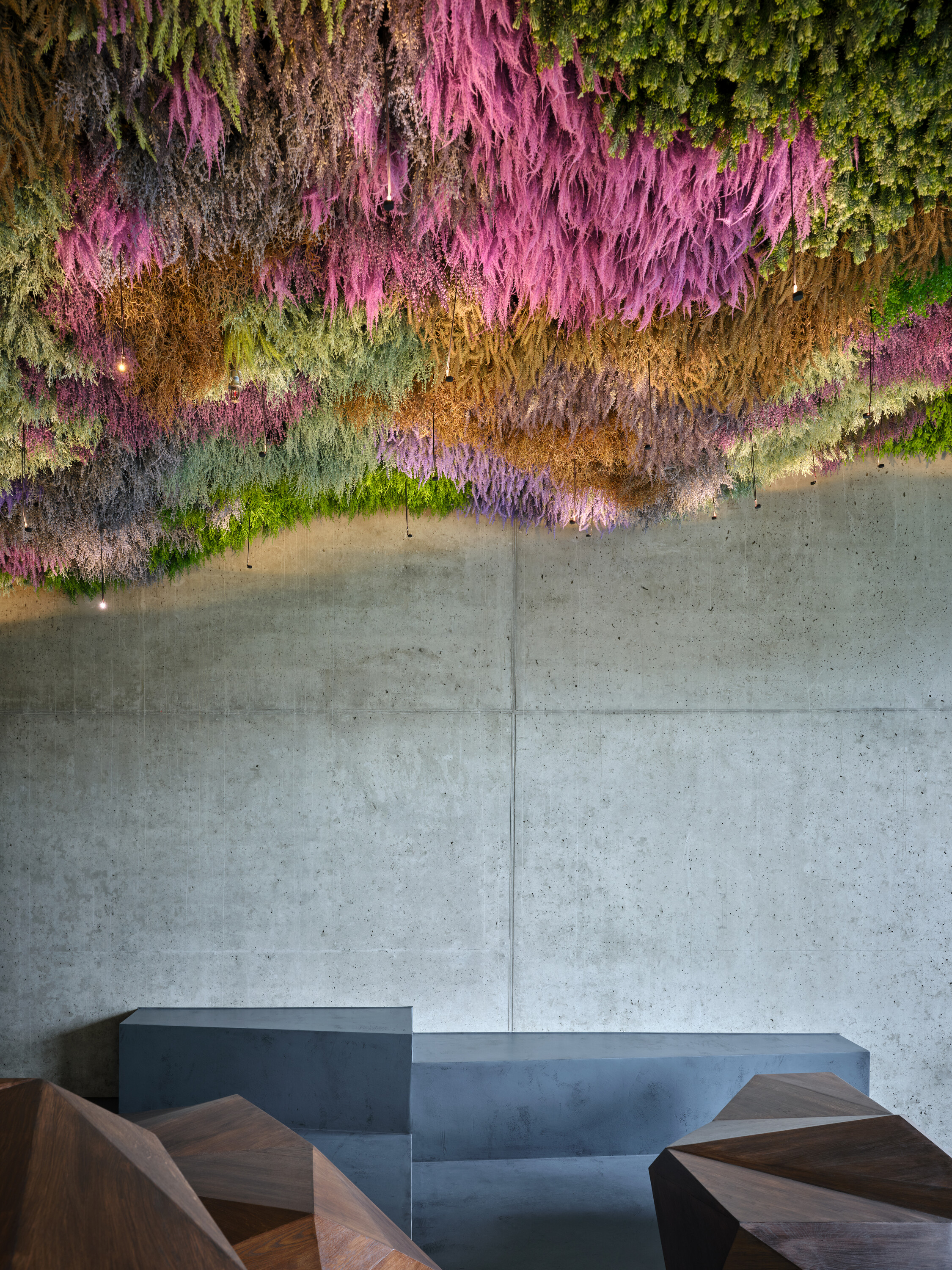 디자인의 출발점은 골프의 발상지이자 거친 자연 풍광으로 유명한 스코틀랜드 하이라랜드다. 건축가는 테마 장식이 아닌, 자연의 구조·색·기류를 실내에 구현하는 데 집중했다. 천장에는 헤더(heather) 군락을 연상시키는 설치물이 파도처럼 이어지며 공간 전체에 빛과 그림자의 결을 만든다. 바닥에는 단차를 둔 플랫폼과 다섯 개의 ‘돌’ 오브제가 놓여, 풍경적 모티프와 디자인 요소가 자연스럽게 연결된다. 콘크리트, 목재, 짙은 녹색톤으로 이루어진 절제된 재료 구성은 실내 풍경에 차분한 리듬을 부여하며, 사용자 경험을 위한 배경으로 조용히 존재한다.