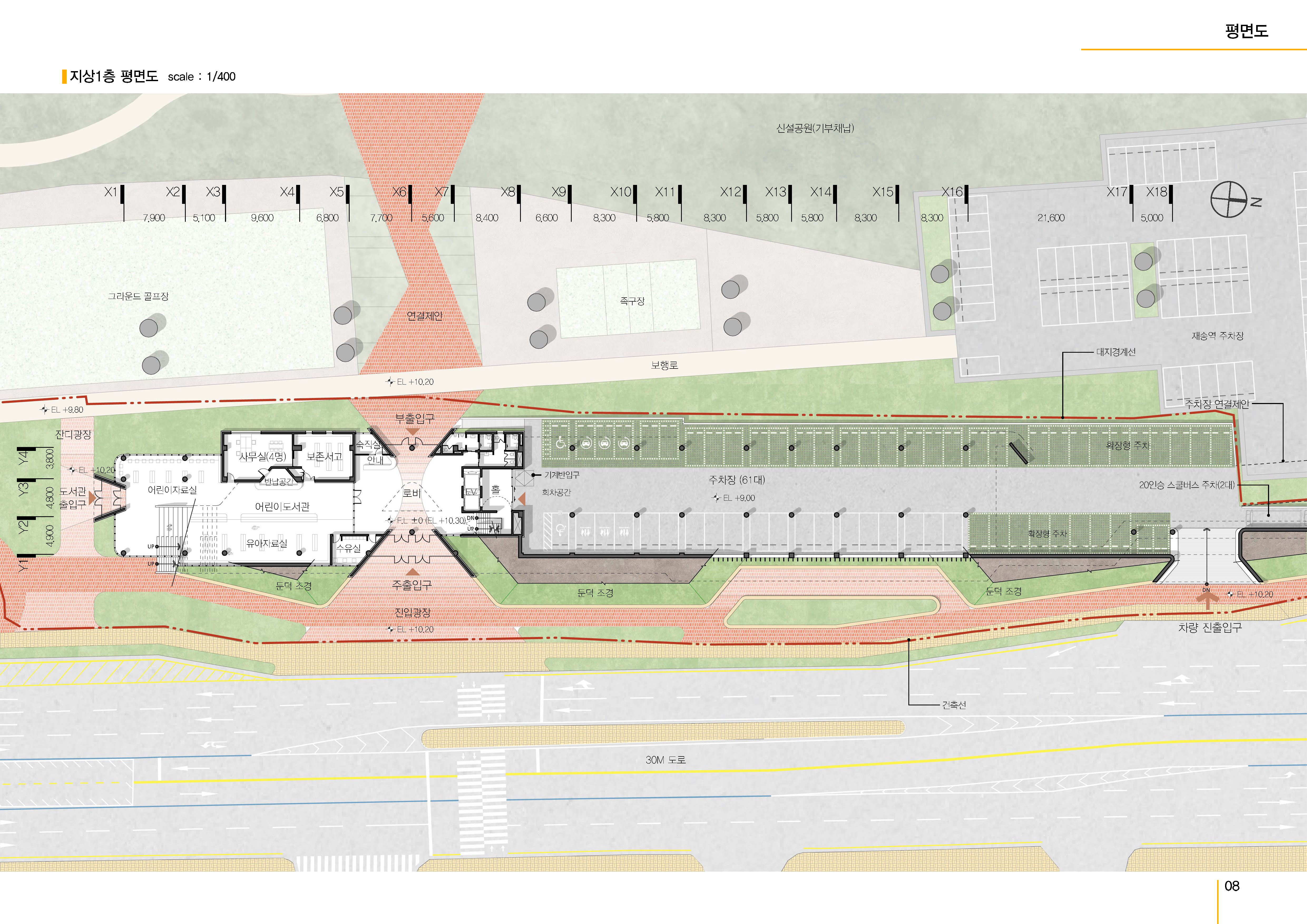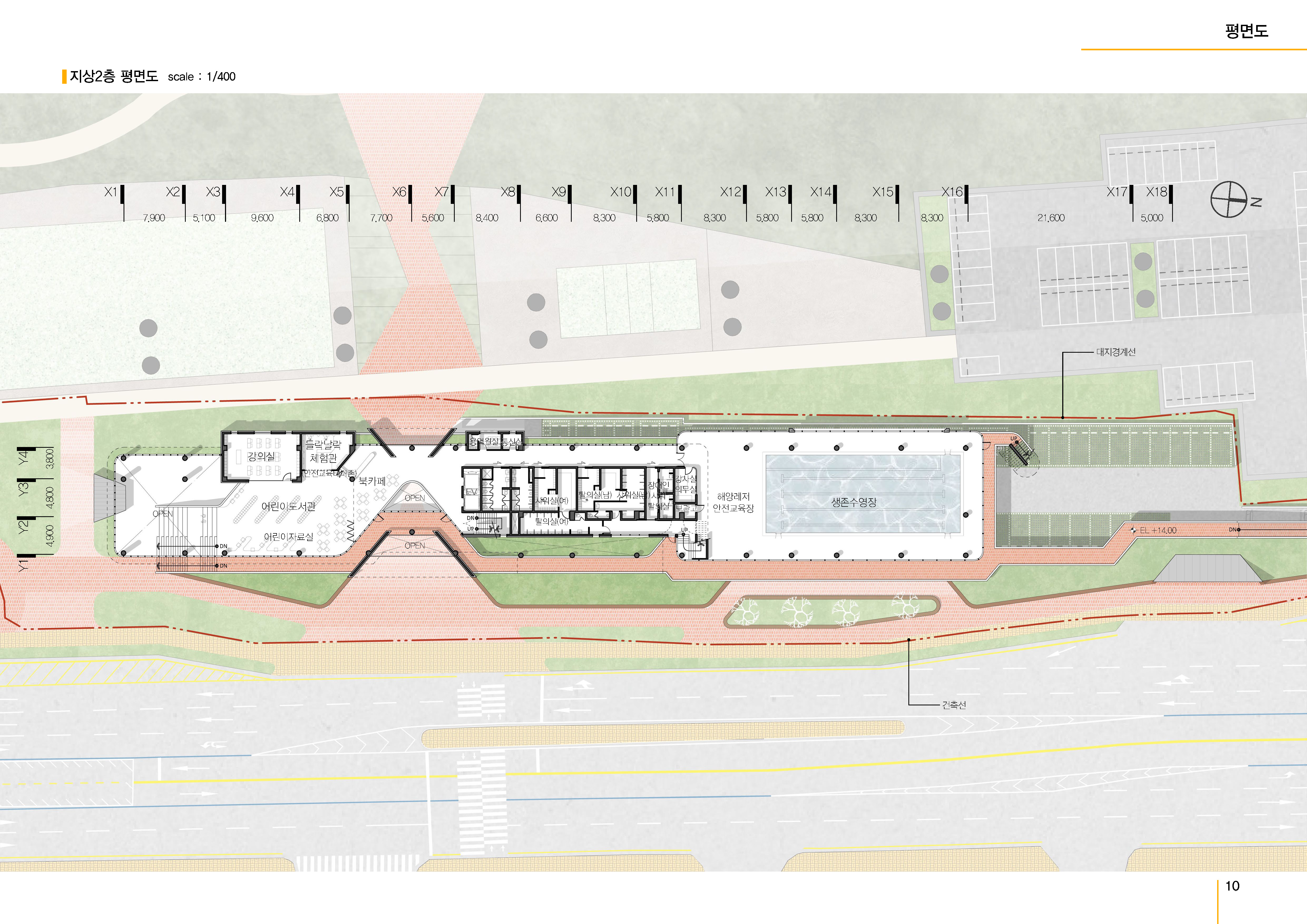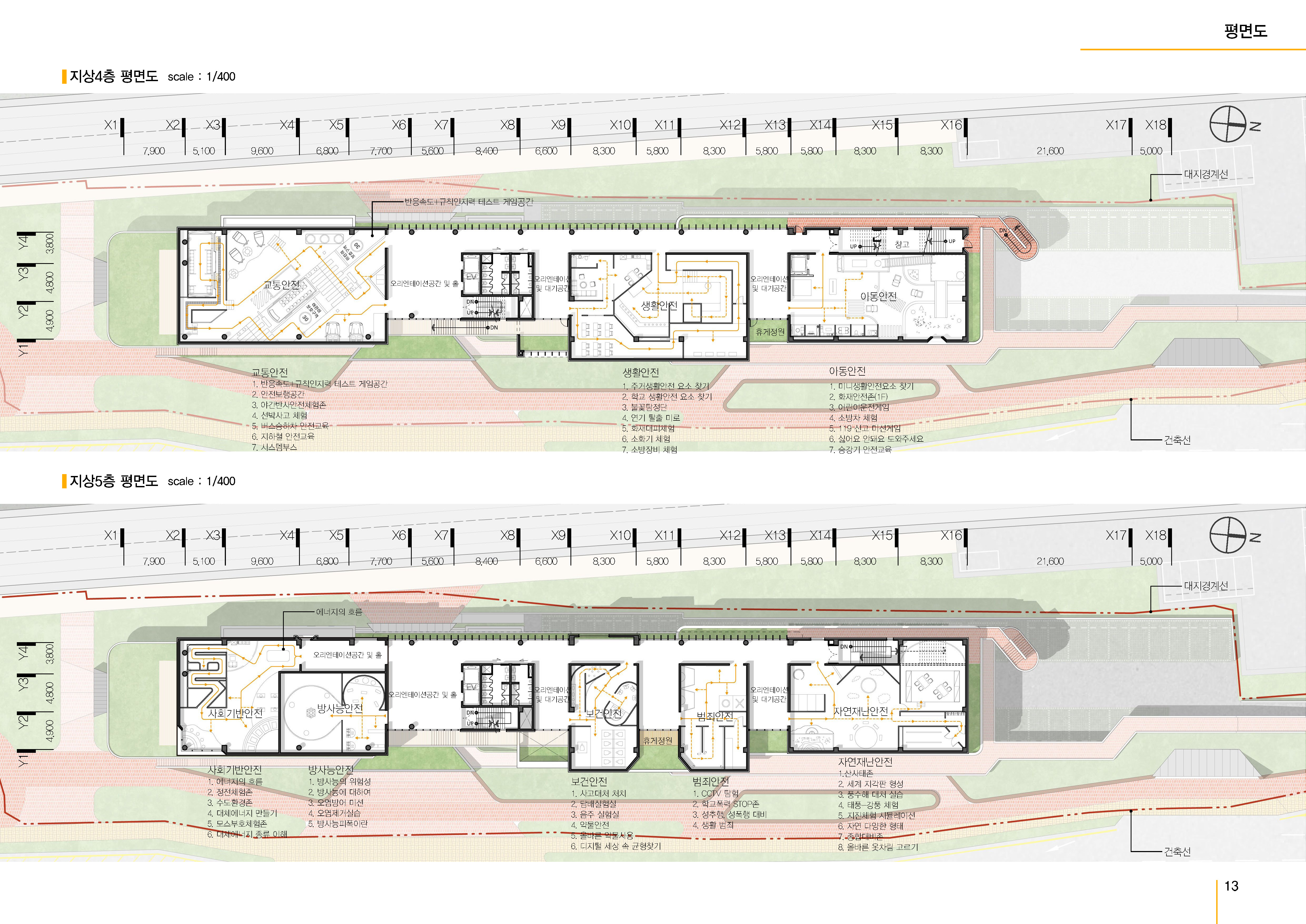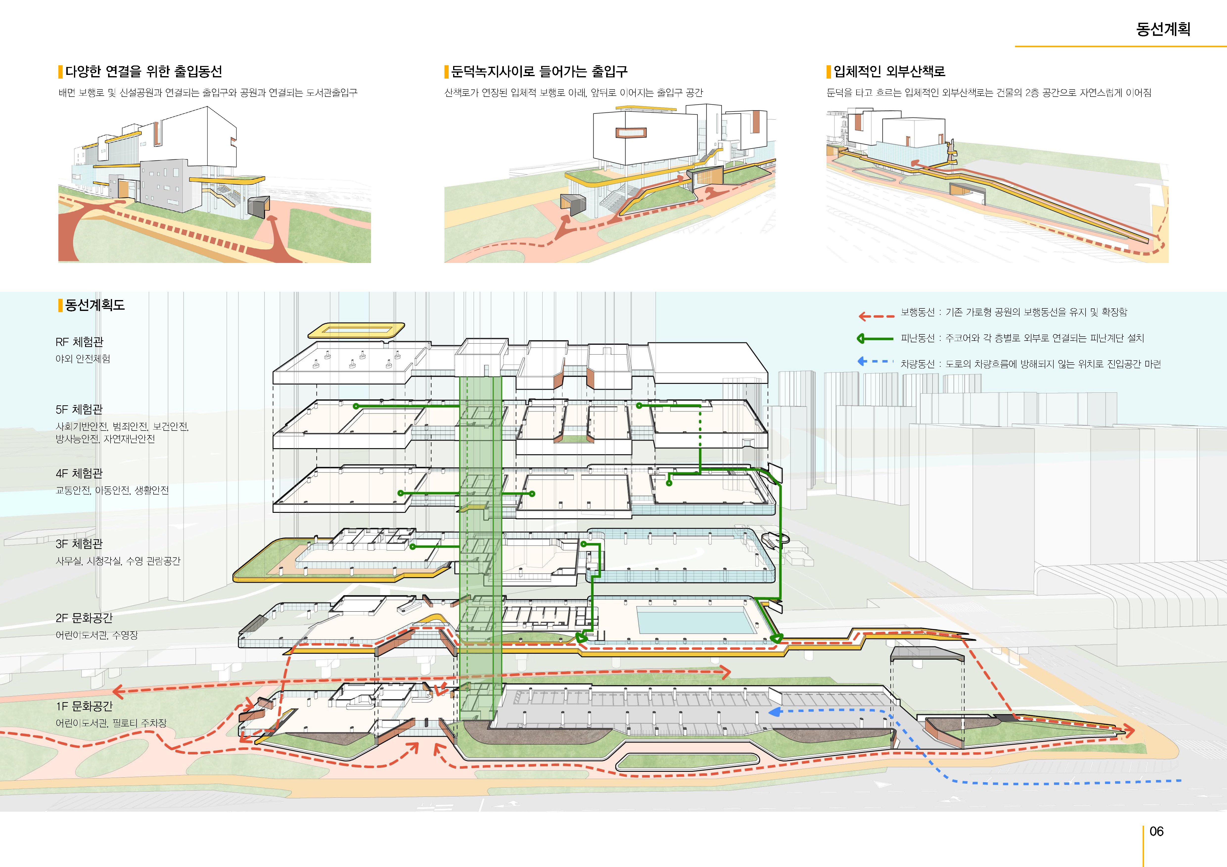 이런 상황속에 저층부의 산책하다 만나게 되는 어린이 도서관은 열린 공간화 시켜 산책로를 따라 위아래로 움직이고, 숲속에서 책을 읽는 공간으로 느껴지게 될 것입니다. 필로티주차장은 둔덕으로 가려져 공원속에서 주차장이 드러나지 않게 하고, 그 위 많은 물을 담게 되는 수영장을 배치합니다. 중간층에는 관리를 위한 사무공간과 다목적으로 사용될 시청각실을 배치합니다. 최상층에는 이 시설의 핵심시설인 안전체험관을 독립적으로 배치하고, 옥상의 야외까지 체험의 공간으로 활용하였습니다. 그리고 각 체험공간 앞에 대기 및 오리엔테이션 공간을 마련하여 투어동선들의 간섭이 일어나지 않도록 고려하였습니다.