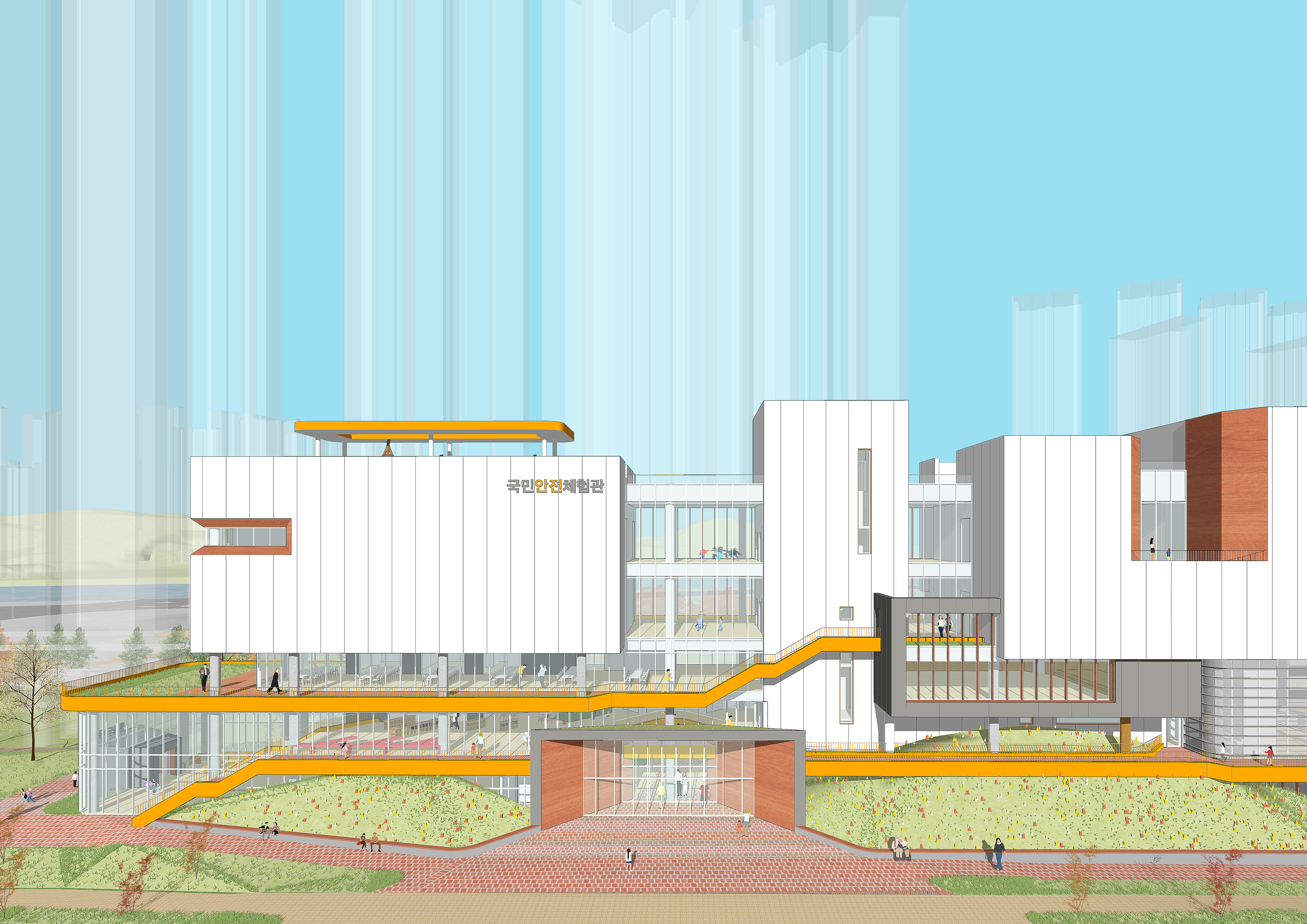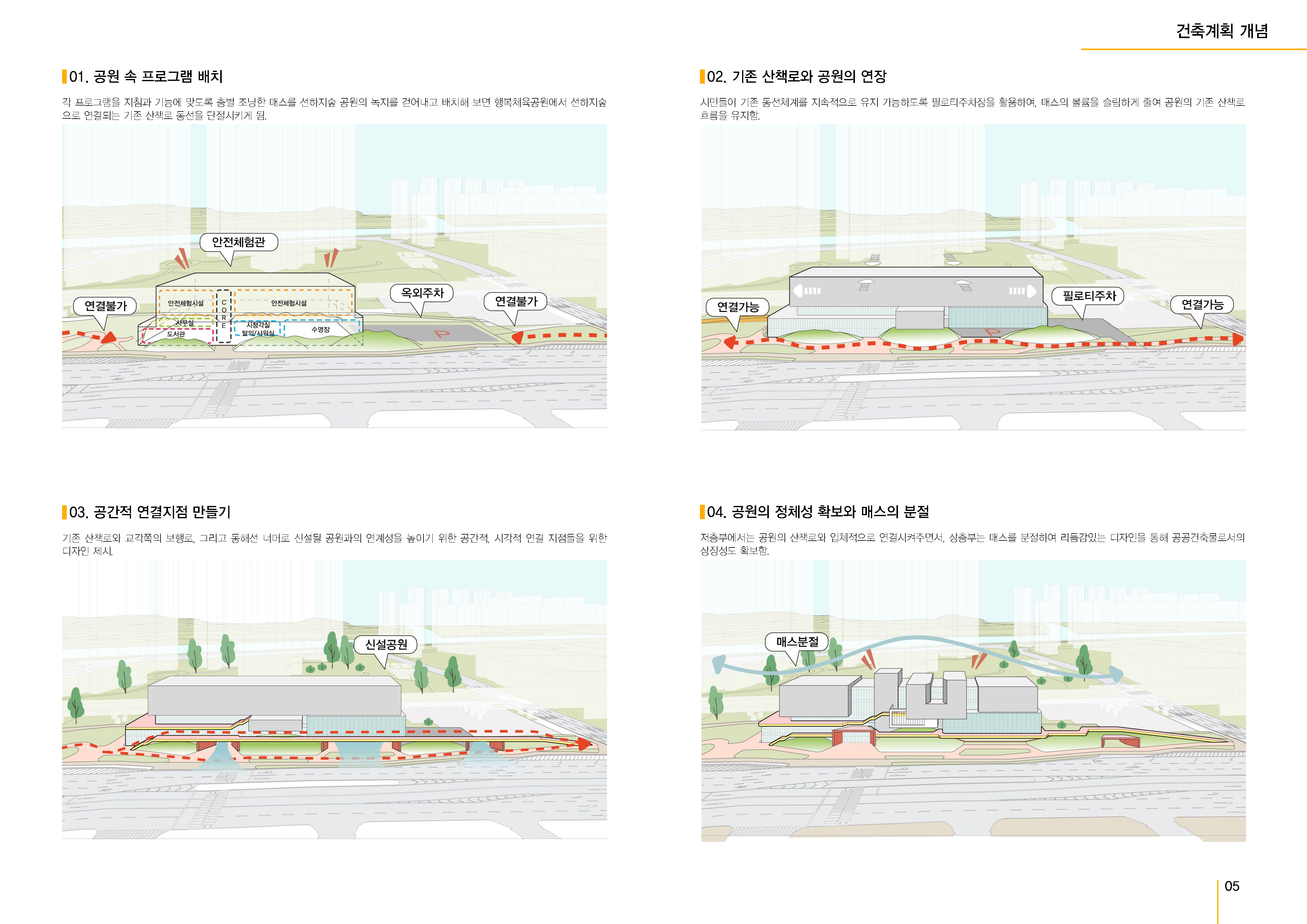 본 시설은 동해선의 센텀역에서부터 원동역까지 이르는 행복체육공원의 중심공간에 건립됩니다. 이런 가로형 공원속에 안전체험관이란 시설이 들어가게 되면 어떤 제스처를 취해야 할지가 가장 고민 되는 지점 중에 하나였습니다. 이 속의 산책로는 공원을 따라 이어져가고 있는 상황입니다. 본 건물은 이런 공원 속에서 갑자기 건물과 맞닥뜨리는 상황을 최소화 하고자 둔덕조경 뒤로 한 발짝 물러나 있습니다. 그러면서 산책로는 둔덕을 끼고 이지고, 건물을 타고 흘러 2층 공간으로 자연스럽게 연결되기도 합니다. 또한 가로형 공원속에 들어가는 안전체험관은 대지 서측에 신설되는 공원과의 연결을 막지 않고, 공원의 흐름을 방해하지 않는 방식으로 점유되어야 할 것입니다. 따라서 가로형 공원이 가지는 특성과 산책로 동선을 유지할 수 있도록 최대한 슬림한 방식으로 볼륨을 만들려고 하였습니다. 이에 더해 배면 보행로와 신설공원과의 연계성을 강화하기 위한 방안으로 매스 내부를 파고들어가는 디자인 제시로 기존의 동선체계의 연결과 시각적 확장을 고려하였습니다. 최종적으로 산책로위에 들어설 안전체험관의 매스는 긴 교각과 함께 앞뒤로 배치되어 장방형 솔리드매스의 위압감이 커지게 될 것입니다. 이를 해결할 방법으로 매스를 분절하여 리듬감 있는 입면을 디자인하고, 가로형 공원의 정체성까지 확보하고자 합니다.