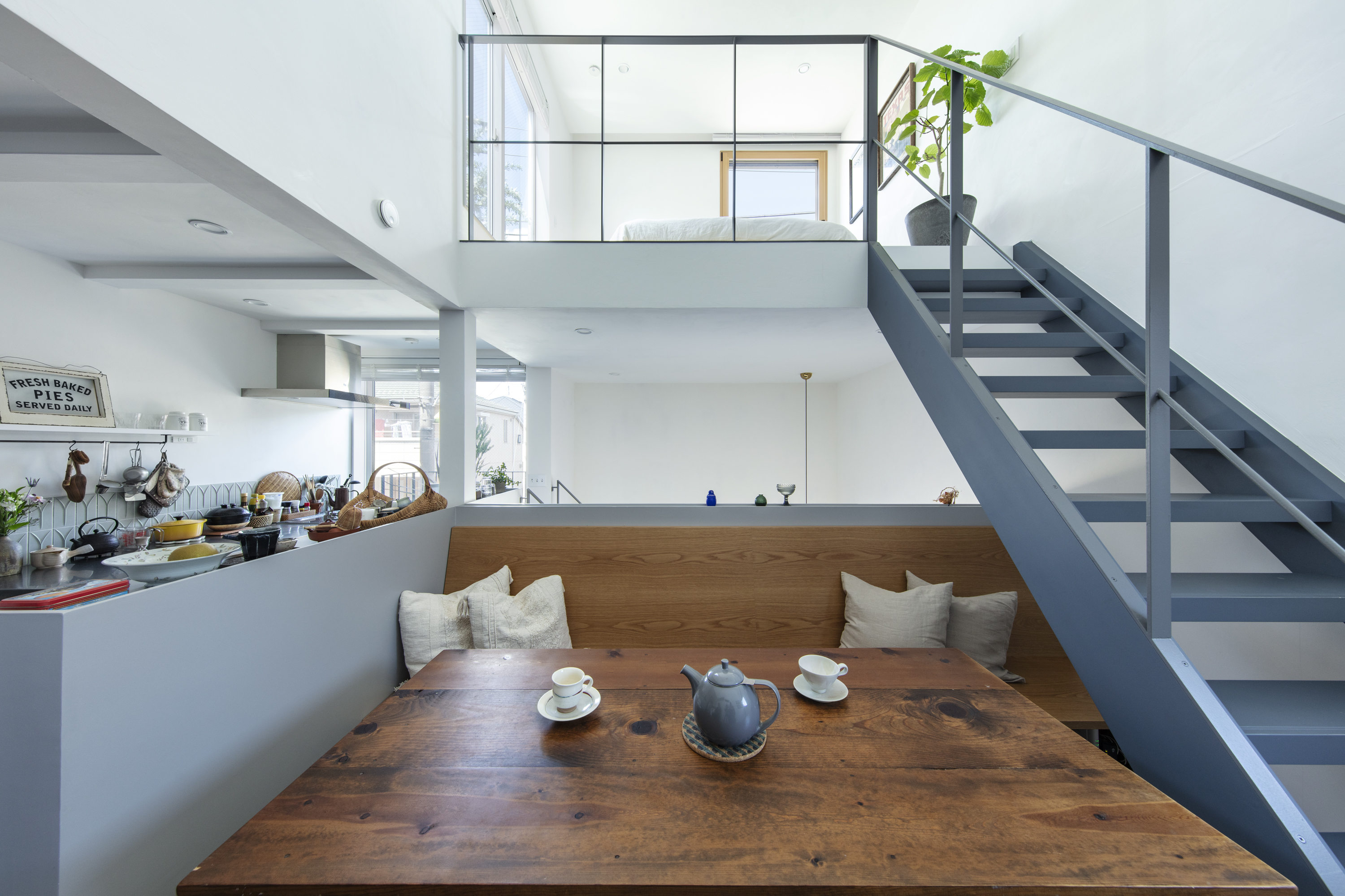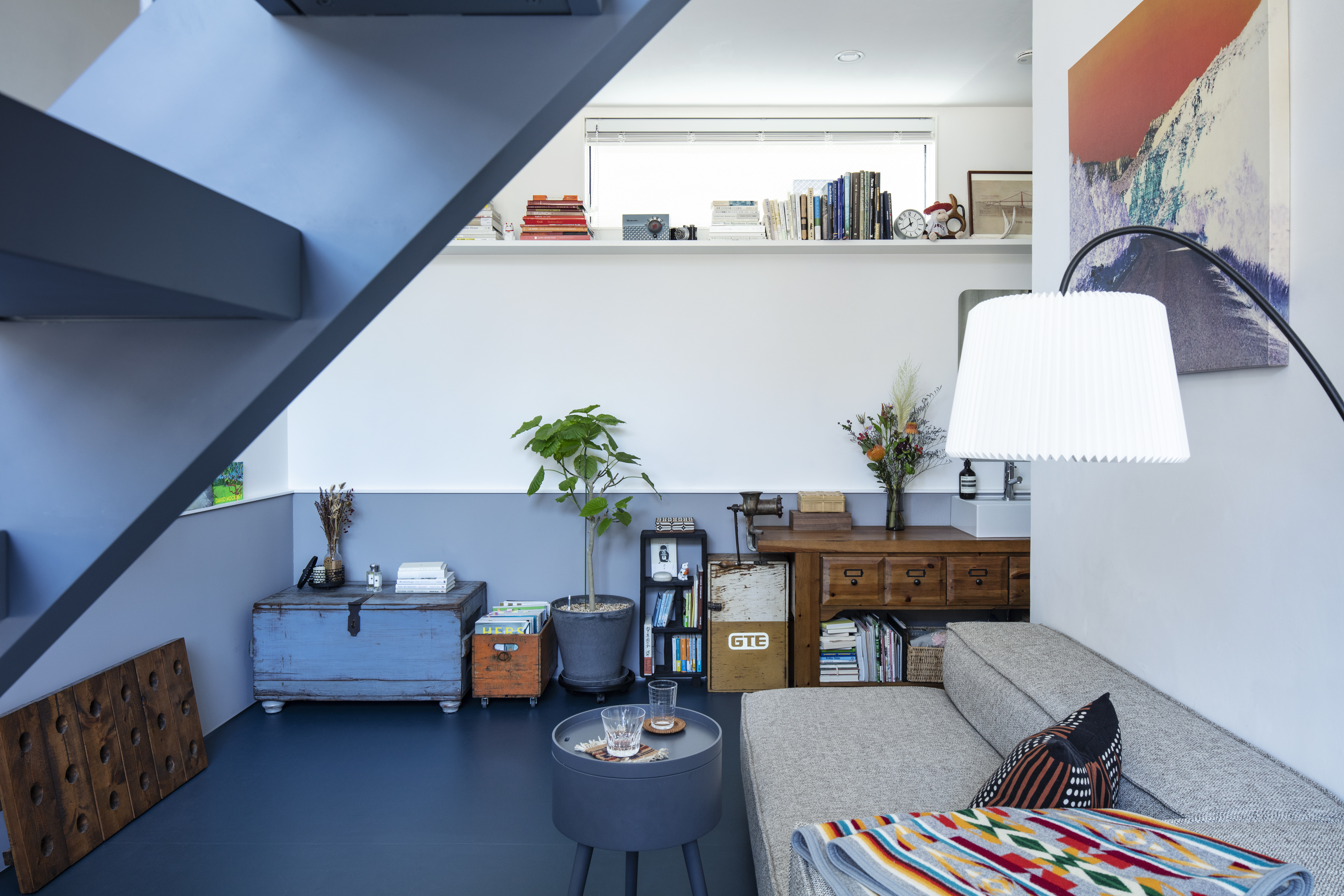 재료 선택 역시 일상의 감각을 고려했다. 벽과 천장은 습도 조절에 유리한 석회 미장으로 마감했고, 거실 바닥에는 관리가 용이한 리놀륨을 적용했다. 전체 색채는 화이트를 기본으로 하되, 부부가 선택한 네이비 그레이를 바닥, 계단, 빌트인 가구 곳곳에 반복해 공간의 리듬을 형성했다.