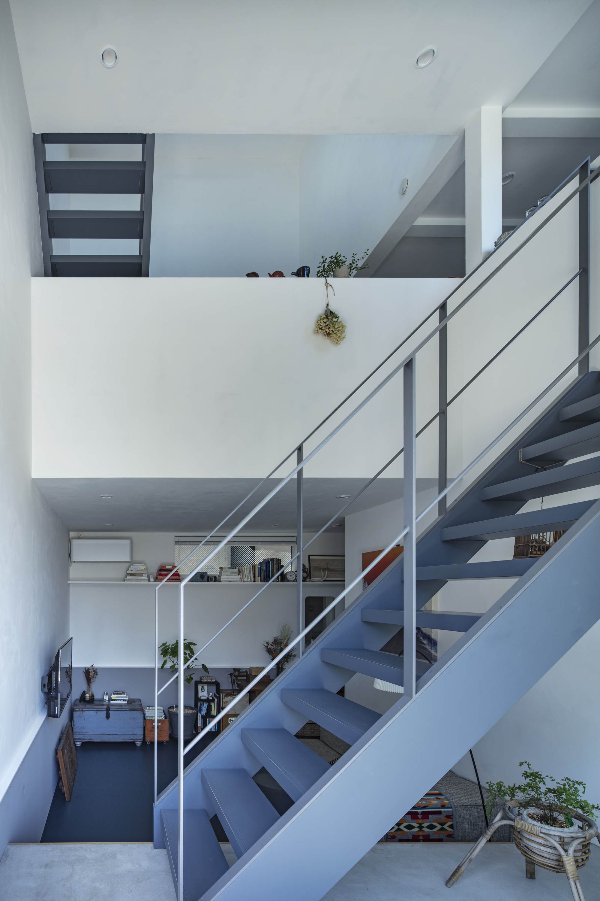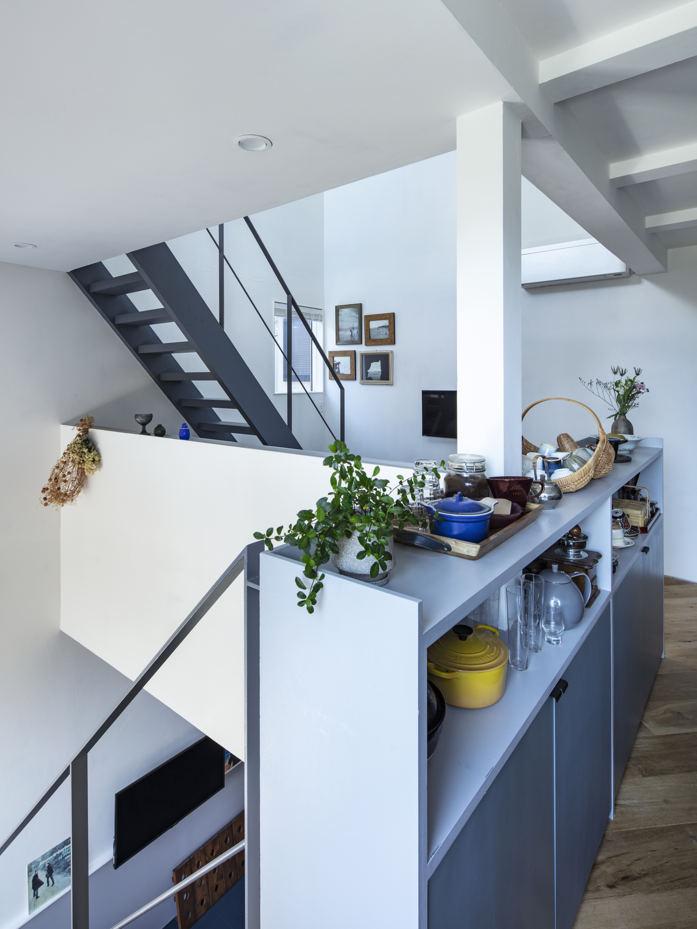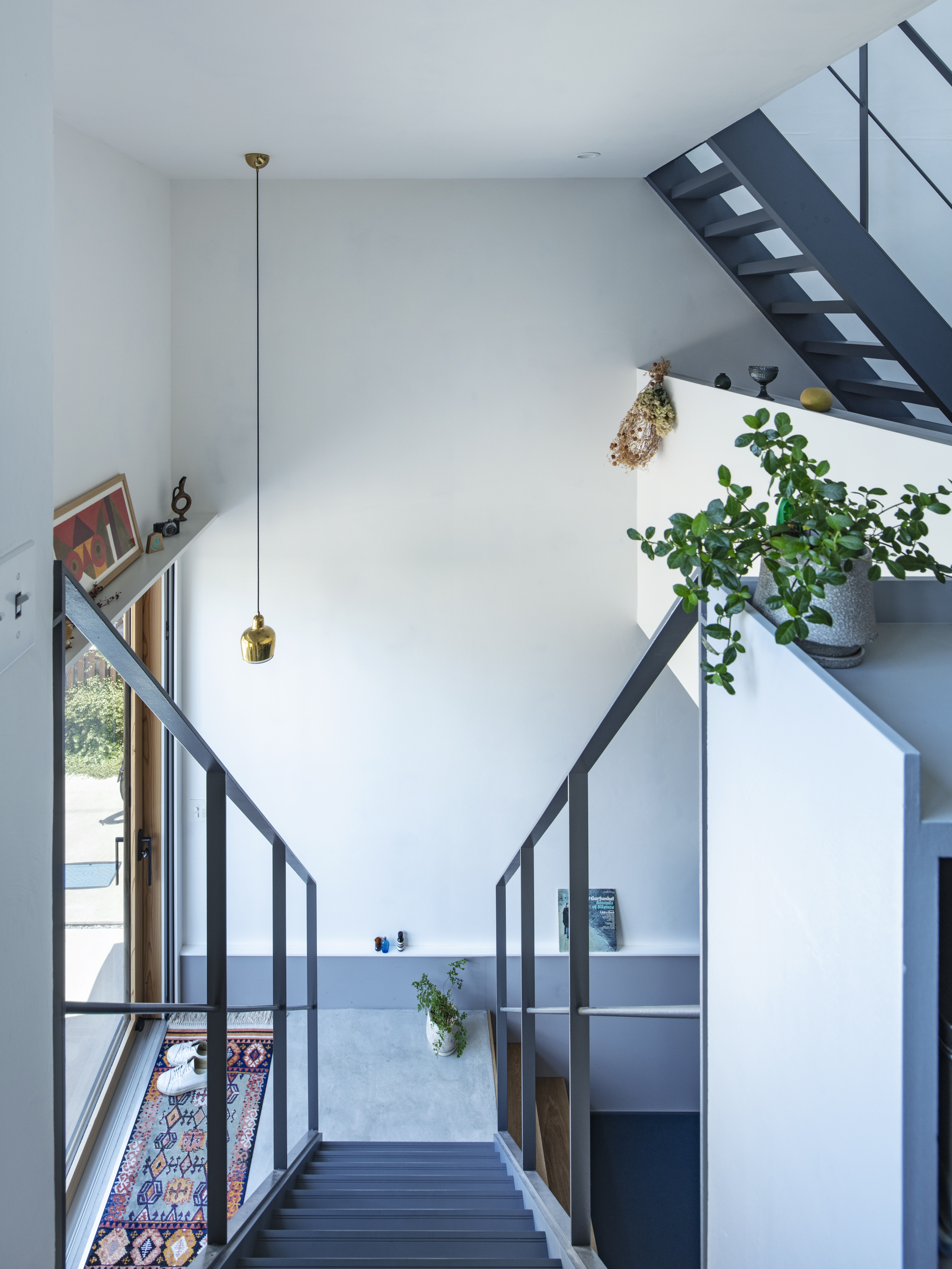재료 선택 역시 일상의 감각을 고려했다. 벽과 천장은 습도 조절에 유리한 석회 미장으로 마감했고, 거실 바닥에는 관리가 용이한 리놀륨을 적용했다. 전체 색채는 화이트를 기본으로 하되, 부부가 선택한 네이비 그레이를 바닥, 계단, 빌트인 가구 곳곳에 반복해 공간의 리듬을 형성했다.