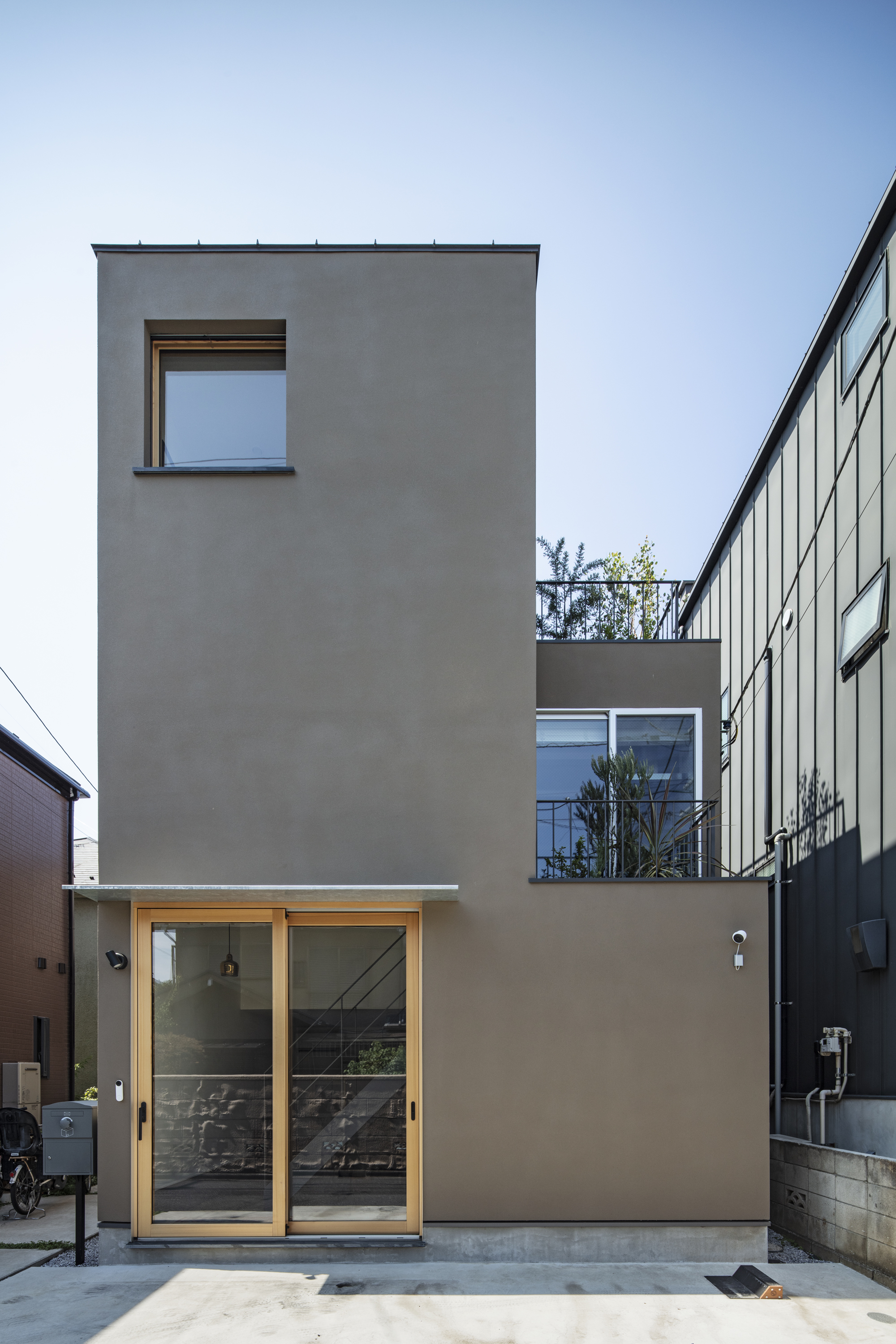 외부 환경을 자연스럽게 끌어들이기 위해 현관에는 목재 프레임의 대형 슬라이딩 유리문을 설치했다. 상부로 이어지는 개방형 계단과 마주하는 이 요소는 시선을 막지 않으면서도 실내와 외부 사이를 부드럽게 분리하는 장치다. 현관 바닥은 외부 지면보다 약 40cm 낮게 설정되어, 도심에 있으면서도 한 단계 내려앉은 듯한 차분한 감각을 만든다. 동시에 시선은 자연스럽게 들어 올려져 외부와의 연결감은 유지된다.