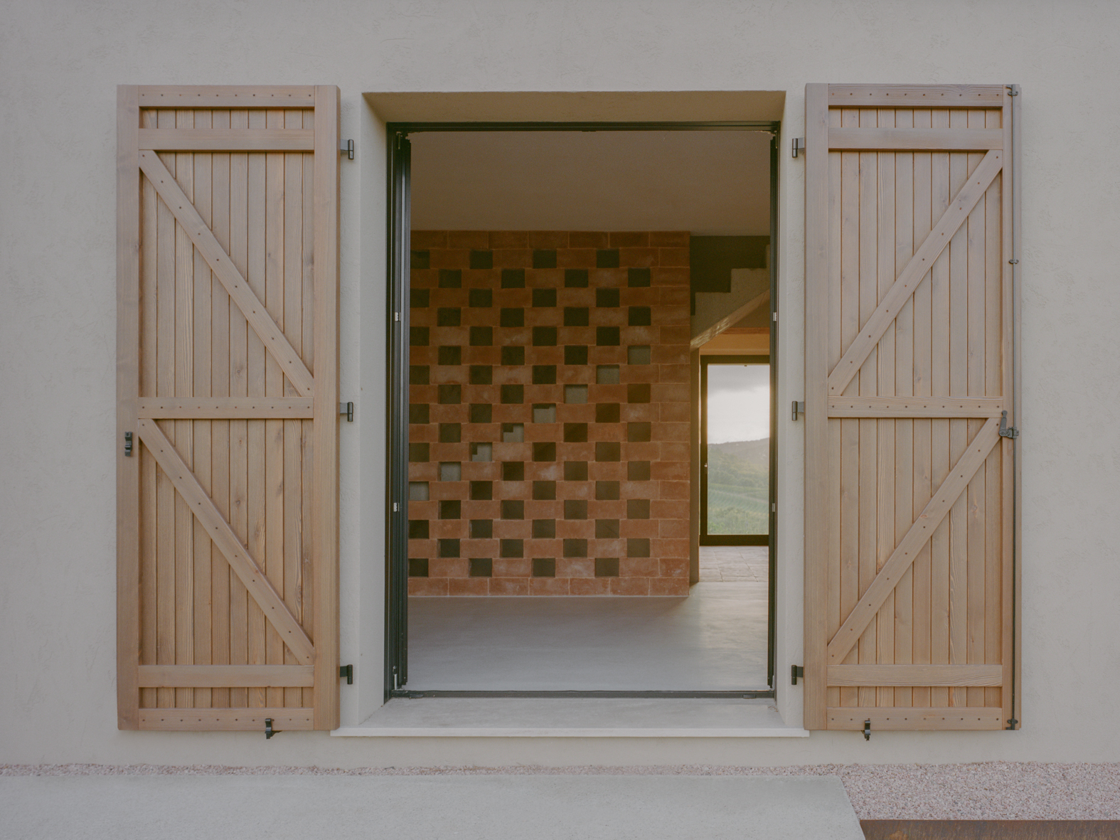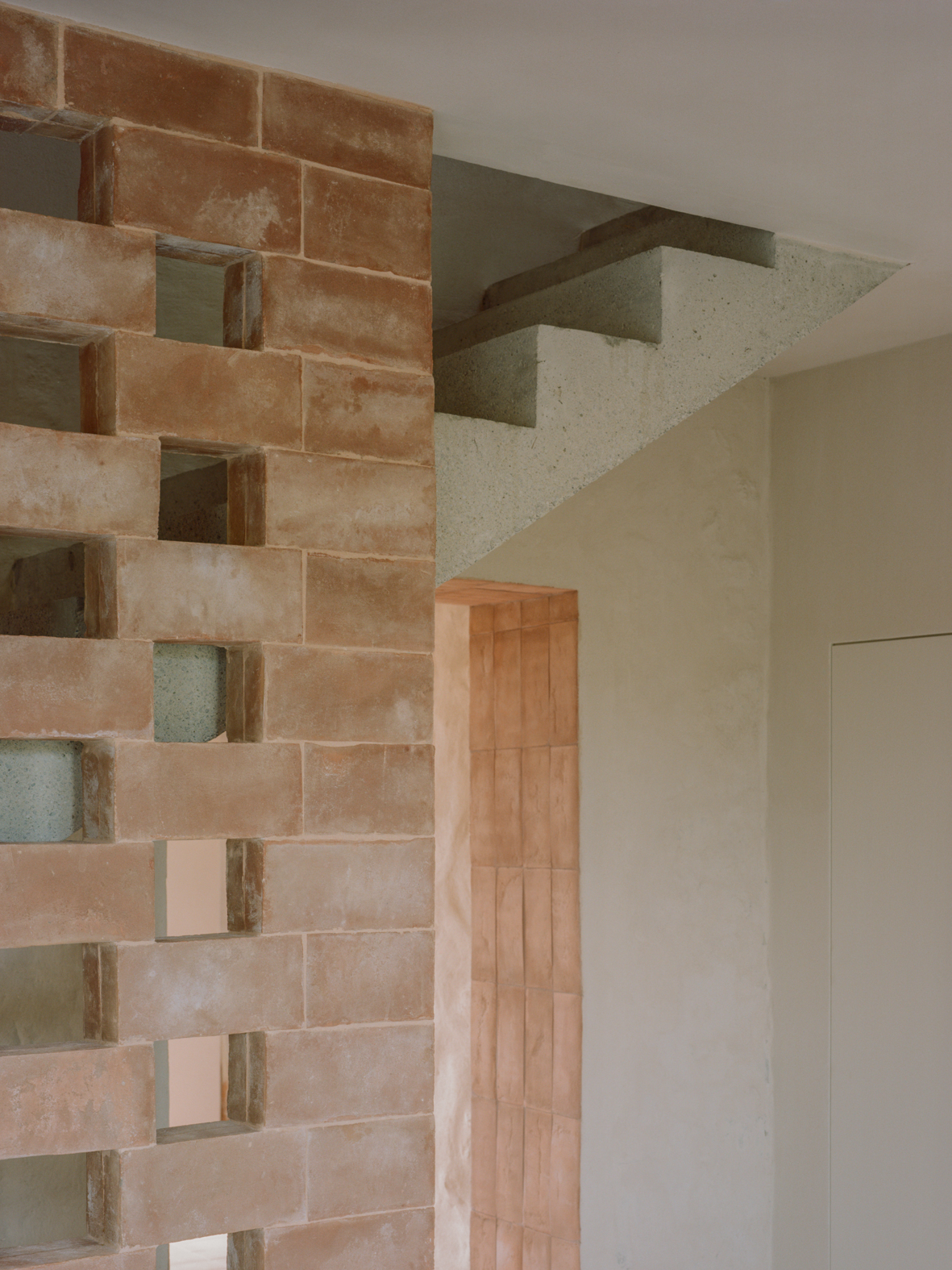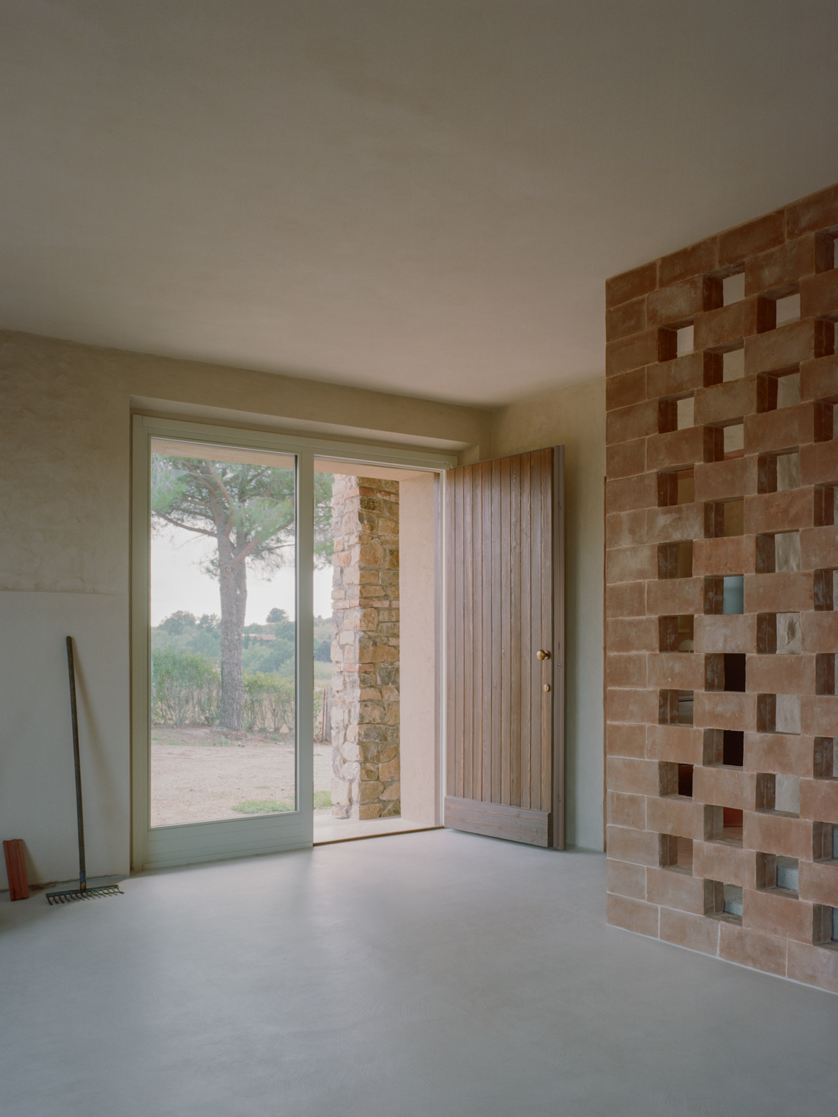 기존 석재 벽은 오래된 미장을 제거해 다시 드러냈고, 마구간 바닥에 사용되었던 테라코타 벽돌은 회수해 식당과 2층 침실의 벽 마감으로 재사용했다. 이 과정에서 테라코타와 콘크리트가 이 주택을 규정하는 핵심 재료로 자리 잡았다. 내부 통로와 일부 수평 면에는 은은한 분홍빛 톤이 적용됐고, 투스카니 농가에서 흔히 볼 수 있는 벽돌 격자벽은 새로 삽입된 내부 콘크리트 계단과 거실 사이를 나누는 요소로 사용됐다.