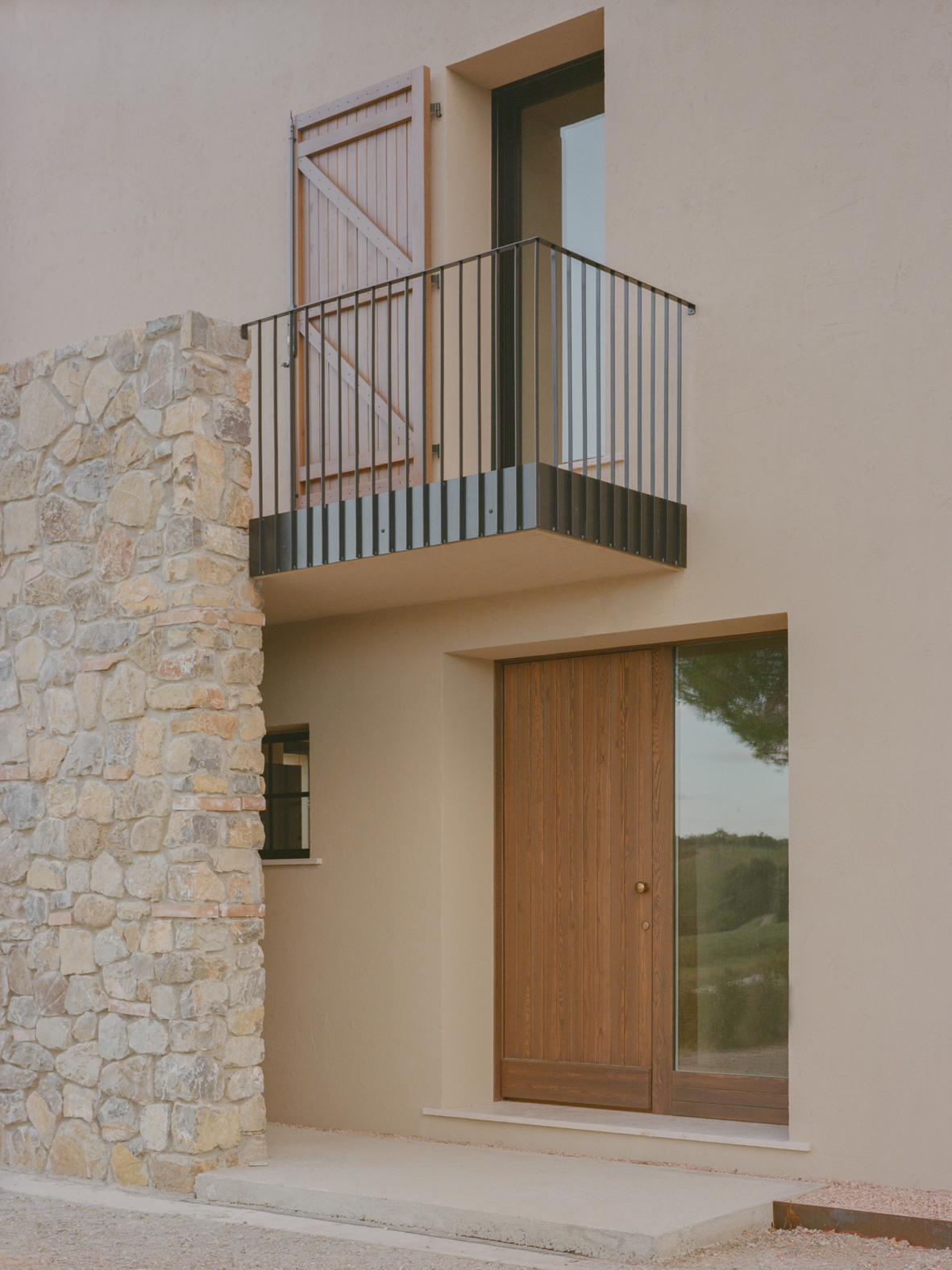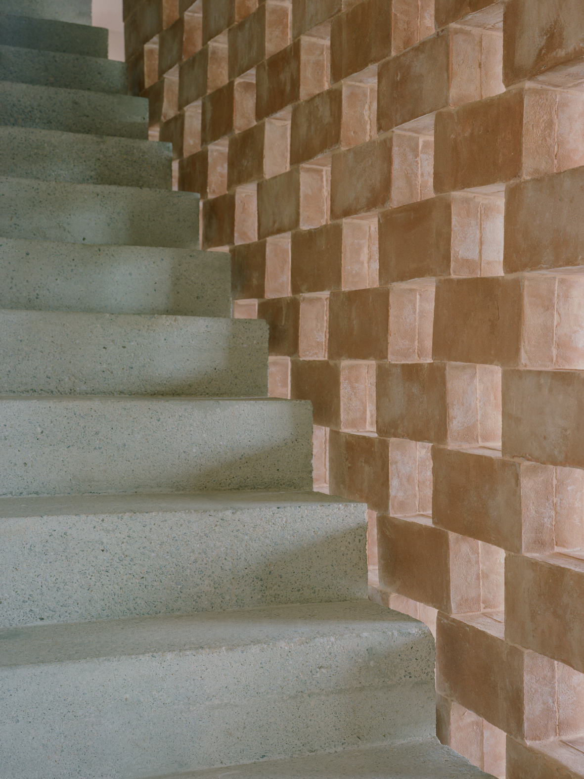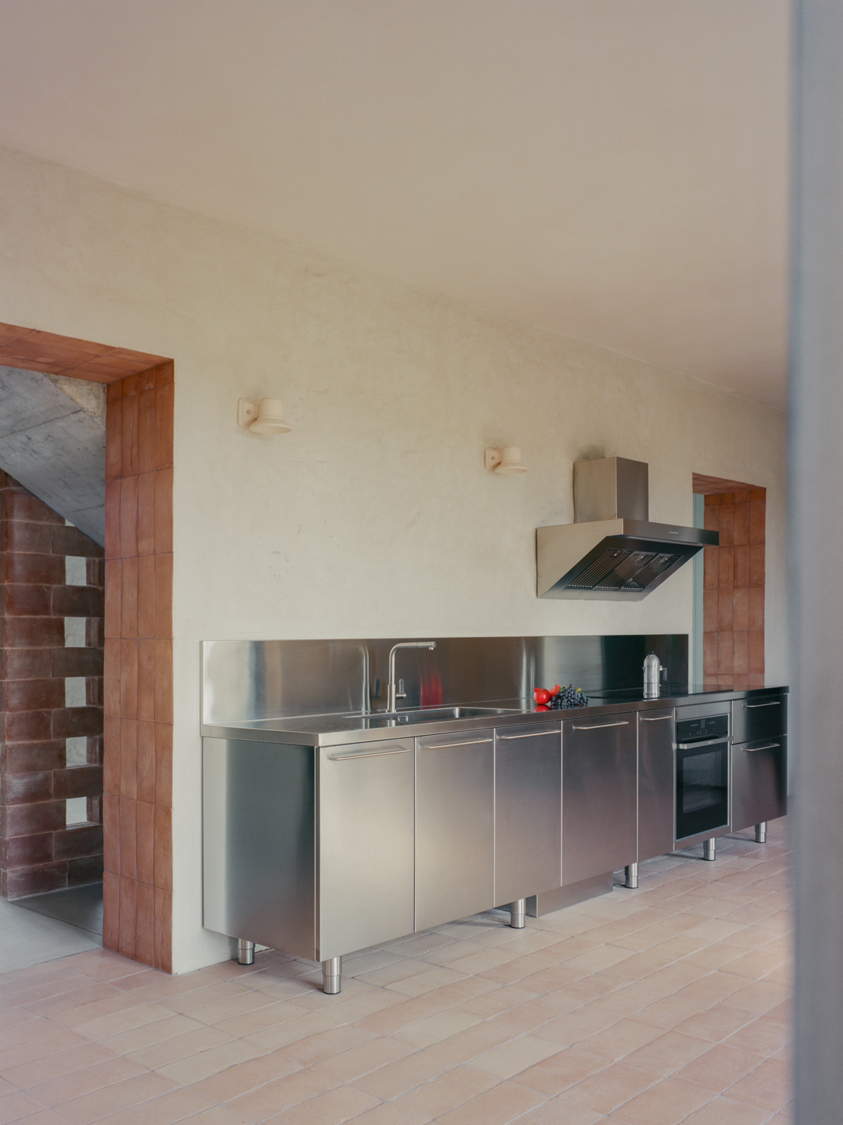 기존 석재 벽은 오래된 미장을 제거해 다시 드러냈고, 마구간 바닥에 사용되었던 테라코타 벽돌은 회수해 식당과 2층 침실의 벽 마감으로 재사용했다. 이 과정에서 테라코타와 콘크리트가 이 주택을 규정하는 핵심 재료로 자리 잡았다. 내부 통로와 일부 수평 면에는 은은한 분홍빛 톤이 적용됐고, 투스카니 농가에서 흔히 볼 수 있는 벽돌 격자벽은 새로 삽입된 내부 콘크리트 계단과 거실 사이를 나누는 요소로 사용됐다.