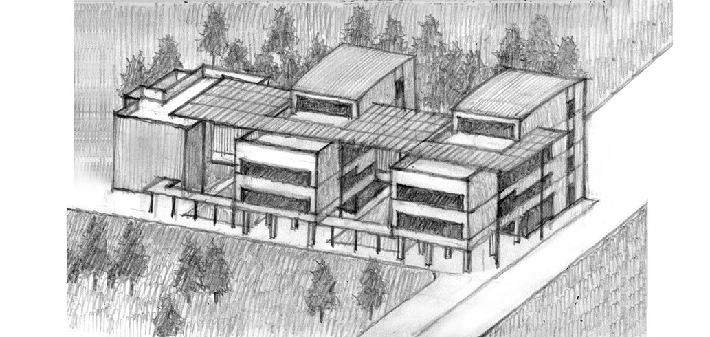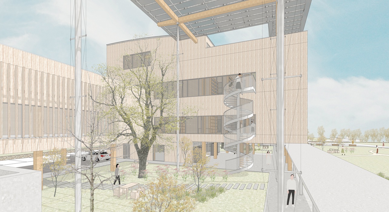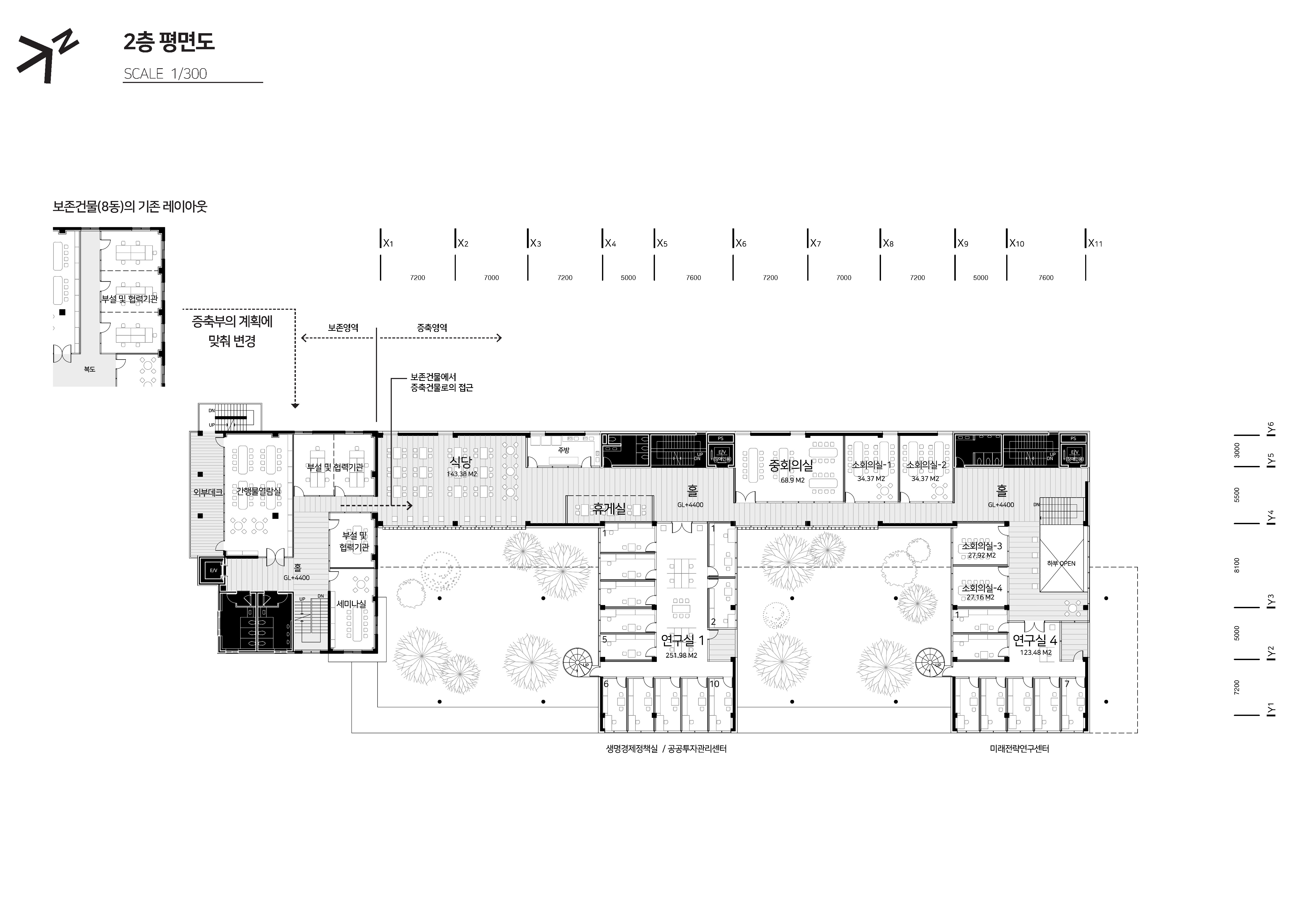 본 프로젝트는 대지 내에 있던 7개의 건물 중 6개의 건물을 철거하고 신관을 증축하는 방식으로 진행된다. 우리는 새롭게 지어질 신관과 보존건물과의 연계, 주변 환경과의 조화로운 배치가 가장 큰 이슈라고 판단했고, 그에 대한 대안으로 '3개의 매스와 2개의 공간 (3 MASSES + 2 SPACES)' 를 제안한다. 건물은 기존 건물과 연결되는 2개의 연구영약과 그를 잇는 보조영역, 그리고 그 사이에 위치하는 외부공간으로 구성된다. 2개의 연구영역은 대지를 적절히 분할하면서 띄워져 있어 자연스럽게 사이공간을 형성하며, 보존건물 또한 전체 건물의 일부로 포섭하여 전체 부지를 폭넓게 활용한다. 사이공간에는 다양한 수목과 편의시설들이 설치되어 연구자들이 편안하게 쉴 수 있는 휴식처가 되며, 연구자들이 항상 자연을 보며 연구할 수 있는 환경을 조성한다. 보존건물과 2개의 연구영역을 연결하는 보조영역은 연구활동을 서포트하는 회의실과 식당, 휴게실 등으로 구성되며 모든 시설에서 손쉽게 접근할 수 있어 효과적으로 활용된다. 새롭게 건립될 전북연구원이 쾌적하고 효율적인 연구환경과 함께 우리나라 목구조 건축물에 있어서 선도적인 역할을 수행하기를 기원한다.