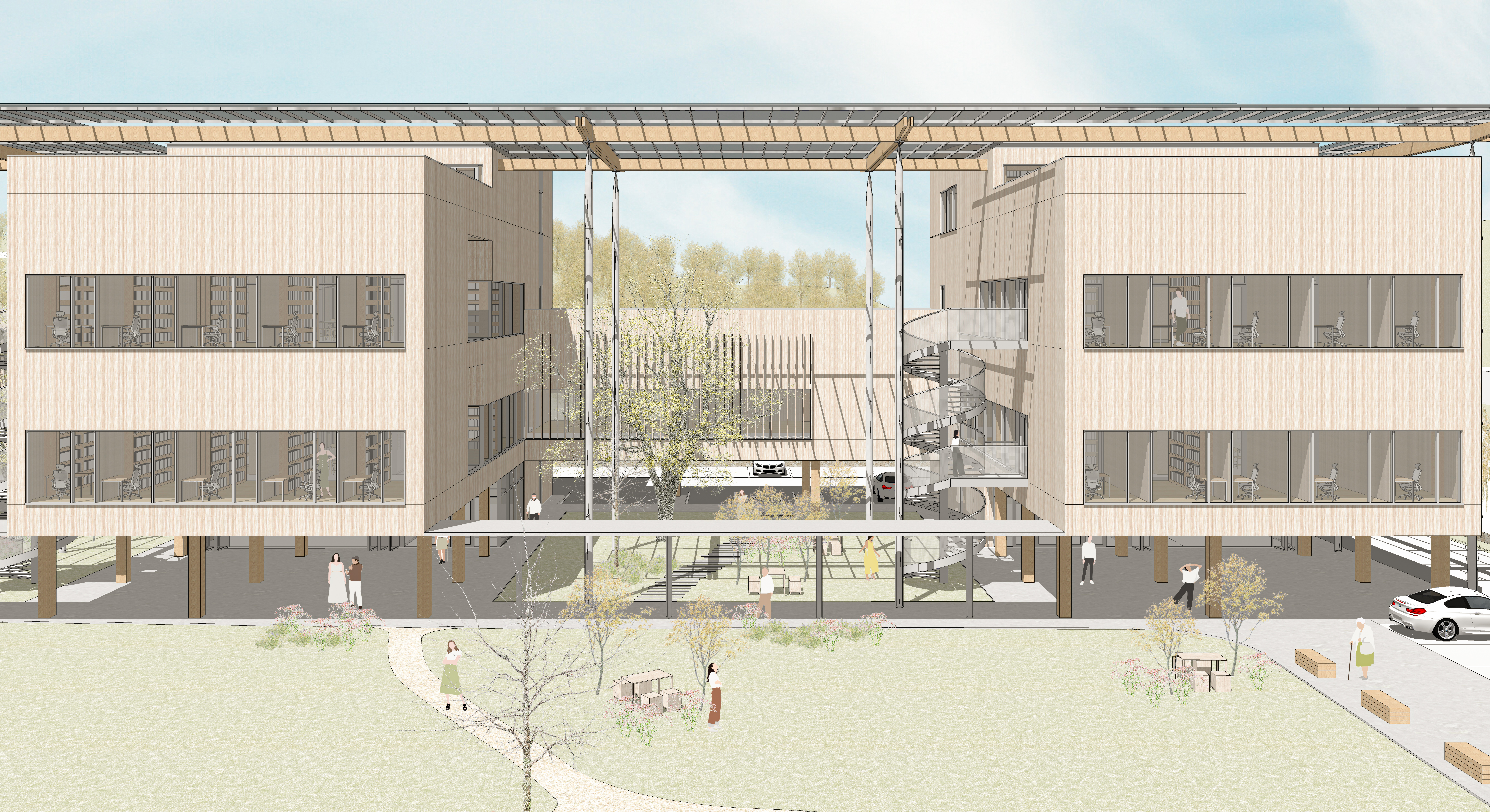 본 프로젝트는 대지 내에 있던 7개의 건물 중 6개의 건물을 철거하고 신관을 증축하는 방식으로 진행된다. 우리는 새롭게 지어질 신관과 보존건물과의 연계, 주변 환경과의 조화로운 배치가 가장 큰 이슈라고 판단했고, 그에 대한 대안으로 '3개의 매스와 2개의 공간 (3 MASSES + 2 SPACES)' 를 제안한다. 건물은 기존 건물과 연결되는 2개의 연구영약과 그를 잇는 보조영역, 그리고 그 사이에 위치하는 외부공간으로 구성된다. 2개의 연구영역은 대지를 적절히 분할하면서 띄워져 있어 자연스럽게 사이공간을 형성하며, 보존건물 또한 전체 건물의 일부로 포섭하여 전체 부지를 폭넓게 활용한다. 사이공간에는 다양한 수목과 편의시설들이 설치되어 연구자들이 편안하게 쉴 수 있는 휴식처가 되며, 연구자들이 항상 자연을 보며 연구할 수 있는 환경을 조성한다. 보존건물과 2개의 연구영역을 연결하는 보조영역은 연구활동을 서포트하는 회의실과 식당, 휴게실 등으로 구성되며 모든 시설에서 손쉽게 접근할 수 있어 효과적으로 활용된다. 새롭게 건립될 전북연구원이 쾌적하고 효율적인 연구환경과 함께 우리나라 목구조 건축물에 있어서 선도적인 역할을 수행하기를 기원한다.