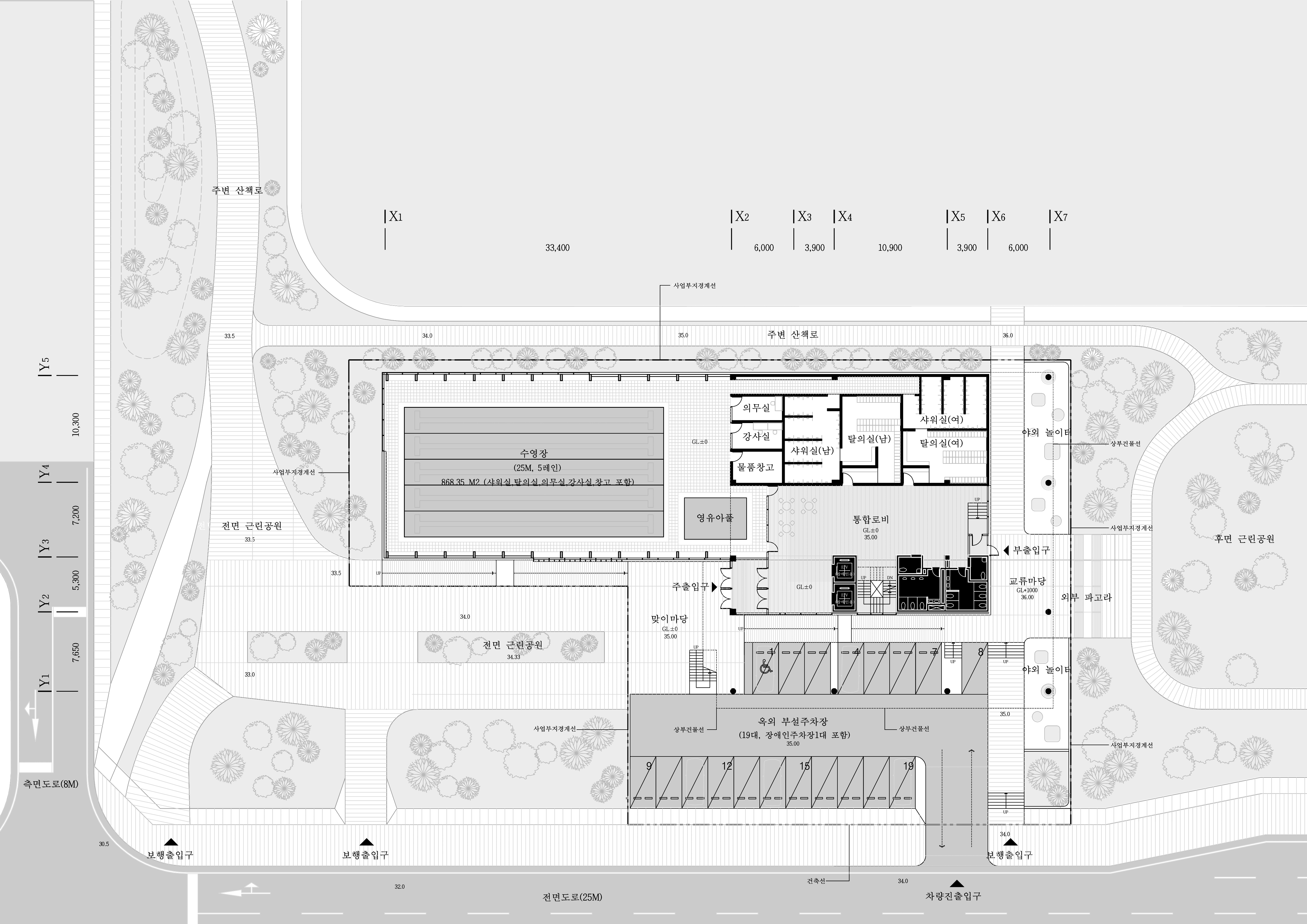 대지 주변의 도로와 공원, 후면 주거단지 등으로 인해 자연스럽게 2개의 보행축이 형성된다. 이를 고려하여 수영장 등의 주요시설을 배치하고 방문자의 통행이 원활하게 이루어질 수 있도록 보행동선을 구성하였다.