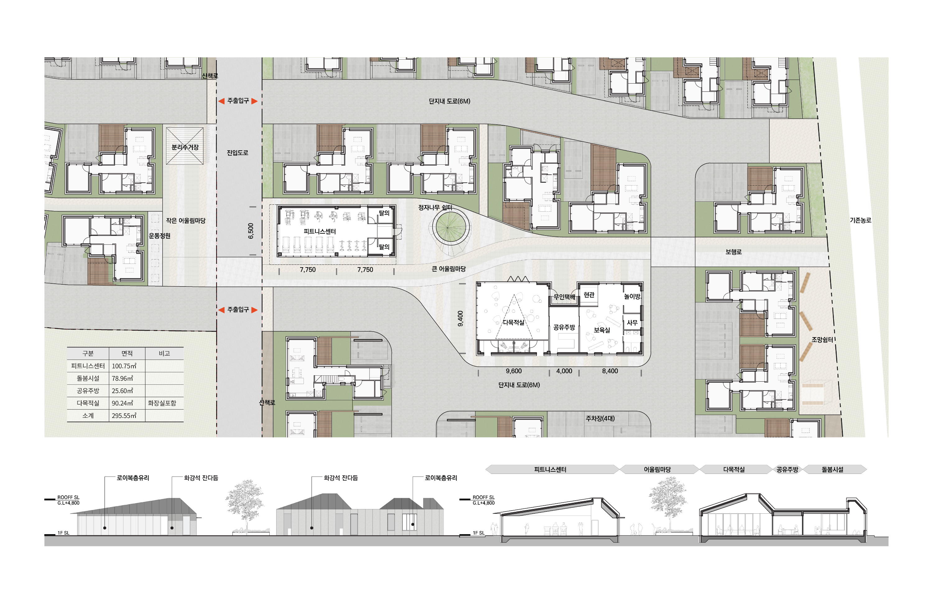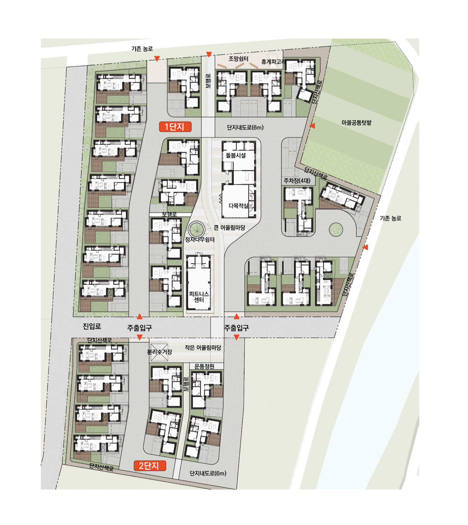 또한 두 단지를 순환하는 보차혼용로는 대지의 형태를 따라 완만한 선형으로 계획되어 차량속도를 자연스럽게 제어하고 보행 중심의 농촌 단지 이미지를 형성한다. 이는 도시형 아파트 단지가 아니라 마을의 골목길을 회복하는 건축적 계획에서 비롯된다. 단지 외곽으로는 남북 두개의 단지를 8자형으로 순환하는 산책로를 계획하여 운동 공간으로 사용됨과 동시에 인근의 농로와 마을공통텃밭으로의 접근로 역할도 하도록 계획했다.