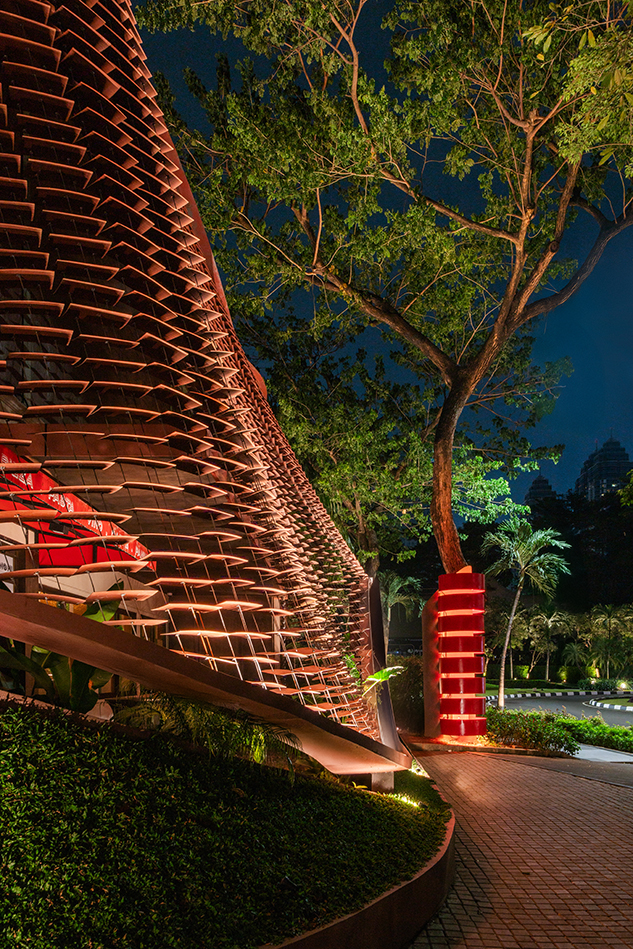 인도네시아의 고온다습한 기후 속에서 수백 년간 사용되어 온 격자(lattice)는 단순한 장식 요소가 아니라, 햇빛과 바람을 조절하는 핵심적인 기후 대응 장치였다. Lattice Garden은 이 전통적인 격자 원리를 현대적으로 재해석한 프로젝트로, 기능과 상징을 동시에 부여하는 ‘이중 코딩(dual coding)’ 전략을 통해 고성능 차양 시스템이자 지역적 맥락을 반영한 건축적 표면으로 확장한다.