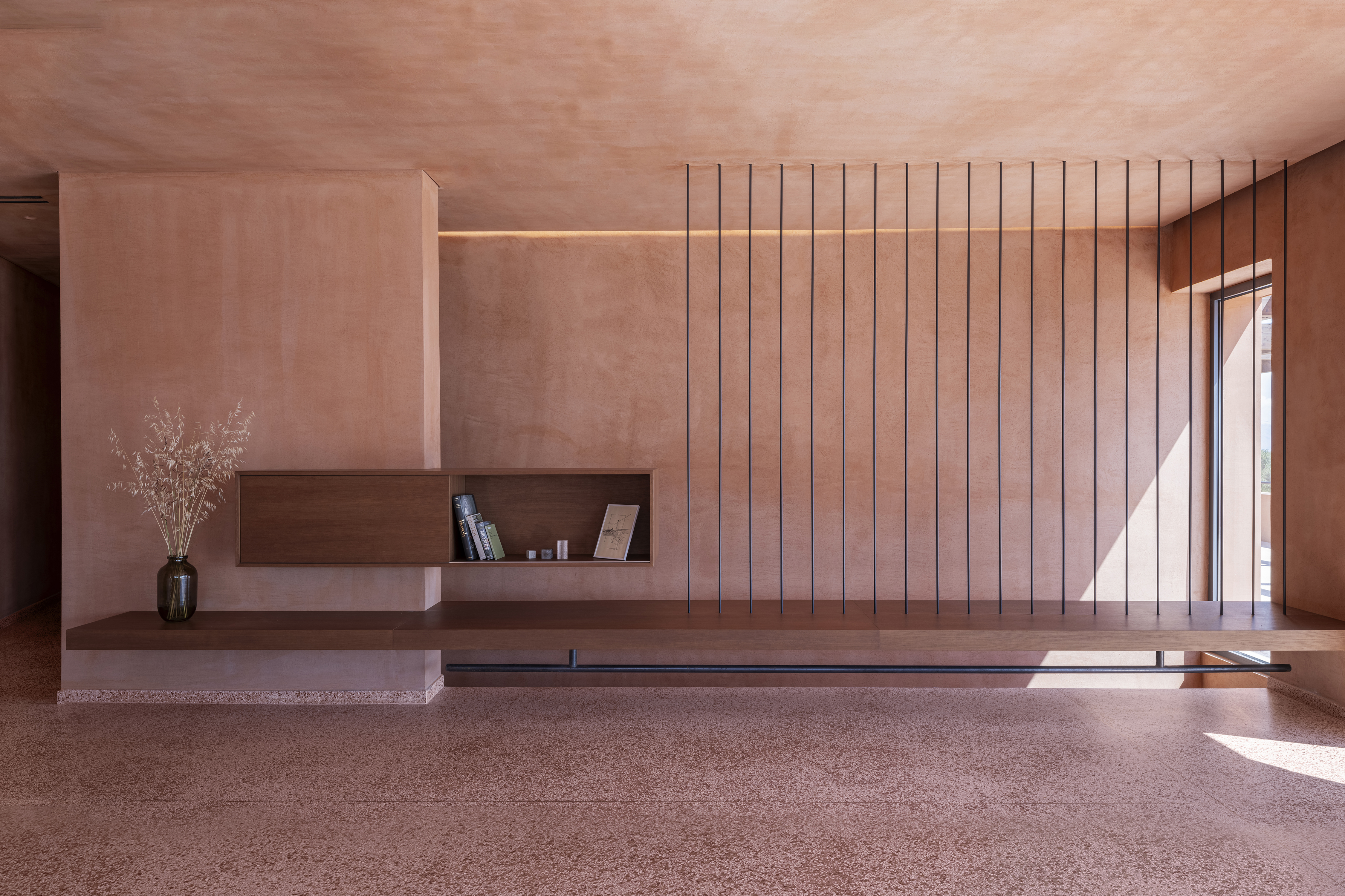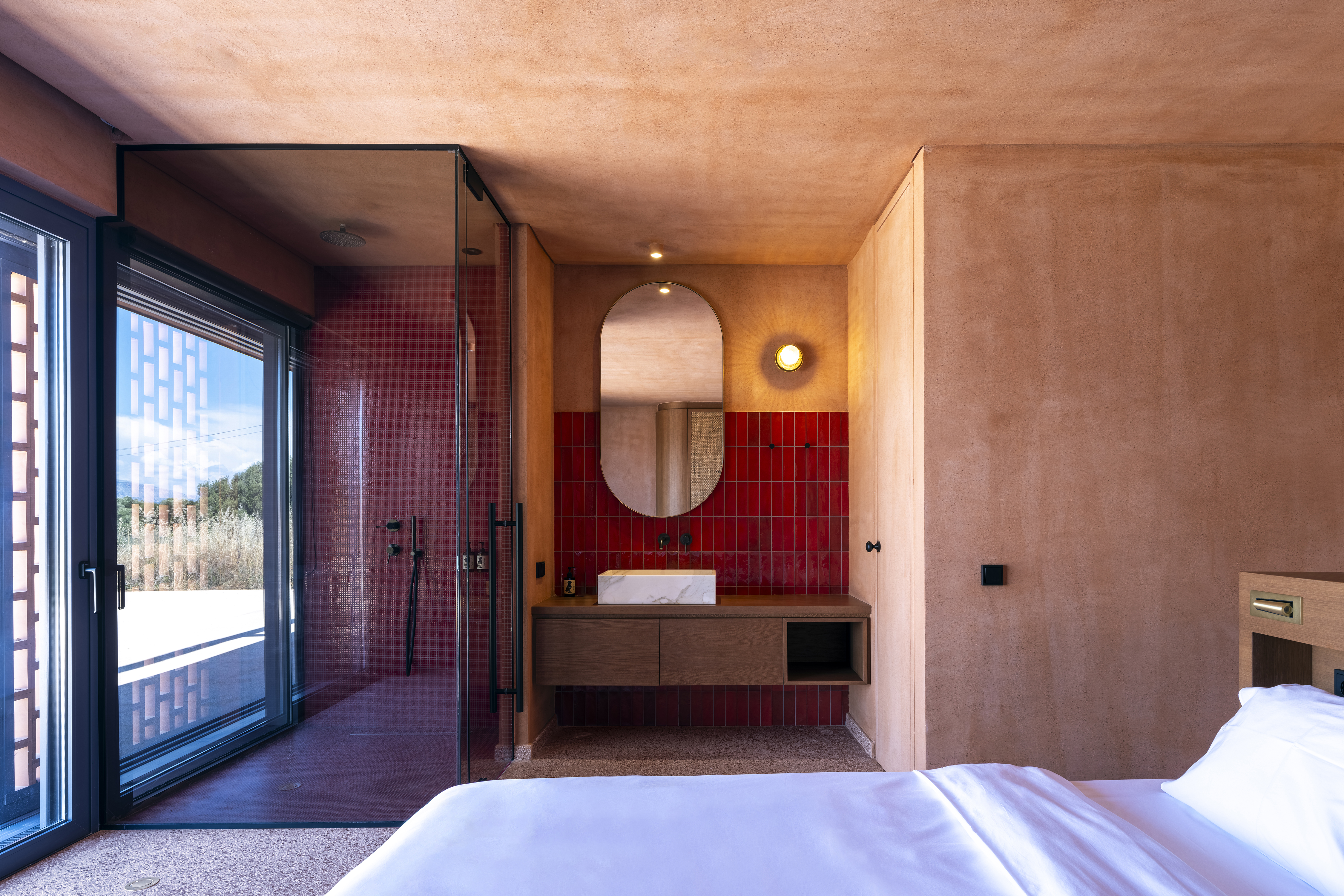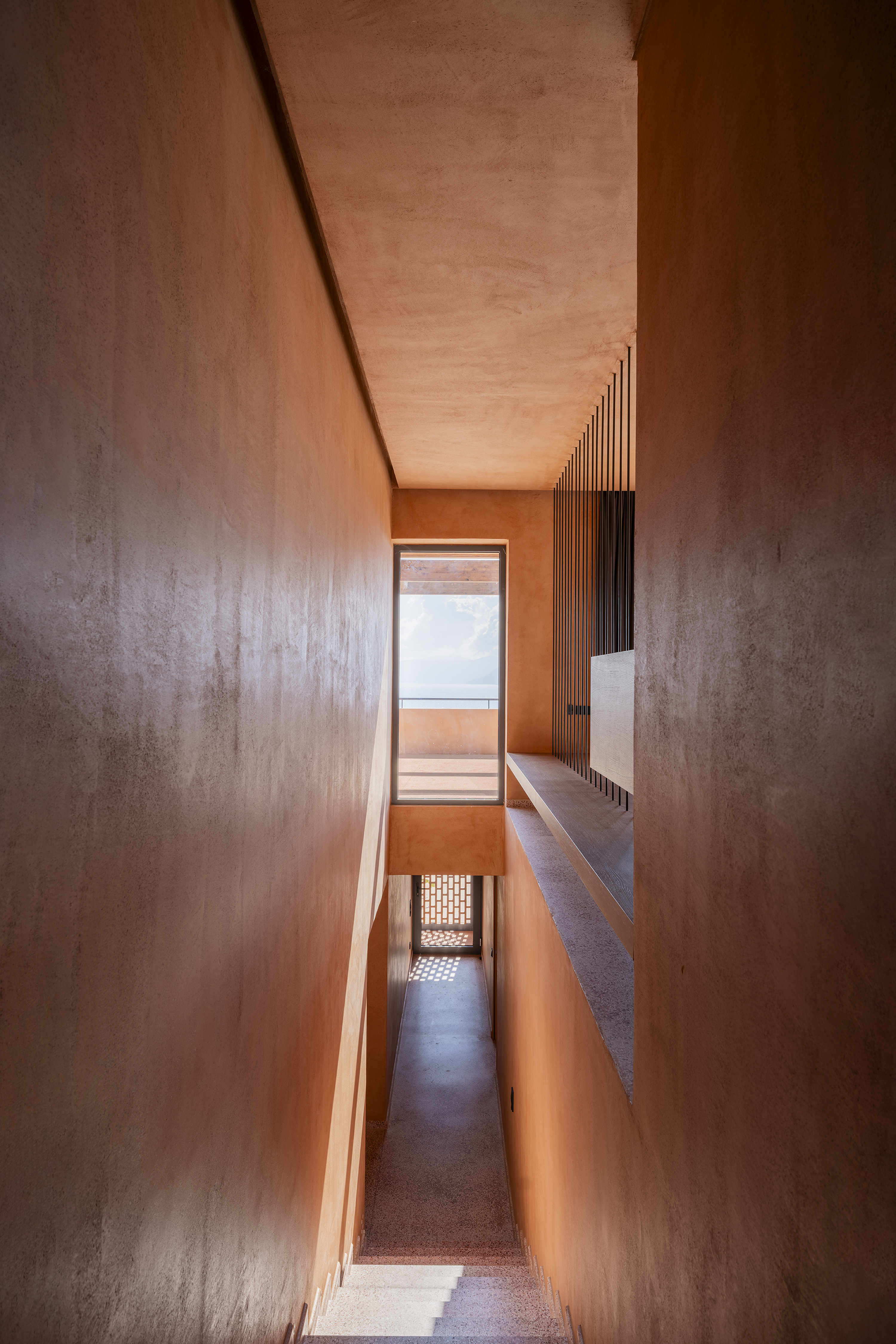 프로젝트는 자연 속에서의 거주 경험을 재정의하며, 전통적인 럭셔리의 개념을 단순함과 원초적 재료의 사용으로 전환한다. 울창한 녹지와 대비되는 테라코타의 따뜻한 색감은 오히려 풍경과 깊이 공명하며, 건물이 마치 대지에서 직접 깎여 나온 것 같은 인상을 만든다. 수공 테라조, 대리석, 목재 등 거친 질감의 재료는 벽·바닥·천장 전반에 일관되게 적용되어, 여름 주거에 적합한 친밀하고 감각적인 공간을 형성한다.