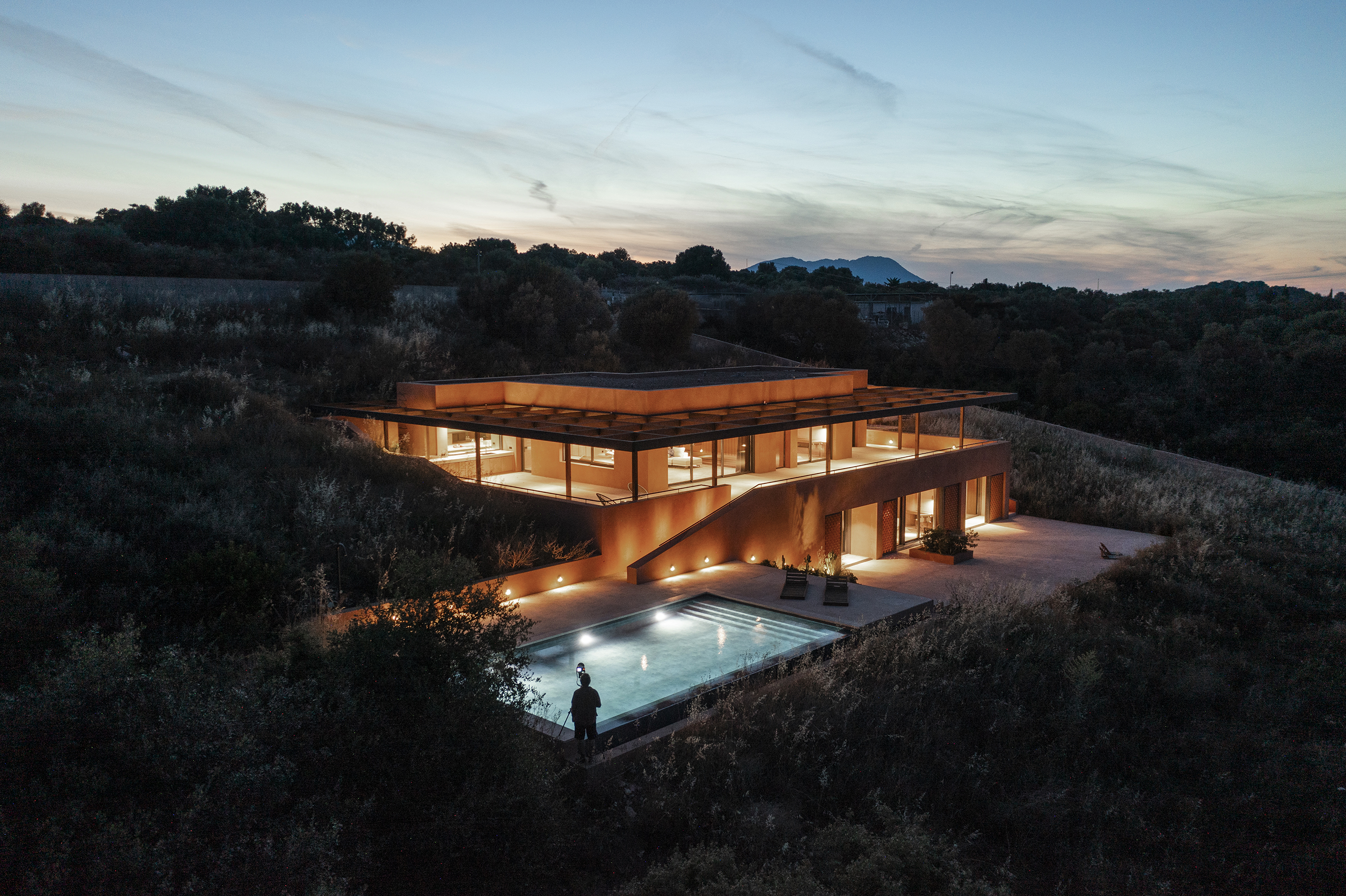 주택 내부에는 다섯 개의 침실과 넉넉한 거실·다이닝 공간이 배치되어, 개인적인 휴식과 공동의 생활이 자연스럽게 공존한다. 외부 공간은 세 개의 레벨로 구성되어 지형을 따라 확장되며, 그 중심에는 상·하부 공간을 연결하는 수영장이 자리한다. 상부 테라스에서는 이오니아 해와 핀도스 산맥을 조망할 수 있고, 하부 공간은 지형에 깊숙이 묻힌 형태로 보다 은밀한 휴식처를 제공한다.
