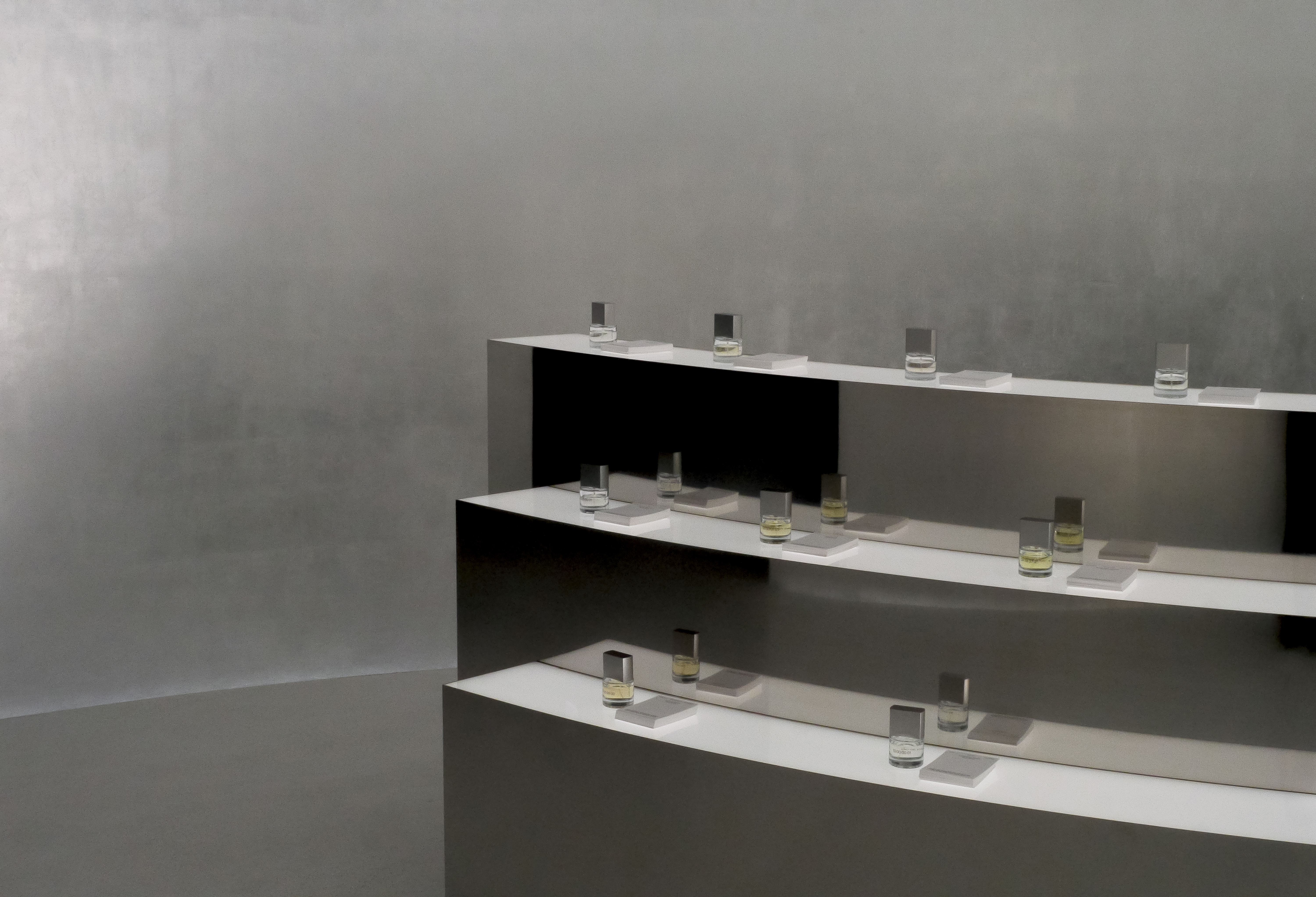 공간은 총 세 개의 단계로 구성된다. 첫 번째 구간은 ‘감각의 전환’에 해당하는 영역으로, 시각 중심의 인지에서 후각 중심의 경험으로 자연스럽게 이동하도록 유도한다. 쇼룸 입구에서 마주하는 은빛 물결은 일상의 시간에서 벗어나 다른 감각의 세계로 진입하는 장면을 연출하며, 브랜드와 방문자가 처음 조우하는 상징적인 장치로 기능한다. 층층이 쌓인 3단 진열대는 구조체가 드러나지 않도록 설계되어 부유하는 인상을 주고, 곡선 형태의 벽은 방문자를 감싸며 차분하게 향에 집중하도록 돕는다.