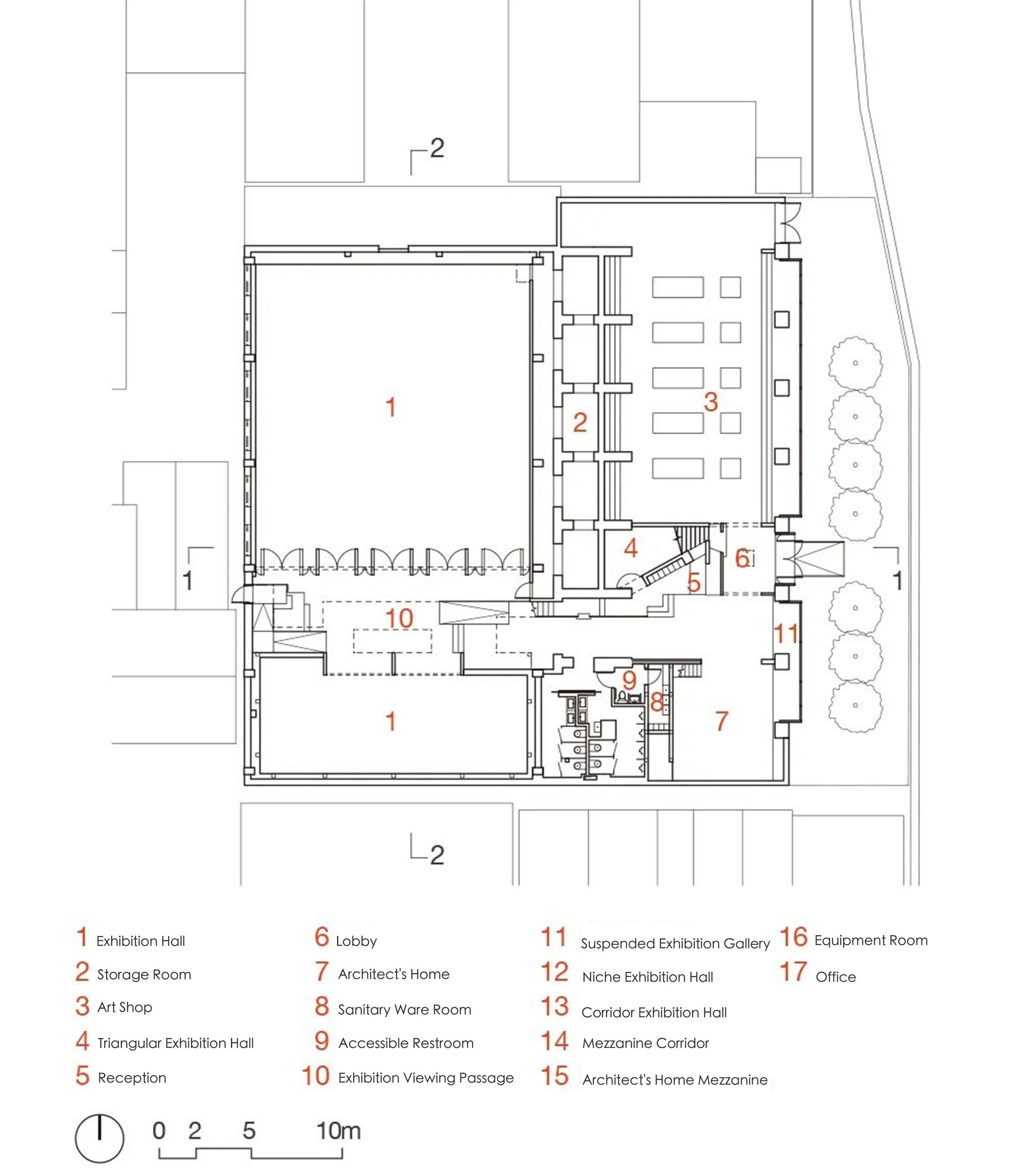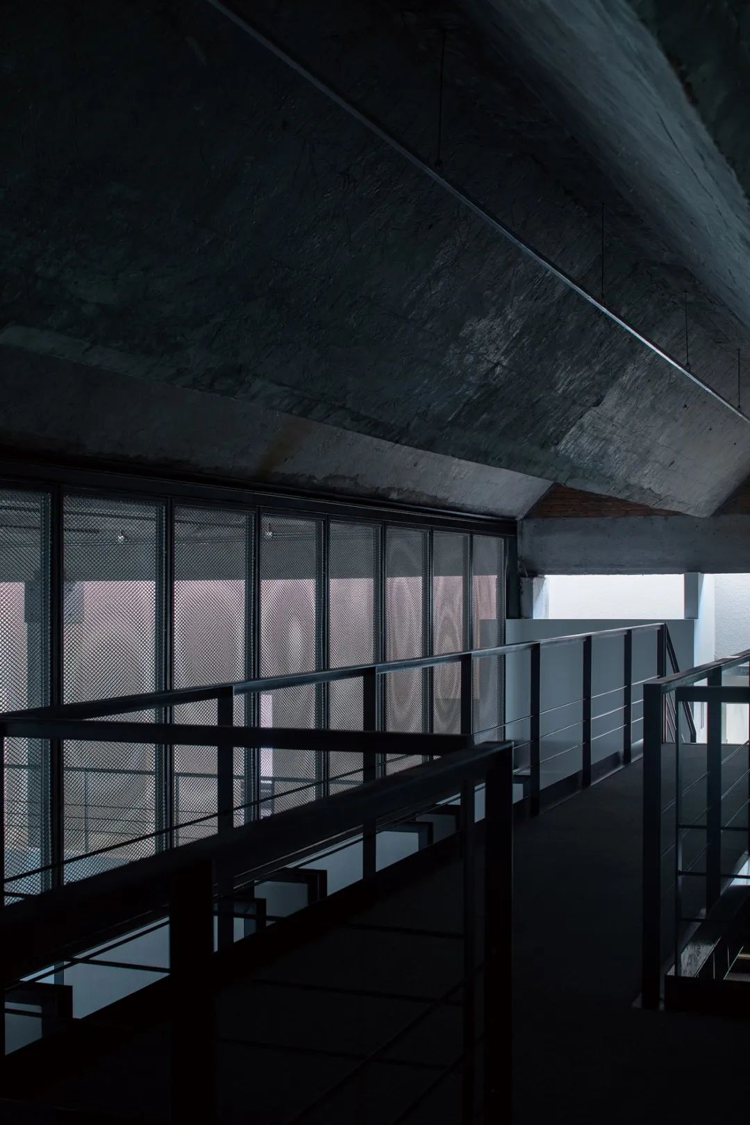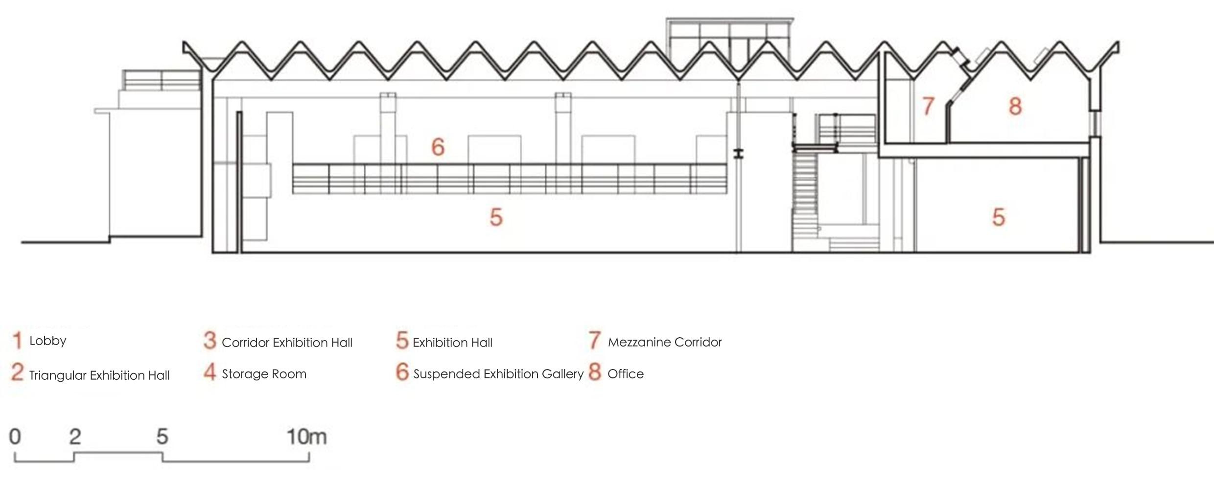 아트숍에서 전시홀을 바라보면, 바닥과 동선은 점진적으로 상승하며 공간의 밝기도 함께 높아진다. 데크 가장자리에는 전시벽 대신 난간이 설치되어 서로 다른 공간 사이의 시각적 연속성이 유지된다. 남동쪽에는 건축가의 작업 공간이 배치되어 있으며, 콘크리트 구조물에서 출발한 철제 계단을 통해 중이층으로 연결된다. 서로 다른 높이의 플랫폼 사이에는 낮은 콘크리트 단이 만들어져, 계단식 좌석이자 무대처럼 읽히는 장면을 만든다.