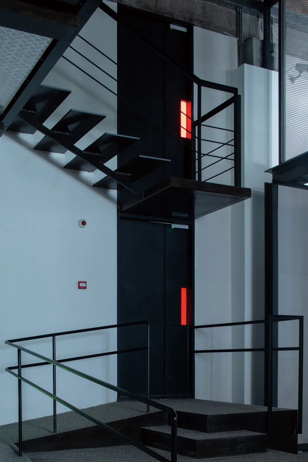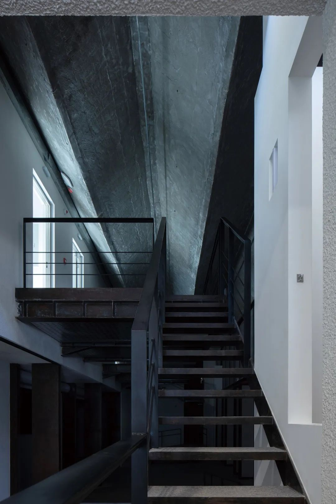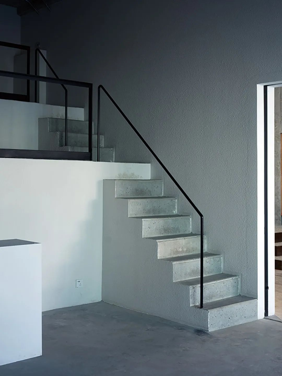 아트숍에서 전시홀을 바라보면, 바닥과 동선은 점진적으로 상승하며 공간의 밝기도 함께 높아진다. 데크 가장자리에는 전시벽 대신 난간이 설치되어 서로 다른 공간 사이의 시각적 연속성이 유지된다. 남동쪽에는 건축가의 작업 공간이 배치되어 있으며, 콘크리트 구조물에서 출발한 철제 계단을 통해 중이층으로 연결된다. 서로 다른 높이의 플랫폼 사이에는 낮은 콘크리트 단이 만들어져, 계단식 좌석이자 무대처럼 읽히는 장면을 만든다.
