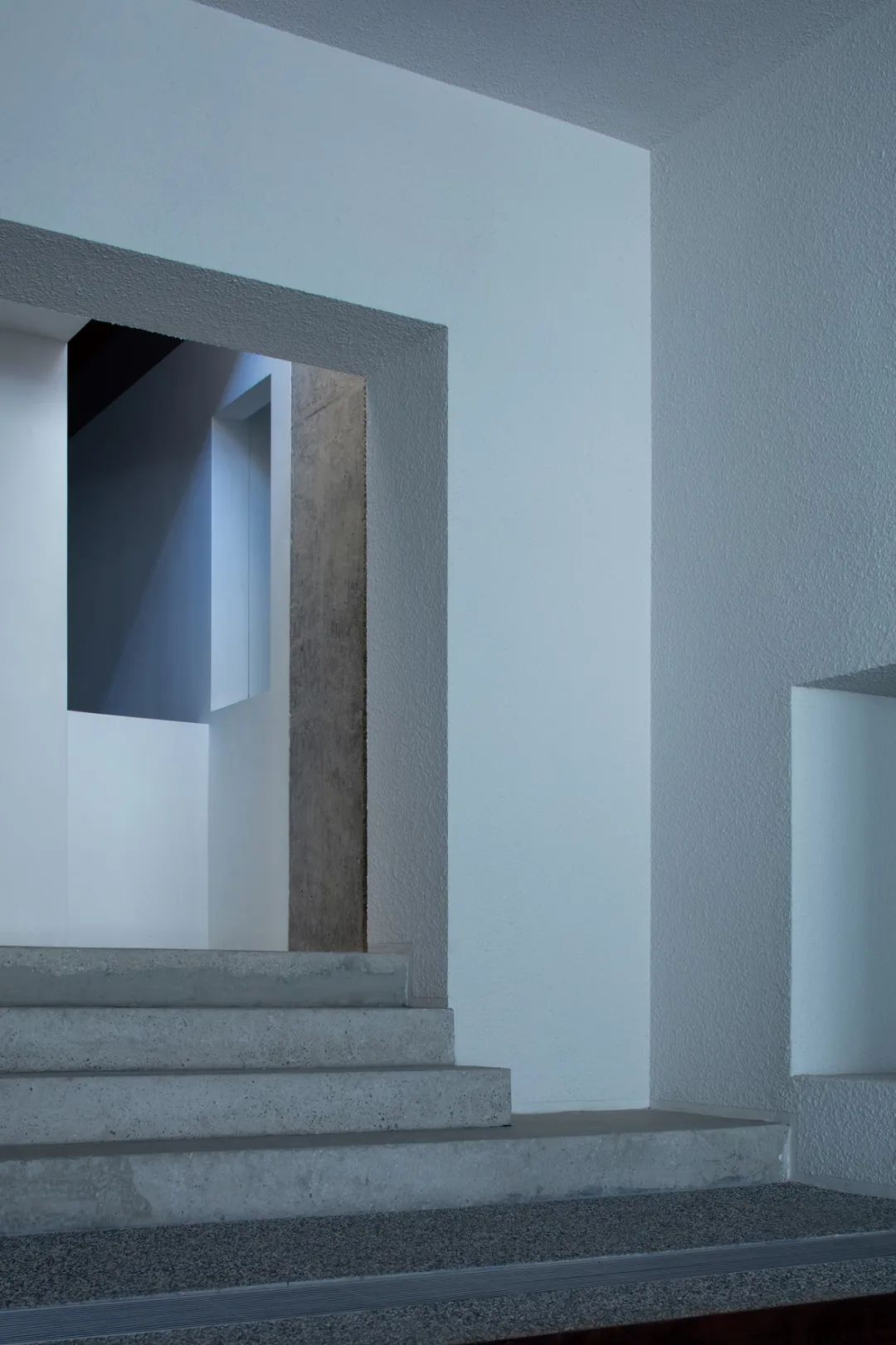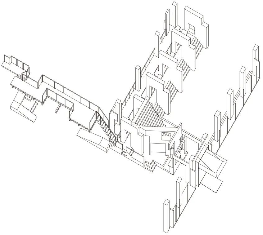 이 구조체는 내부가 비워진 콘크리트 박스로, 중앙이 사선으로 절개되며 전시홀과 중정으로 향하는 방향성을 형성한다. 파사드에는 이중 벽체가 적용되었고, 일부는 비워 리셉션 데스크가 들어가는 공간을 만들었다. 반대편 콘크리트 스크린 뒤에는 옥상으로 이어지는 계단이 숨겨져 있으며, 전체적으로는 하나의 덩어리처럼 보이지만 내부는 다공성 구조로 작동한다. 다소 높은 카운터, 좁은 개구부, 가파른 계단 경사는 사용자가 ‘완전한 기능적 상자’가 아닌, 균열 난 암석 내부를 통과하고 있다는 감각을 인지하게 만든다.