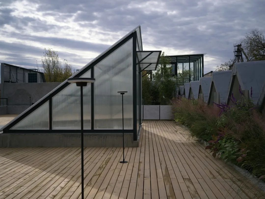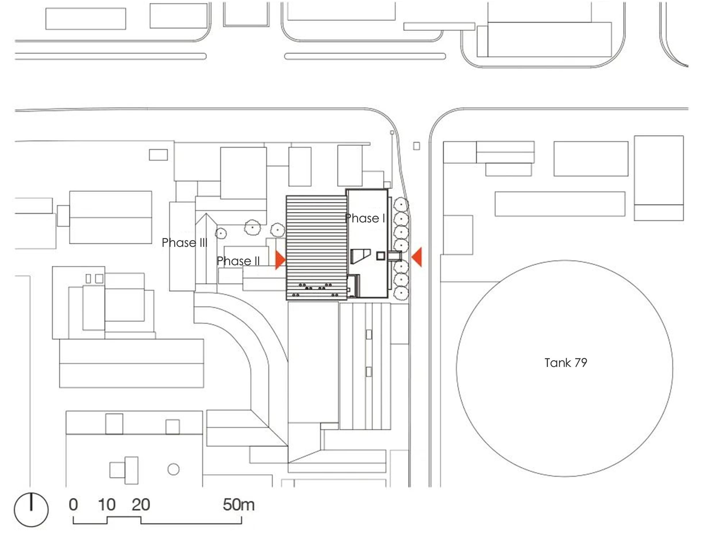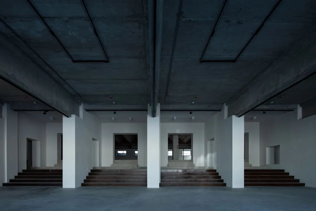 진입부 동측에는 중국 피스타치아 나무가 자리하며, 내부의 따뜻한 조명과 대비를 이룬다. 공사 과정에서 남은 자재들은 이후 페이즈 II를 위해 보관되었고, 일부 잔여 철골은 의도적으로 노출된 채 새로운 공간 장치로 재사용되었다. 페이즈 I의 핵심은 남겨진 공간과 재료를 적극적으로 활용해, 콘크리트 개입을 통해 기능을 삽입하고 깊이를 만들어내는 데 있다. 이 프로젝트는 결과적으로 ‘집 안에 정원을 짓는’ 방식으로, 산업 유산의 잔여 공간을 전시 건축으로 전환한다.