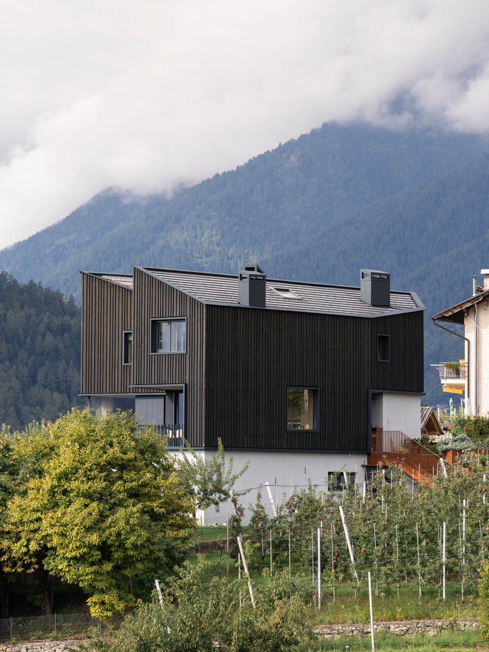 주택의 외관은 수직 패널과 4×4cm 단면의 부재로 구성된 수처리된 검은색 낙엽송 외장으로 마감되었다. 큰 개구부와 비스듬하고 불규칙한 선형이 외피를 가로지르며, 주변 환경과 구분되는 강한 역동성을 만들어낸다. 건축과 풍경, 그리고 제한된 범위의 자연 재료가 결합되며, 절제된 구성 속에서도 편안하고 개방적인 분위기를 형성한다.