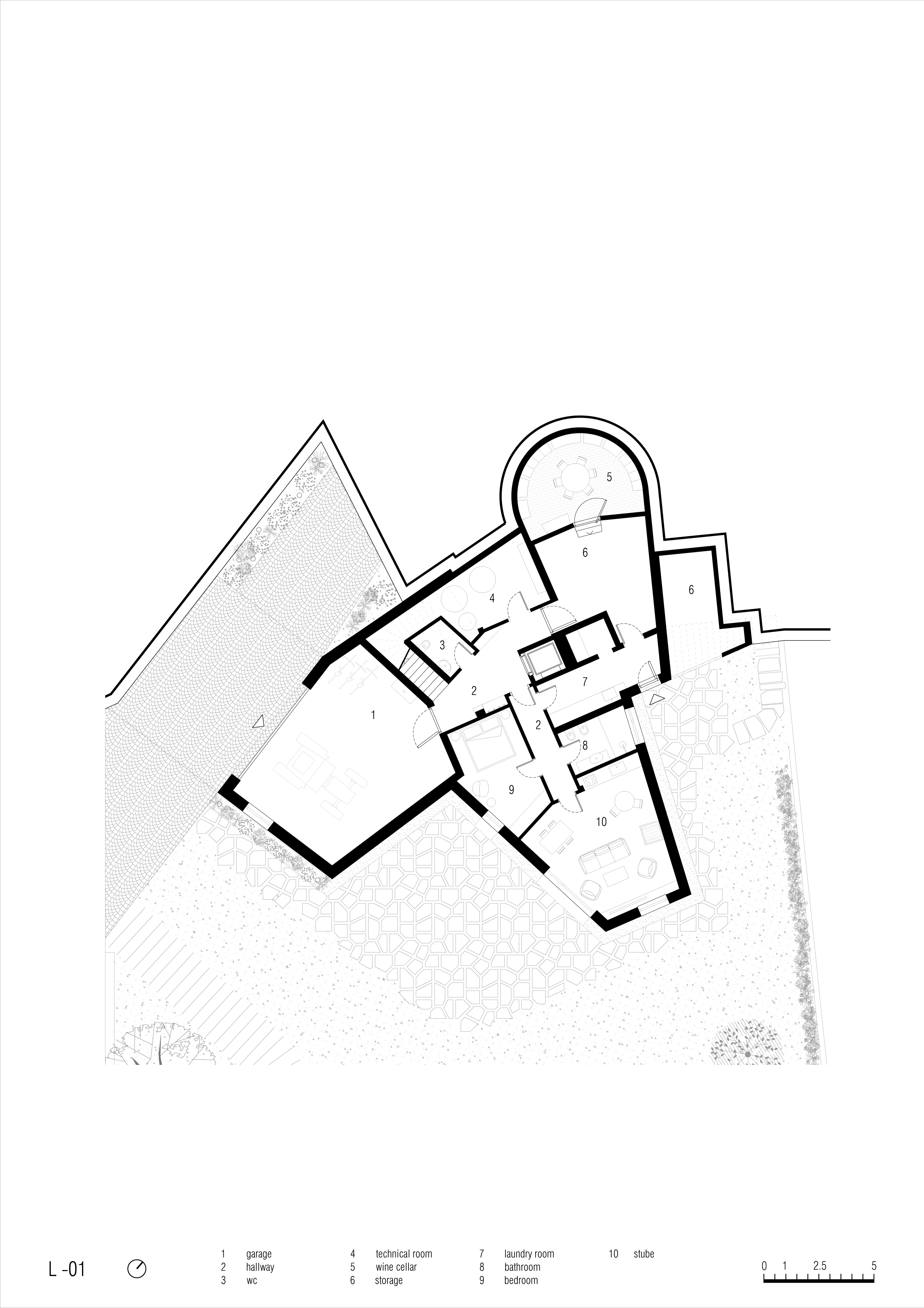 가장 하부, 완전히 지면 아래에는 와인 저장고와 테이스팅 룸이 자리한다. 곡면 콘크리트 벽, 단단한 낙엽송 목재, 붉은 벽돌 바닥으로 구성된 이 공간은 주택을 대지와 단단히 연결하며, 의뢰인의 발 디 논 지역에 대한 기억과 뿌리를 상징적으로 드러낸다.
