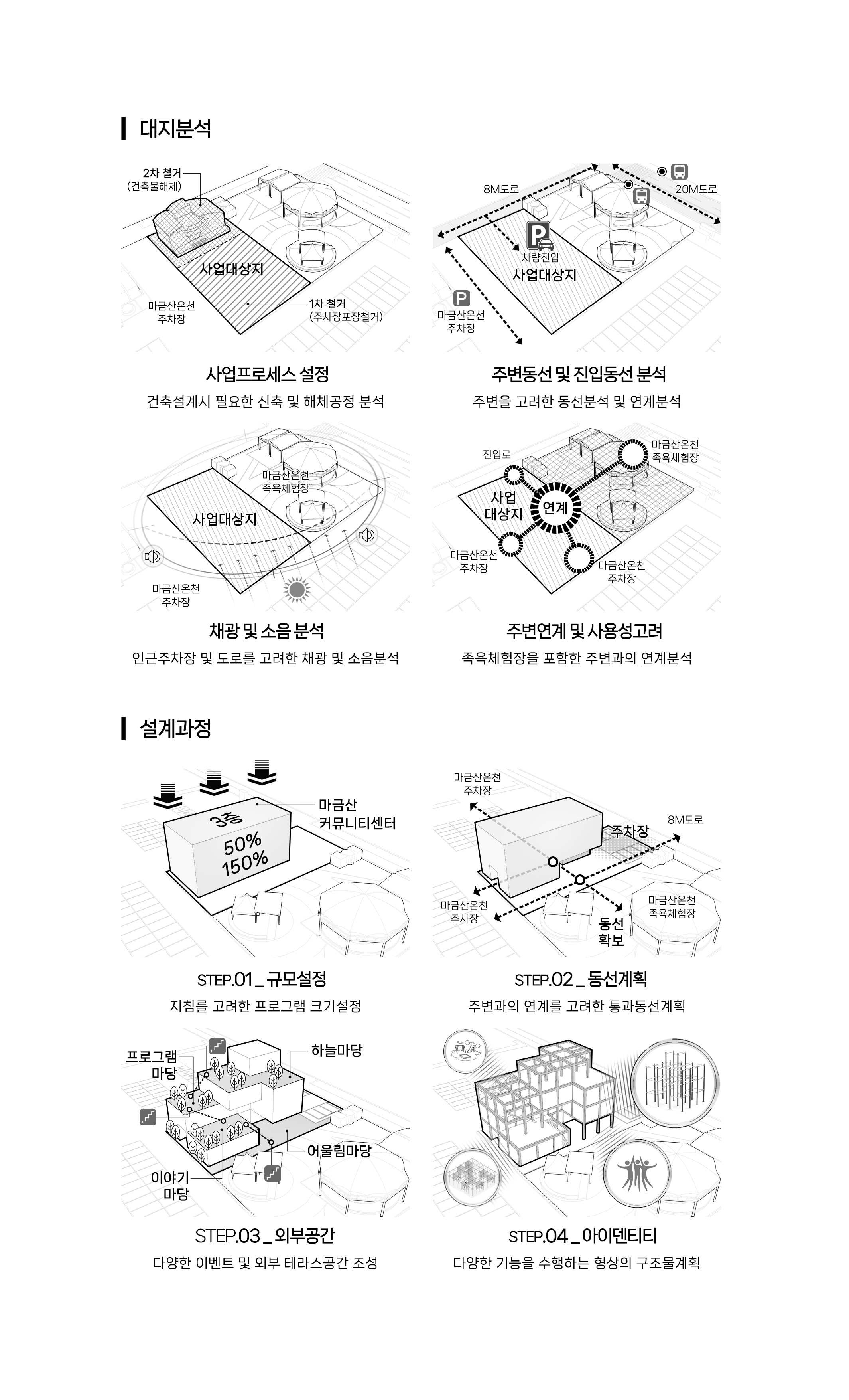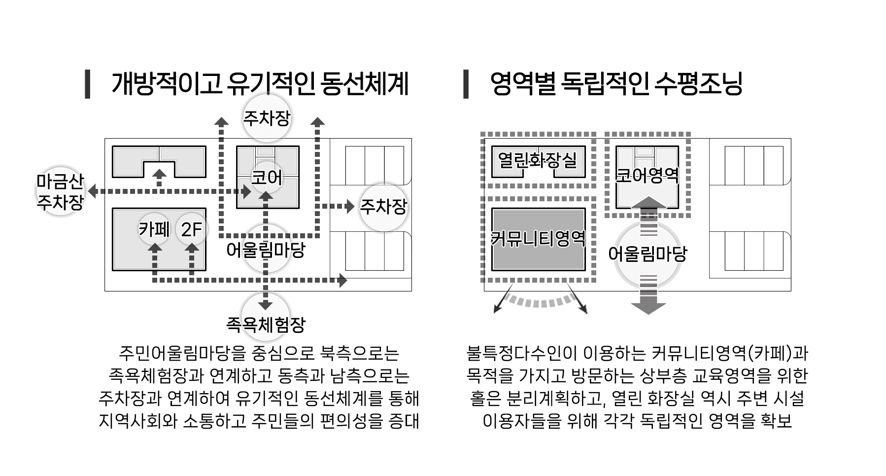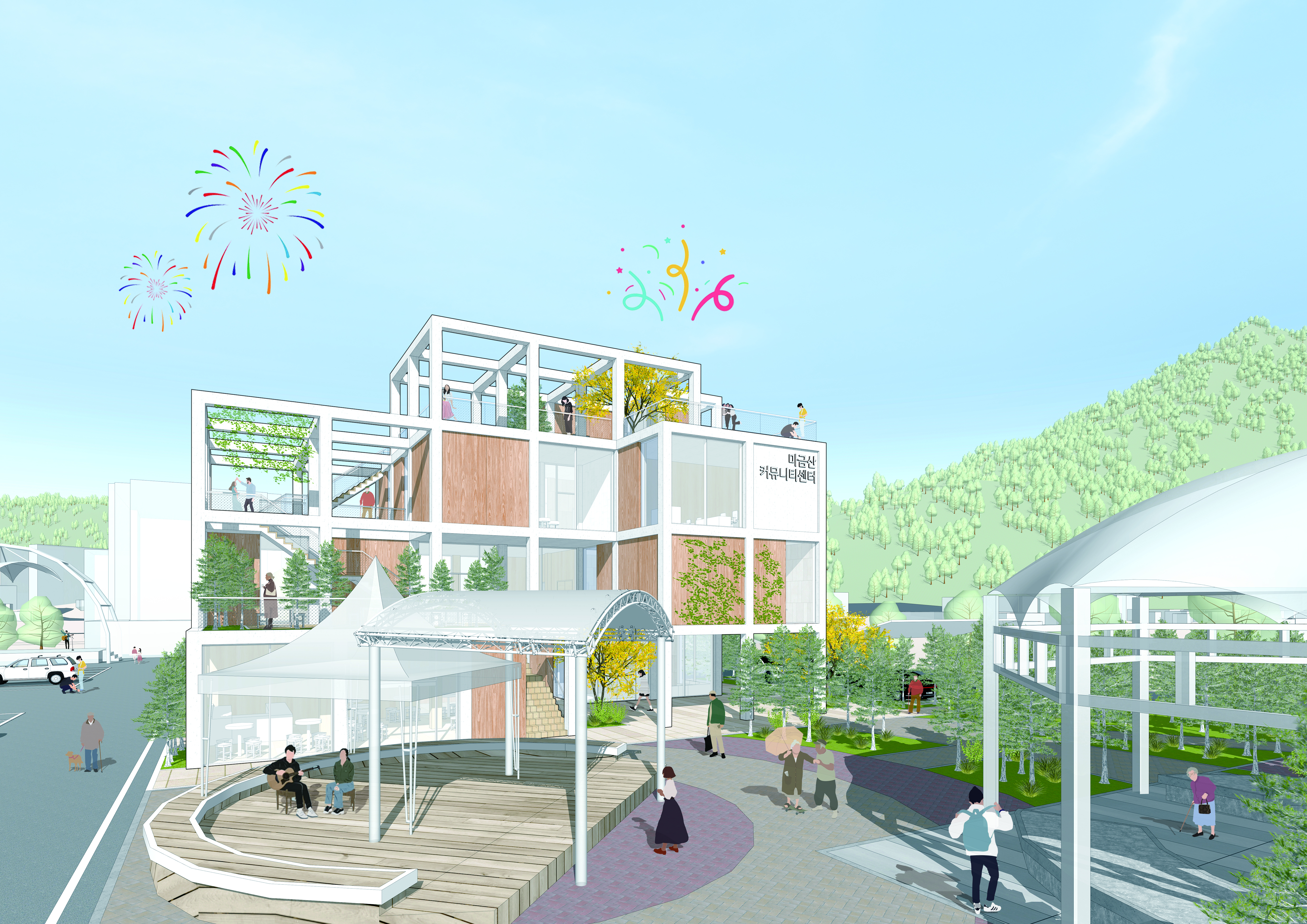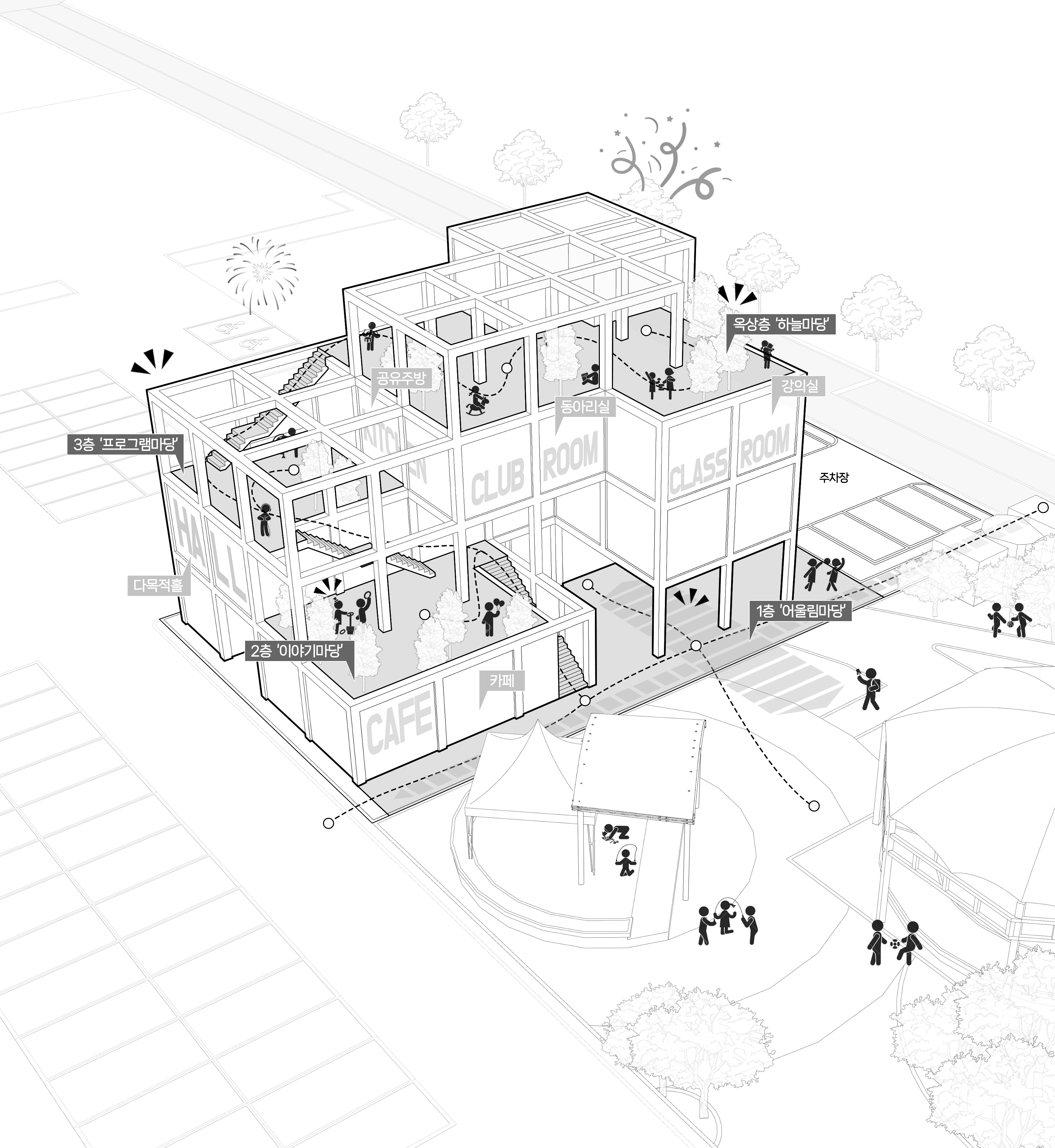 정글짐이 아이들에게 무한한 놀이 경로와 입체적인 경험을 제공하듯, 이 건축물이 주민들에게 다양한 소통과 활동의 무대가 되기를 의도했습니다. 이를 위해 건물을 단순한 적층 구조가 아닌, 내외부가 유기적으로 얽힌 입체적인 프레임으로 구성했습니다. 가장 큰 특징은 각 층마다 배치된 외부 테라스, '마당'입니다. 1층의 어울림마당에서 시작해 2층 이야기마당, 3층 프로그램마당, 그리고 옥상의 하늘마당까지 이어지는 외부 동선은 건물 전체를 하나의 산책로처럼 연결합니다. 입면 디자인에서는 노출콘크리트와 고밀도 목재패널을 활용한 규칙적인 그리드 패턴을 적용하여 주변의 자연환경과 조화를 이루면서도, 건물의 구조적 안정감과 조형적 리듬감을 동시에 부여하고자 했습니다.