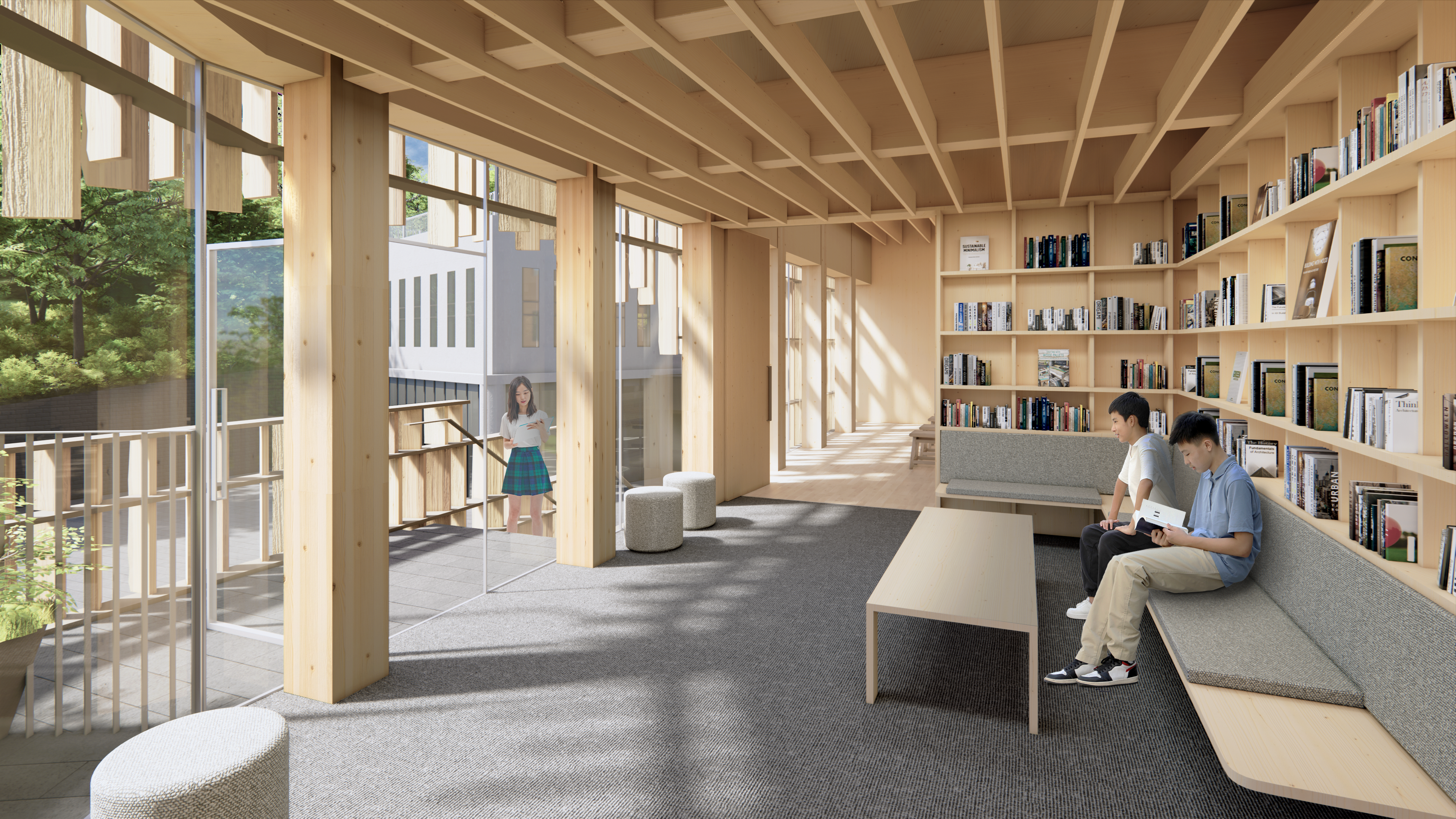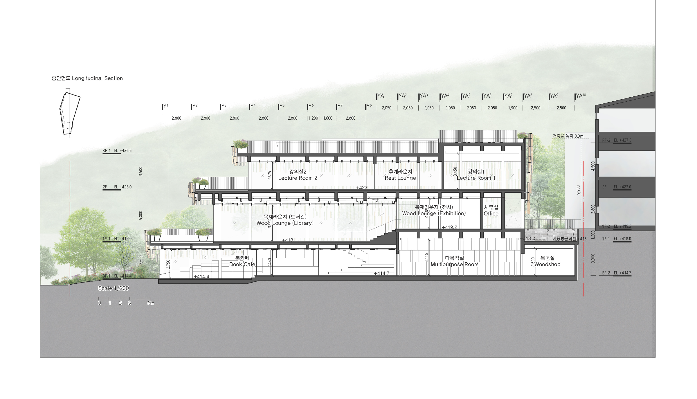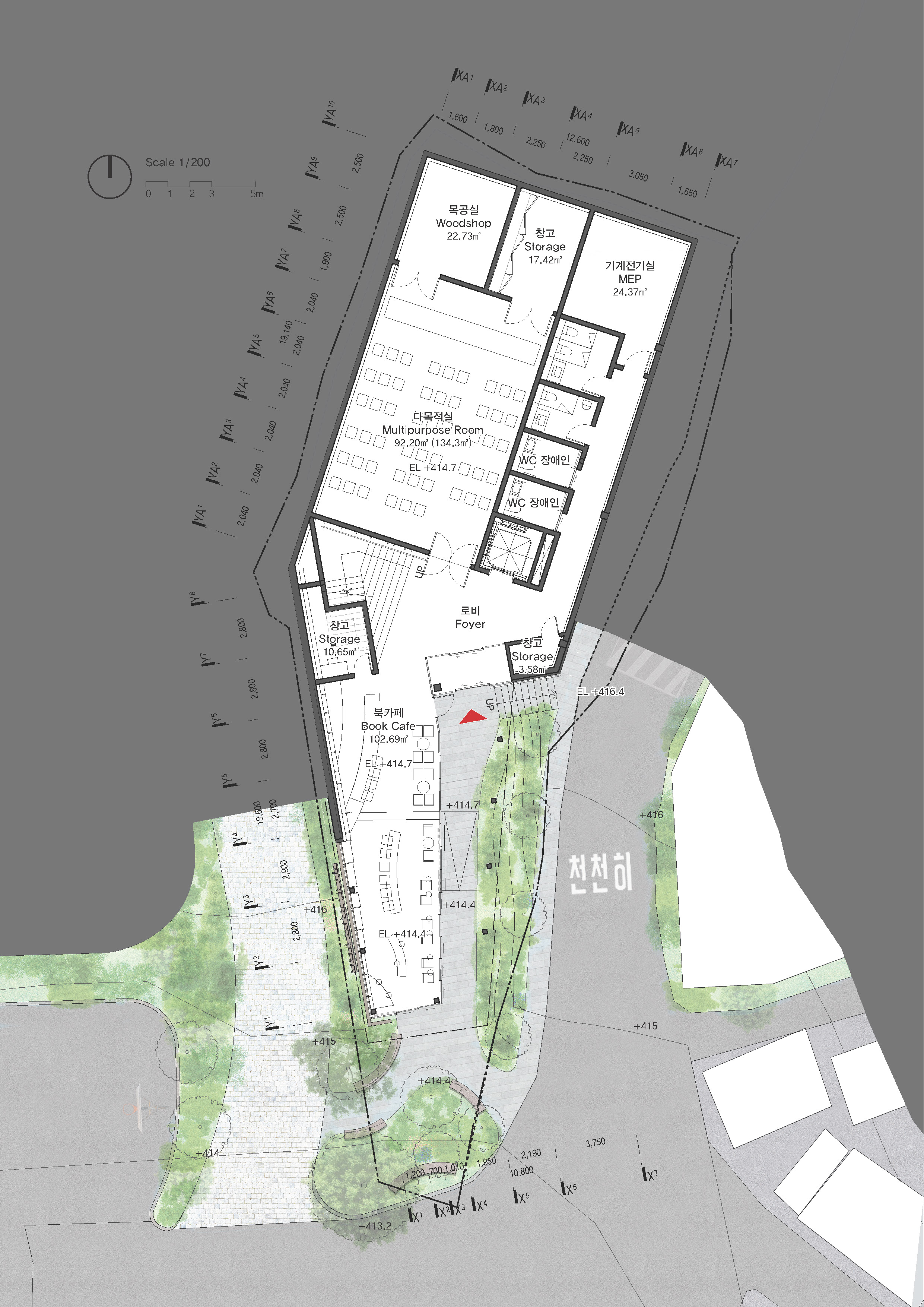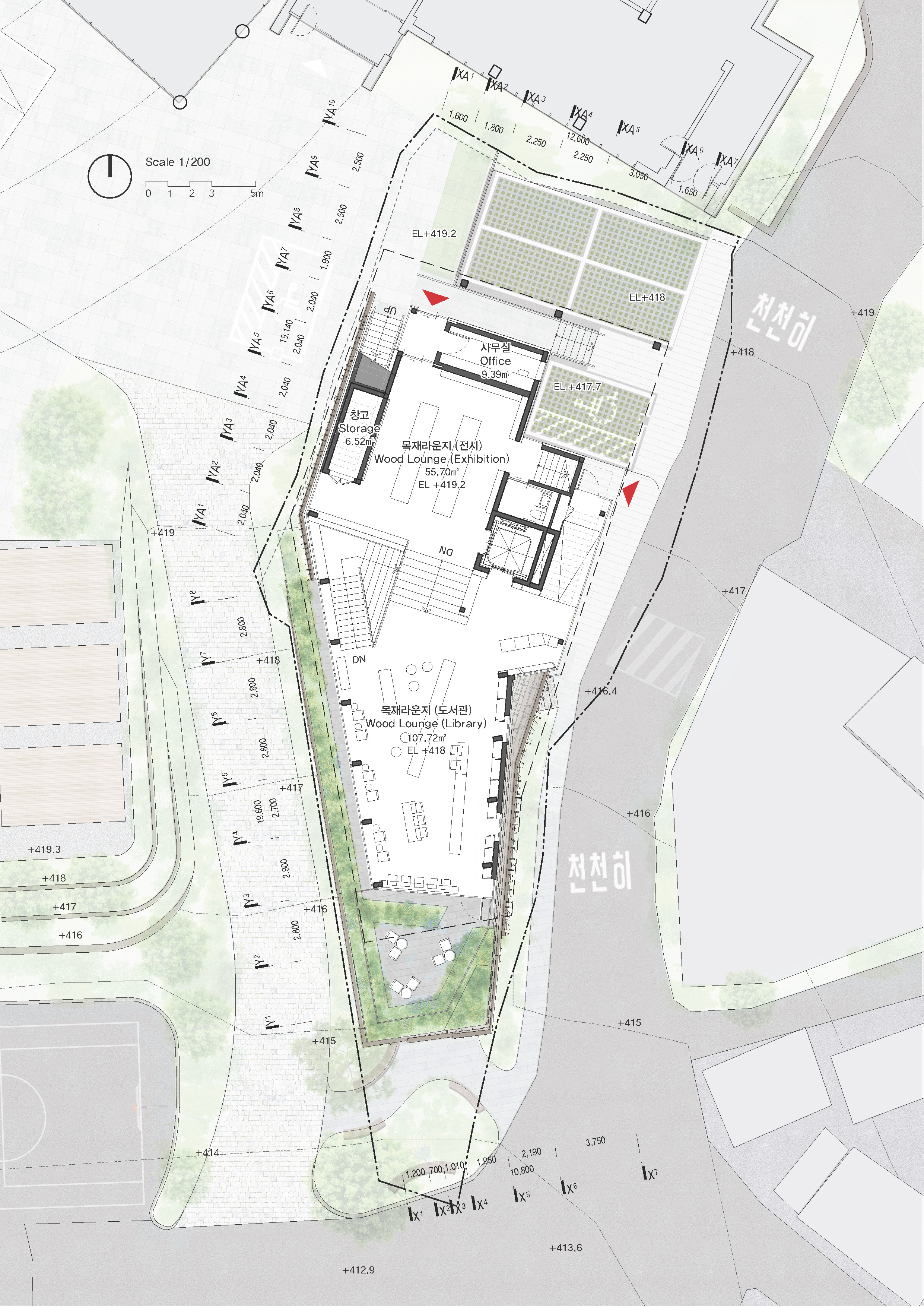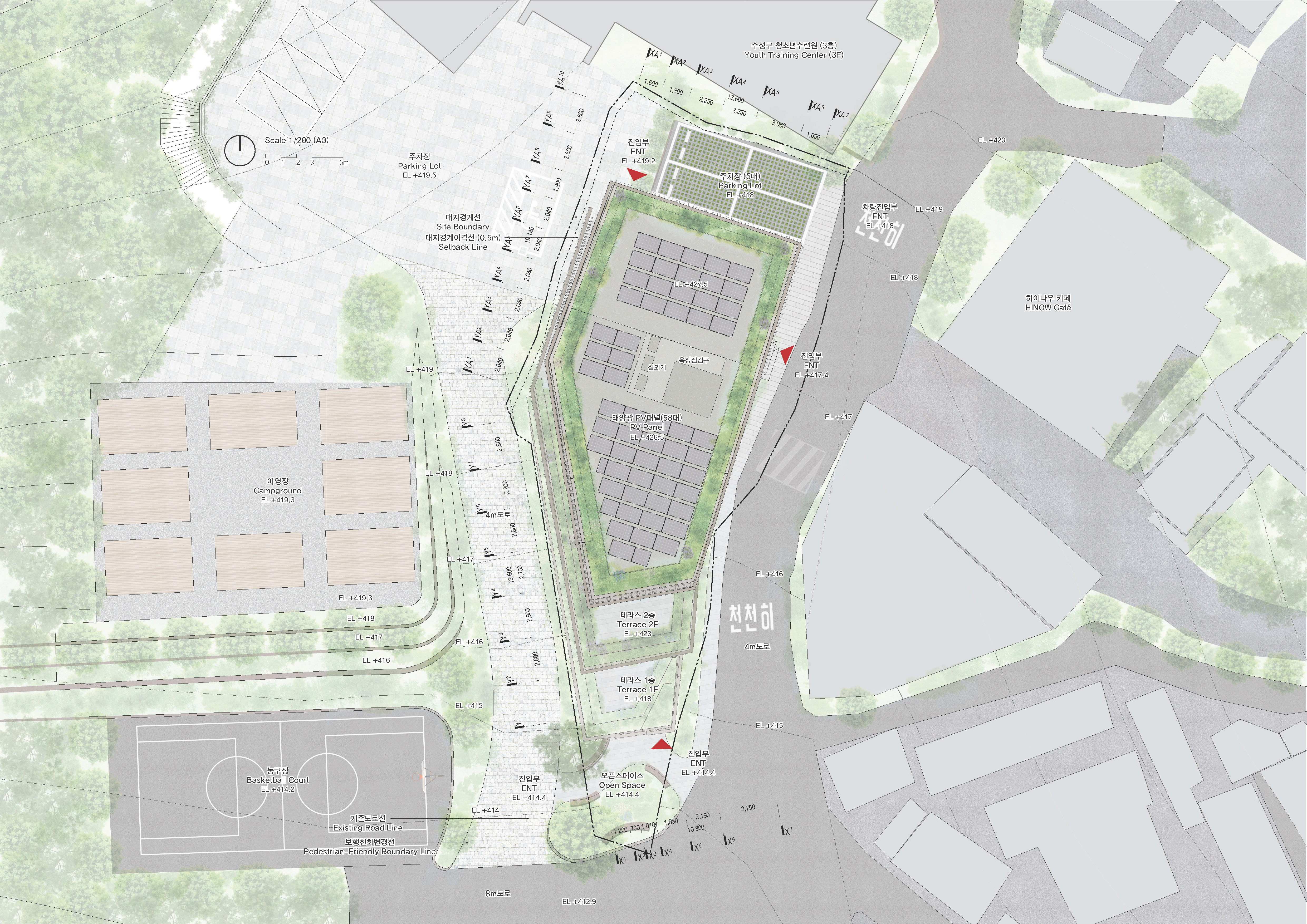 다양한 사용자와 지나가는 보행자들이 편하게 접근할 수 있는 열린 공간으로 계획하였다. 대상지는 진밭골 등산로의 시작점이자 청소년수련원과 숲속체험장으로 이어지는 ‘진밭골 단지’의 입구에 해당한다. 서측 도로는 자연소재인 돌로 재포장해 보행자 우선도로임을 직관적으로 느낄 수 있게 하고, 주차장으로 이어지는 차량들을 위한 동측 도로에는 별도의 보행로를 마련해 접근성과 안전을 높였다. 지층 북카페와 다목적실, 1층 목재라운지에는 각각 외부인이 쉽게 이용할 수 있는 출입구를 두었다. 청소년수련원과의 직접적인 연계를 위하여 수련원 출입구와 가까운 곳에 1층 목재라운지 출입구와 2층 강의실로 연결되는 외부 계단을 배치하였다. 목재라운지는 대지의 남북을 따라 시각적으로 개방된 하나의 큰 공간으로, 양측에서 쉽게 접근 가능하다. 이곳은 건물의 메인 로비이자 공용공간으로써, 아래층의 방문객 중심 프로그램들과 윗층의 수련원 중심 프로그램들을 연결하는 매개공간이 된다. 프로그램은 층별로 분리해 기능을 명확히 하면서도, 개방적 계단과 라운지를 통해 서로 유기적으로 연계될 수 있도록 계획하였다.
