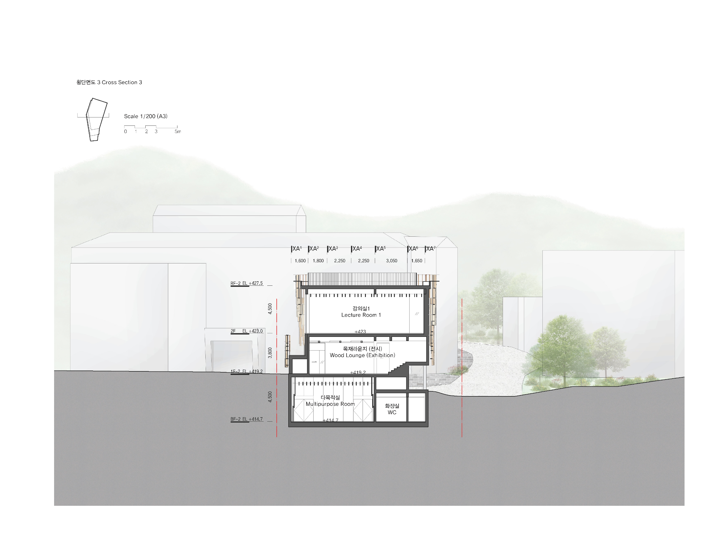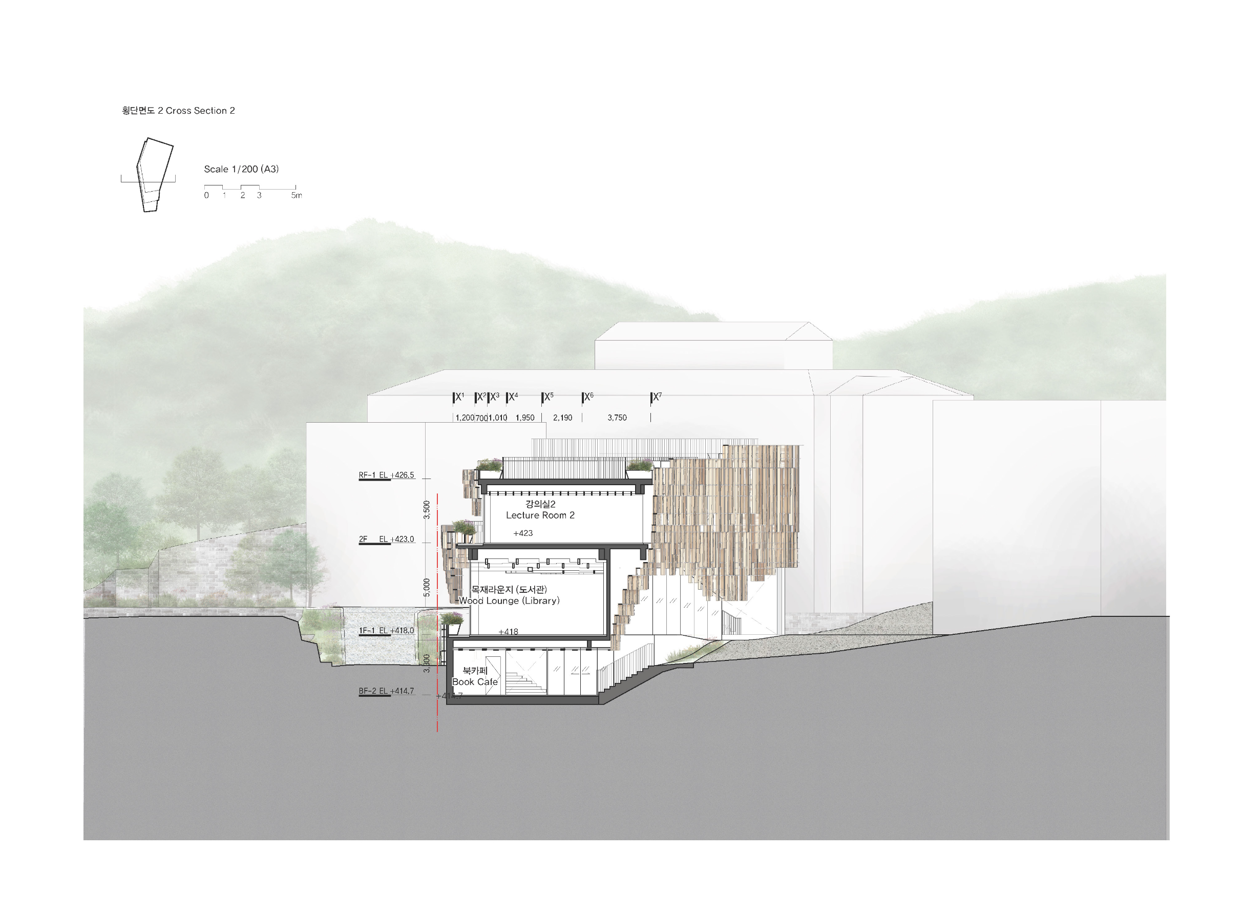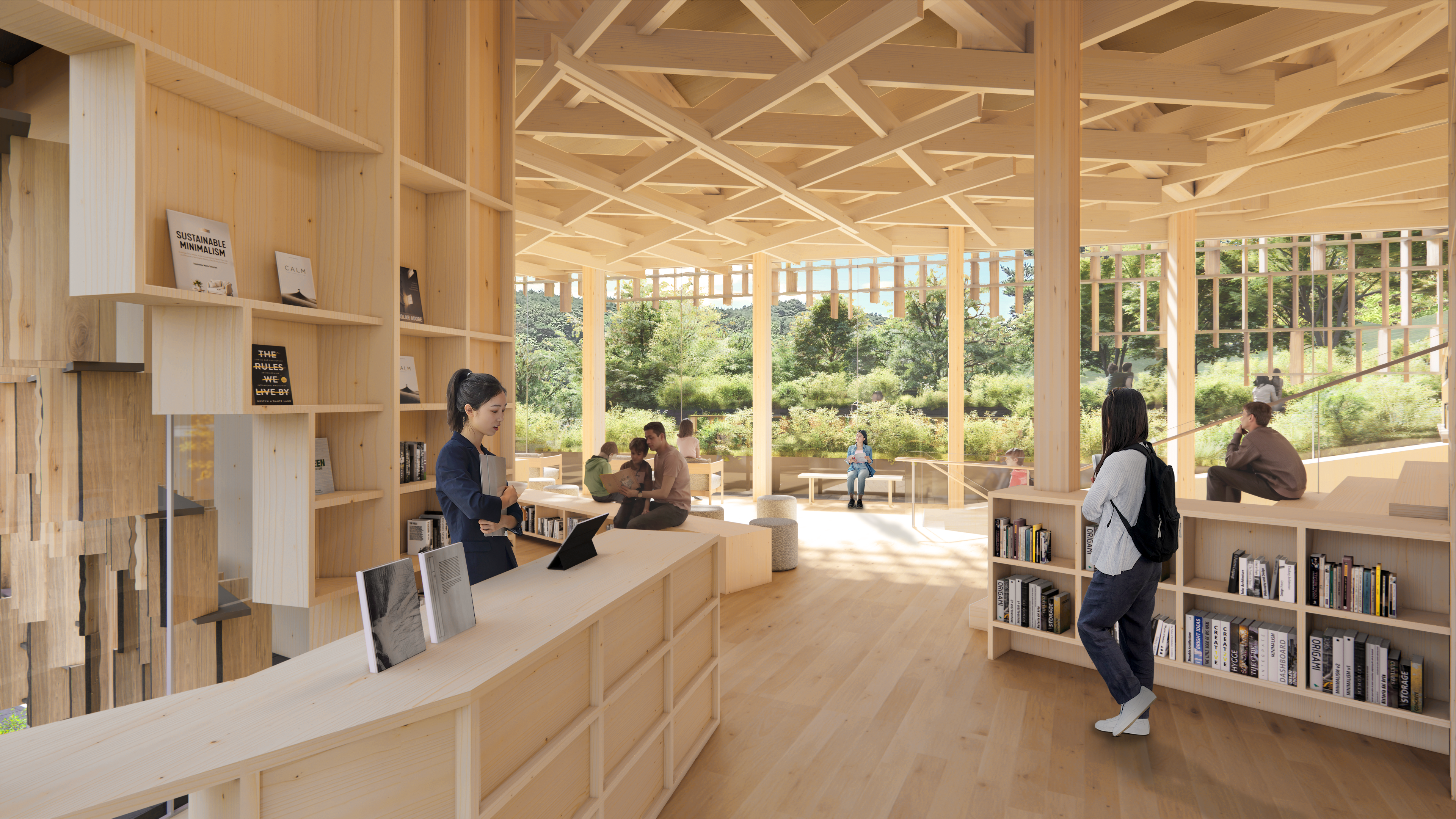 사용자가 언제나 자연과 함께할 수 있도록 설계하였다. 남측으로 넓게 열린 창과 테라스를 통해 숲과 산세의 풍경을 조망하고, 자연광이 가득한 밝고 따뜻한 내부를 만들었다. 조경으로 둘러싸인 각 층의 테라스를 통해 외부를 직접 경험할 수 있도록 하였다. 건물을 감싸는 목재 스크린은 불규칙한 배열로 시간과 날씨, 계절에 따라 다양한 표정을 만들며, 스크린 사이로 들어오는 햇빛을 숲의 캐노피처럼 부드럽게 산란시켜 내외부의 경계를 흐린다. 목재 스크린은 실내의 목재(GLT) 기둥과 보와 함께 하나의 유기적인 시스템을 이룬다. 격자 형태로 엮여 있는 천장부재들은 구조적 강성을 높이면서도 방문자에게 강한 공간적 인상을 남길 것이다. 소나무 실내마감과 낙엽송 구조체는 목재 특유의 따뜻한 질감과 향을 전달한다. 건물 안팎 어디서나 자연과 시각적·감각적으로 교감하며 공존하는 경험을 하도록 의도하였다.