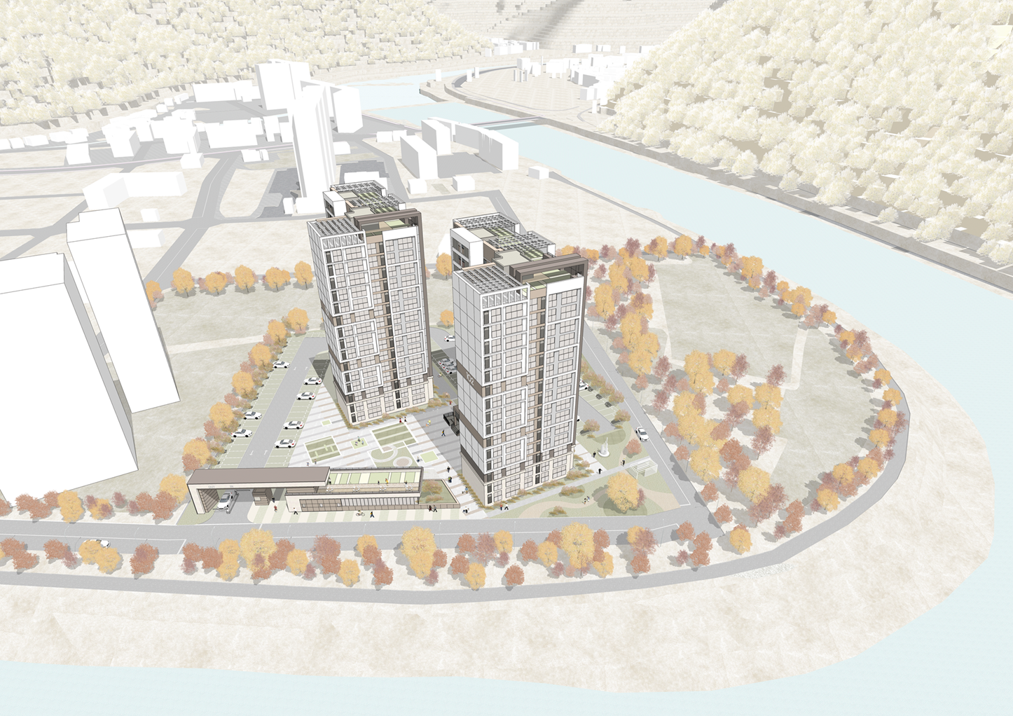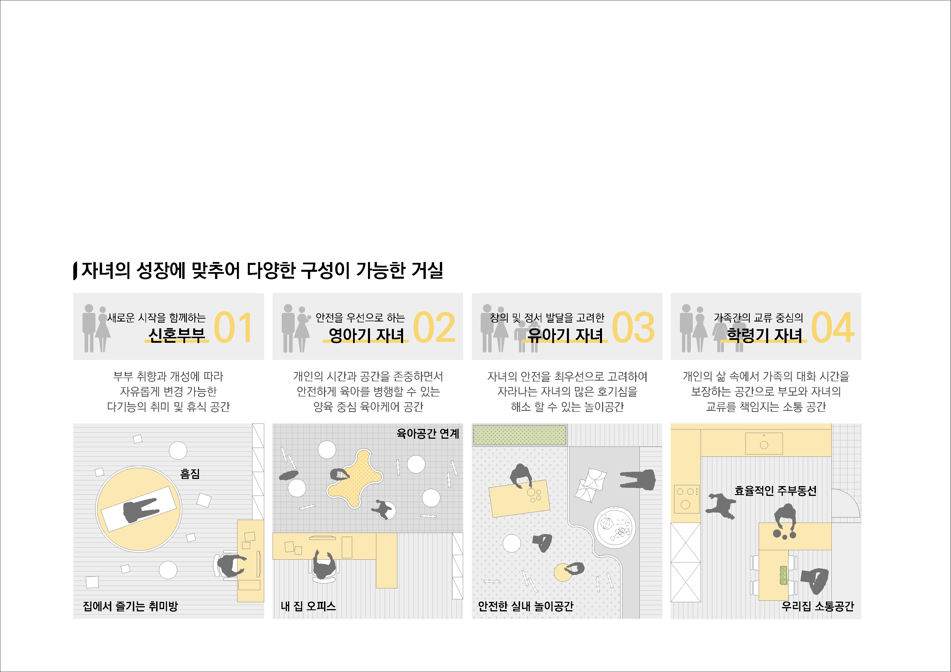 주거동은 남향 위주로 배치해 안정적인 일조와 조망을 확보하고, 가족 구성과 성장 변화를 고려한 가변형 단위세대는 신혼부부부터 학령기 자녀를 둔 가족까지 일상의 변화에 유연하게 대응할 수 있는 생활공간을 제공한다. 이러한 공간 구성은 가족의 성장과 함께 축적되는 일상을 안정적으로 수용하며, 지역 안에서 장기적으로 정착할 수 있는 주거 기반을 마련한다. 차량 동선은 외곽 순환형으로 분리하여 단지 내부는 안전한 보행 중심 공간으로 유지되고, 단지 전반에 배치된 조경은 화천천과 주변 산세의 흐름을 이어 받아 자연과 일상이 겹쳐지는 부드러운 경관을 만들어낸다. 이러한 공간 구성은 아이에게는 안전한 놀이환경을, 부모에게는 안심할 수 있는 일상을, 지역사회에는 열린 공유의 장소를 제공하며 일상이 자연스럽게 스며드는 따뜻한 공동체를 형성한다.