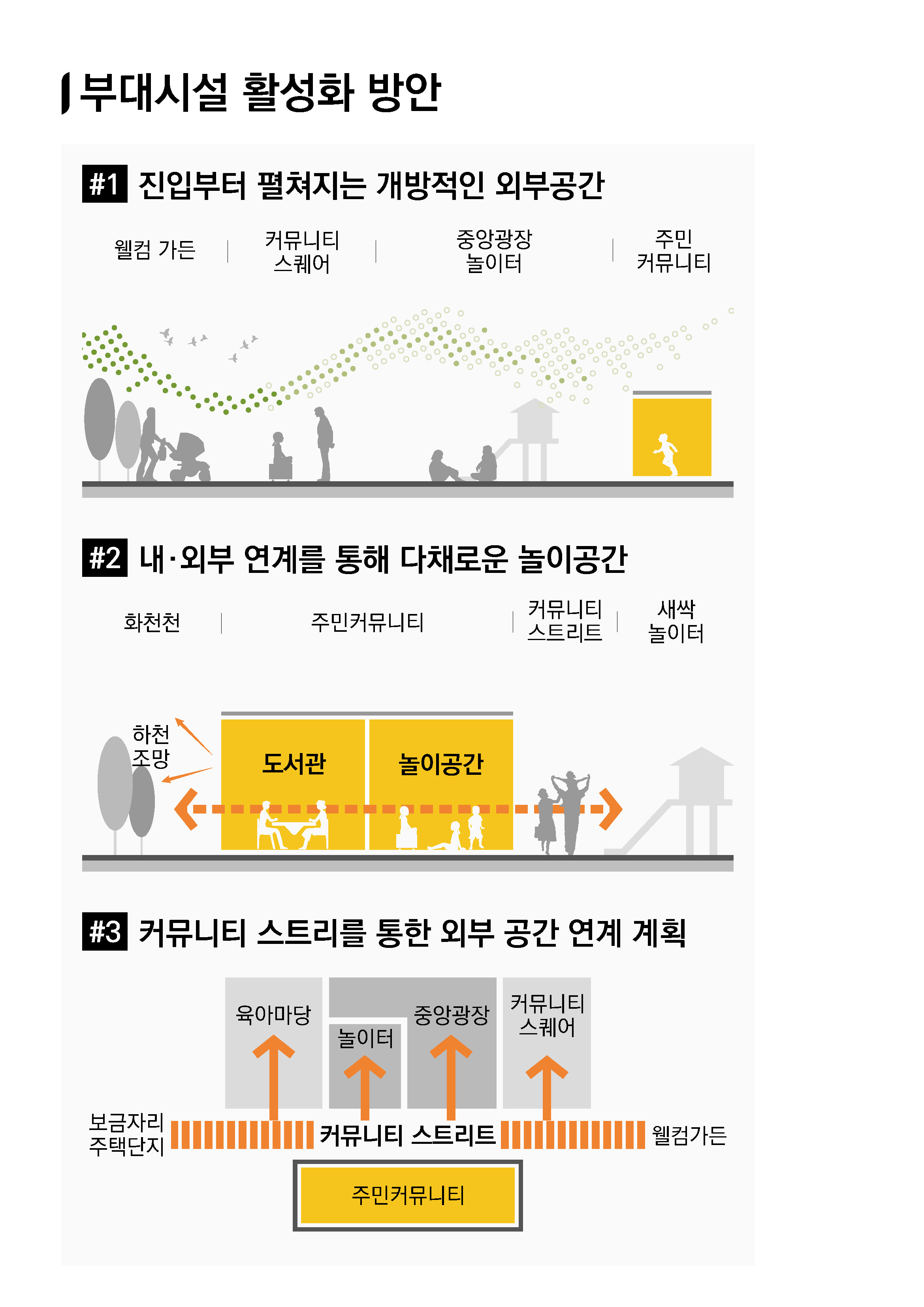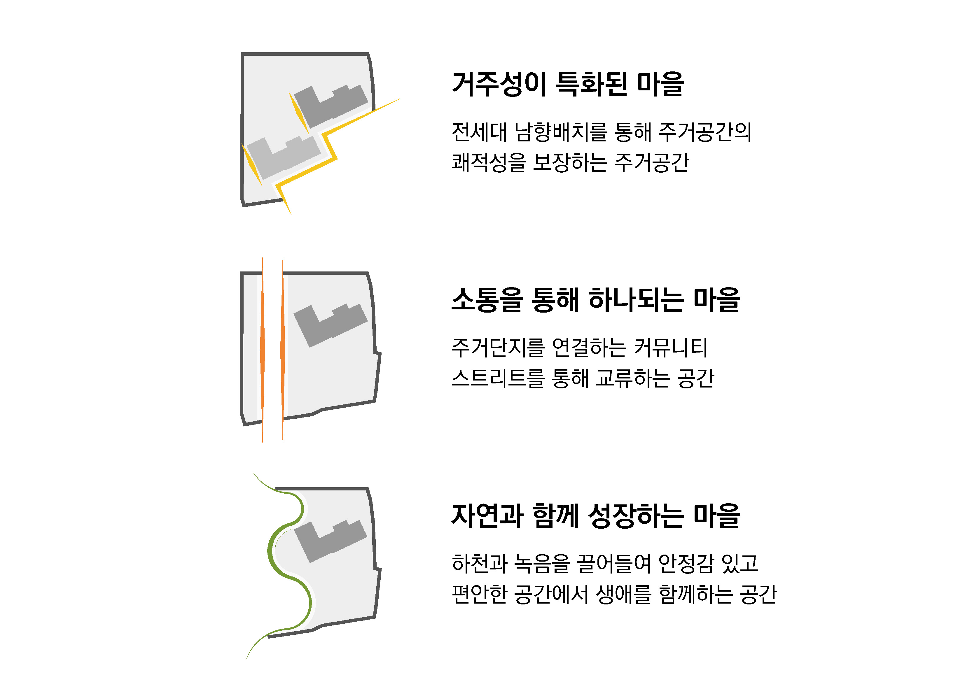 자연과 생활의 흐름 속에서 형성되는 일상의 공간들이 아이와 가족이 함께 성장하는 양육친화 마을을 만들어낸다. 화천의 자연환경을 품은 이 주거단지는 주거의 안정성과 보육환경의 공공성을 강화하며, 지역사회와 함께 호흡하는 새로운 생활 기반으로 자리 잡는다. 대지의 흐름과 주변 경관을 적극적으로 받아들인 배치를 통해 단지는 주변과 하나가 되어 자연스럽게 열린 외부공간을 형성하고, 이 외부공간은 아이와 부모, 지역 주민에게 머물고 걷고 만나는 일상의 경험을 제공한다. 단지를 가로지르는 커뮤니티 스트리트는 생활·양육·교류를 하나의 흐름으로 연결하는 중심축이 된다. 스트리트를 따라 배치된 공동육아공간, 공유주방, 작은도서관 등은 부모에게는 돌봄의 여유를, 아이에게는 놀이와 배움의 기회를 제공하며 주거단지 내부에서 자연스러운 공동체의 장면을 만들어낸다. 중앙광장과 육아마당, 새싹놀이터로 이어지는 열린 공간들은 세대 간 소통을 촉진하고, 이웃과의 삶이 겹쳐지는 풍경을 완성한다. 또한 인접한 화천형 보금자리주택과의 보행 연계를 고려하여 단지의 커뮤니티 스트리트는 인근 주거예정지와 자연스럽게 이어진다. 이를 통해 두 단지는 단순한 주거 단위를 넘어 보행과 양육환경을 공유하는 넓은 생활권을 형성하며, 장기적인 도시 맥락 속에서 함께 성장할 기반을 마련한다.