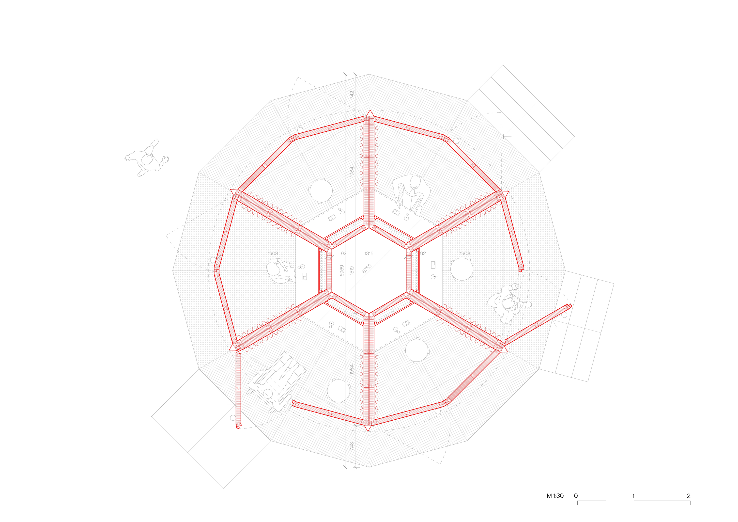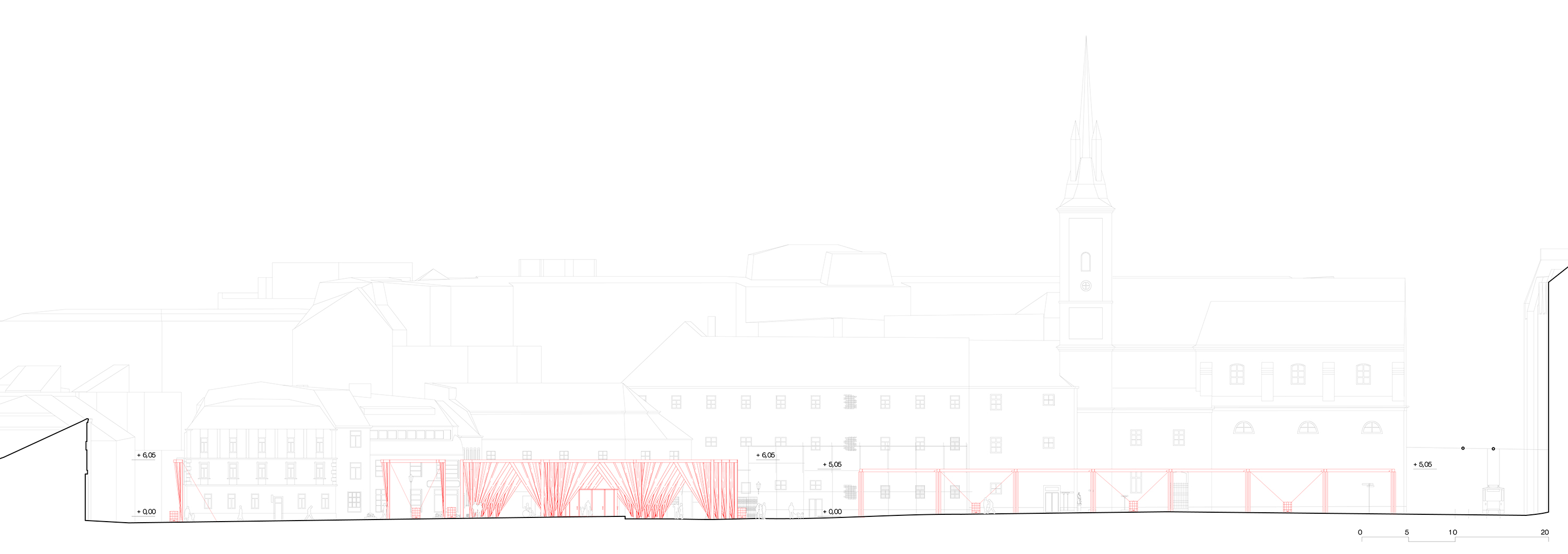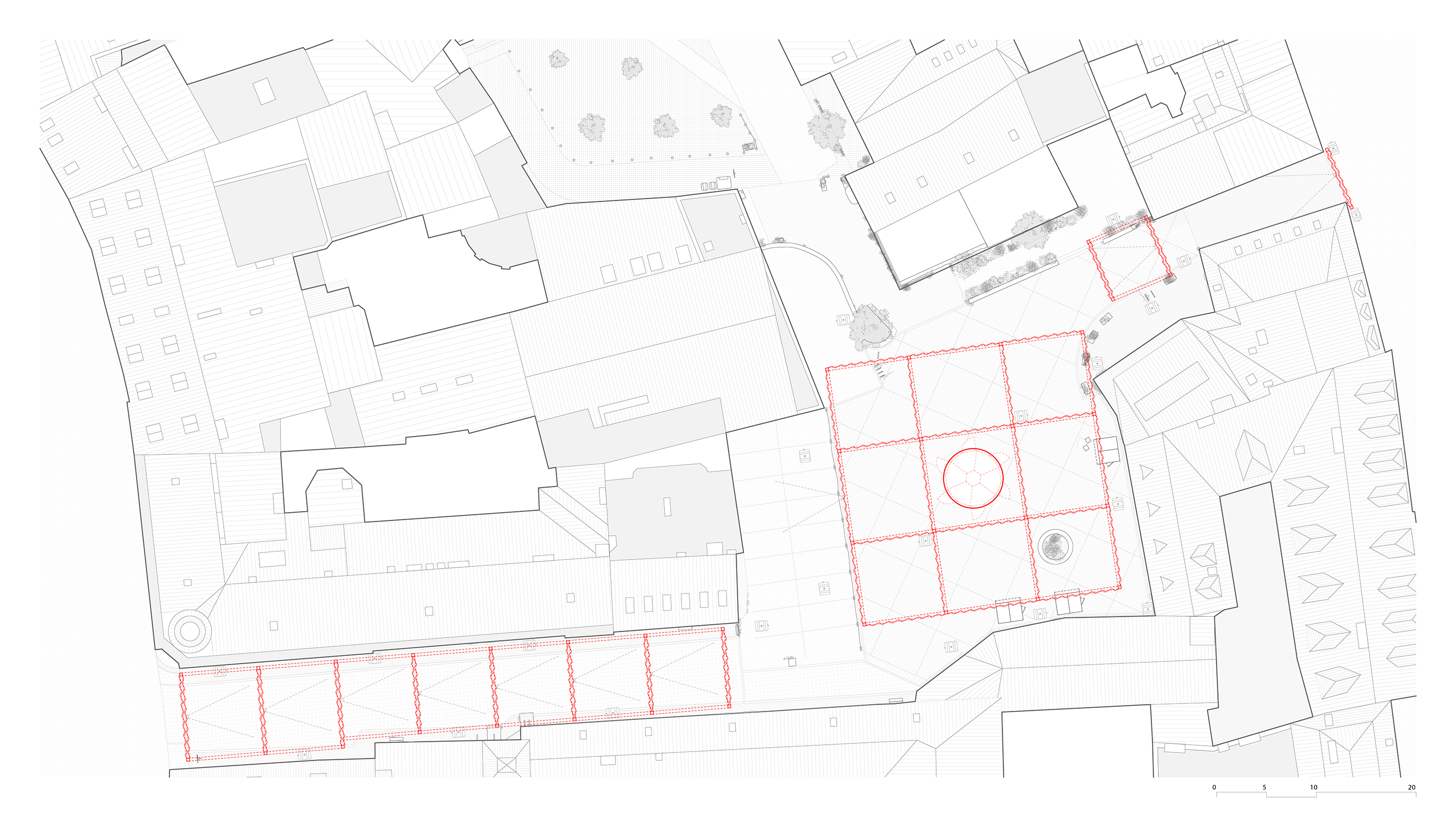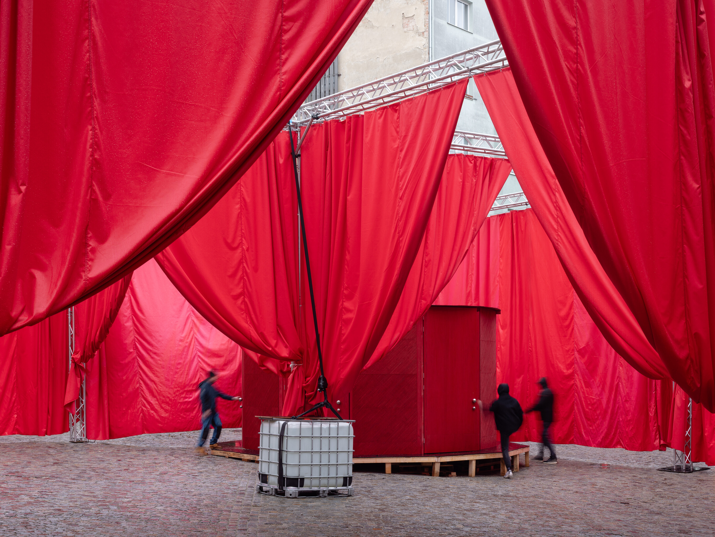 공간 구성은 피어 콜렉티브의 절제된 건축적 개입으로 완성됐다. 무대 구조에 쓰이는 모듈형 트러스 시스템 위에 흰색과 붉은색 패브릭 커튼을 걸어, 광장을 18개의 ‘방’처럼 분절했다. 이 커튼들은 방문자의 이동에 따라 연속적인 통로와 시선을 만들며, 하늘 아래 놓인 임시적인 실내 공간처럼 작동한다. 전체 면적은 약 2,478㎡로, 열 개의 테니스 코트에 해당하는 규모다.