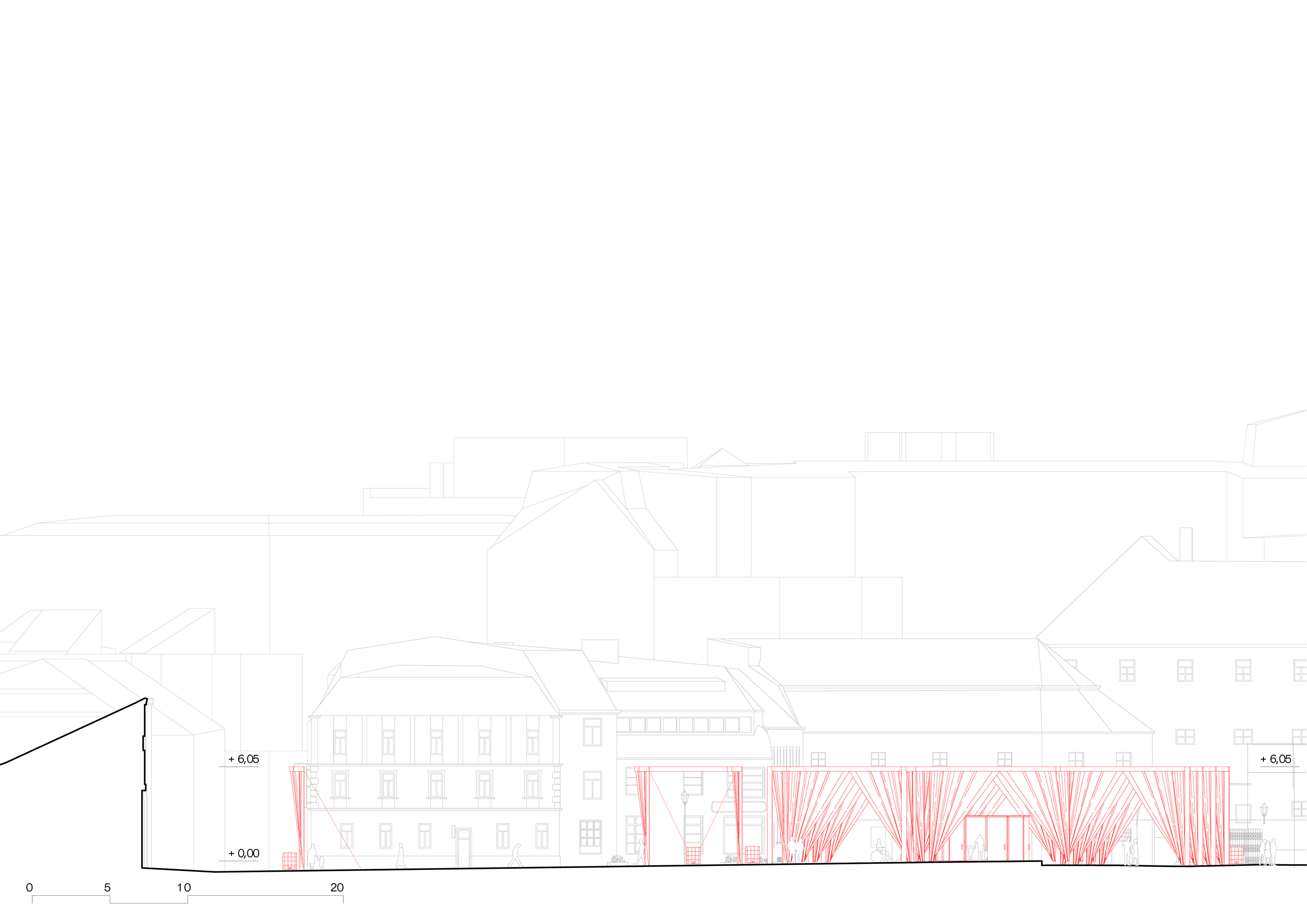 공간 구성은 피어 콜렉티브의 절제된 건축적 개입으로 완성됐다. 무대 구조에 쓰이는 모듈형 트러스 시스템 위에 흰색과 붉은색 패브릭 커튼을 걸어, 광장을 18개의 ‘방’처럼 분절했다. 이 커튼들은 방문자의 이동에 따라 연속적인 통로와 시선을 만들며, 하늘 아래 놓인 임시적인 실내 공간처럼 작동한다. 전체 면적은 약 2,478㎡로, 열 개의 테니스 코트에 해당하는 규모다.