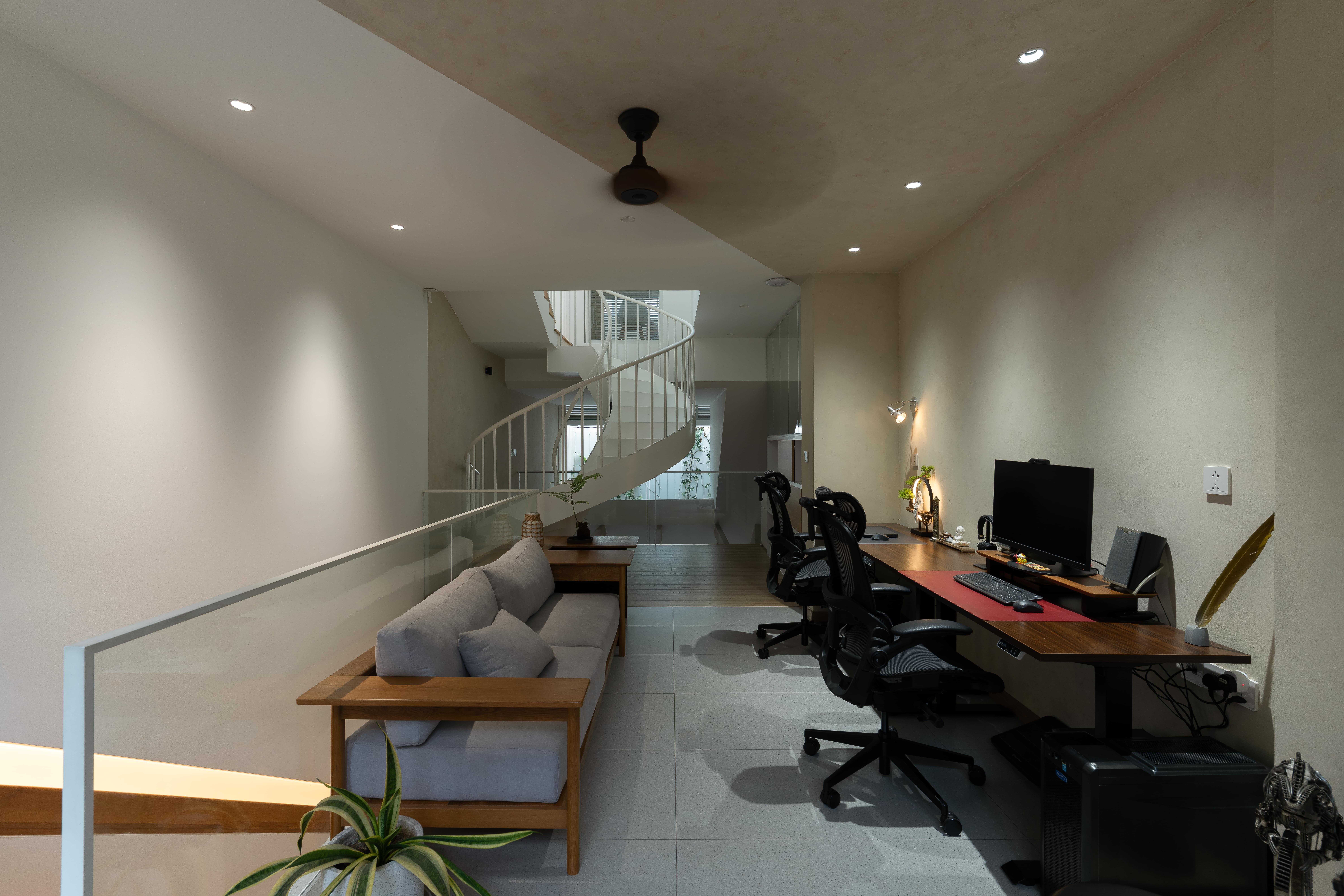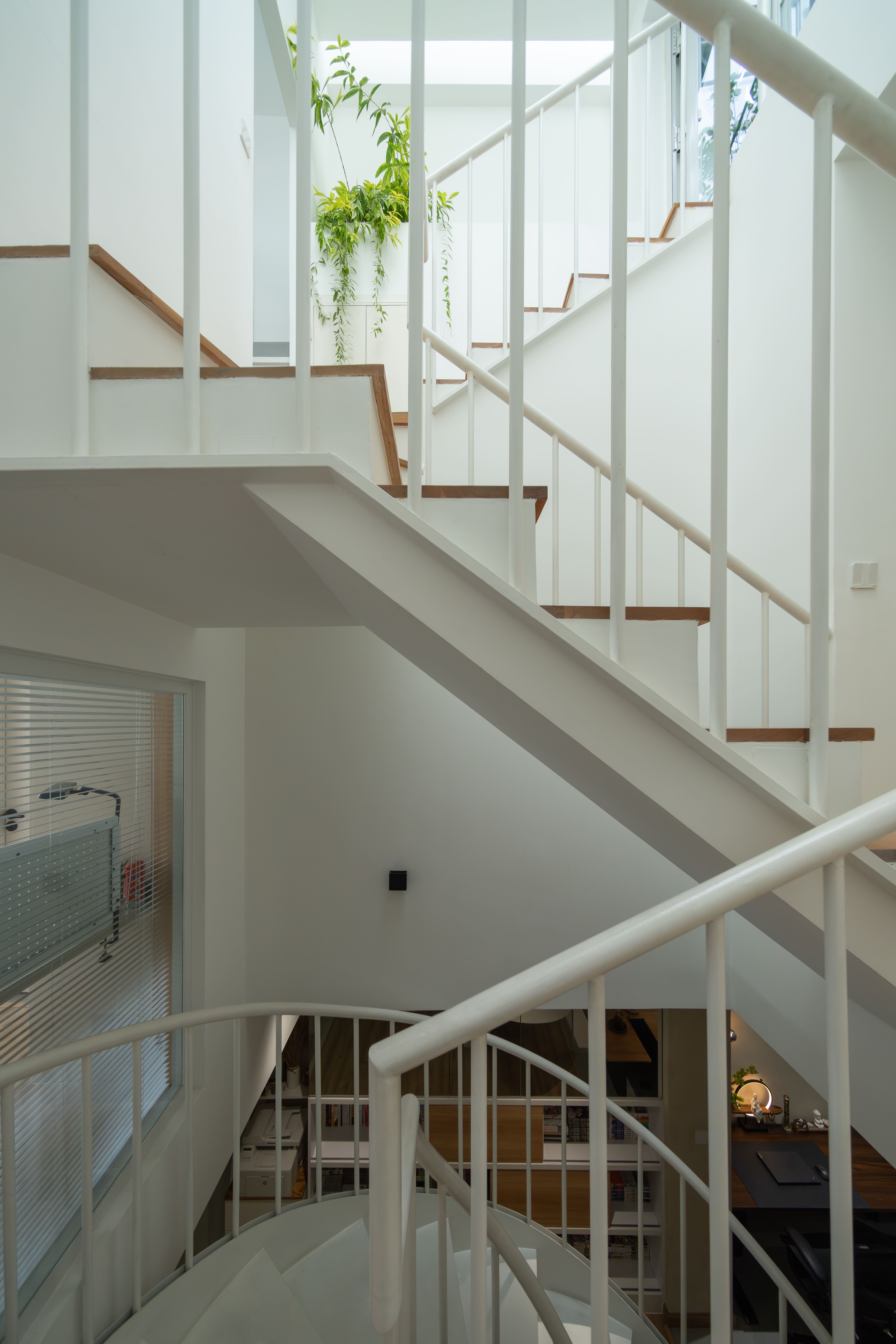 - 메자닌에는 거실이 자리하며, 곡선형 계단으로 연결된다. 이는 좁은 면적 안에서 동선을 부드럽게 만드는 장치다. 이 레벨은 휴식, 업무, 모임 등 다양한 활동을 수용하는 다목적 공간으로 활용되며, 거주자의 유연한 라이프스타일에 따라 분절되지 않은 공유 공간으로 작동한다.