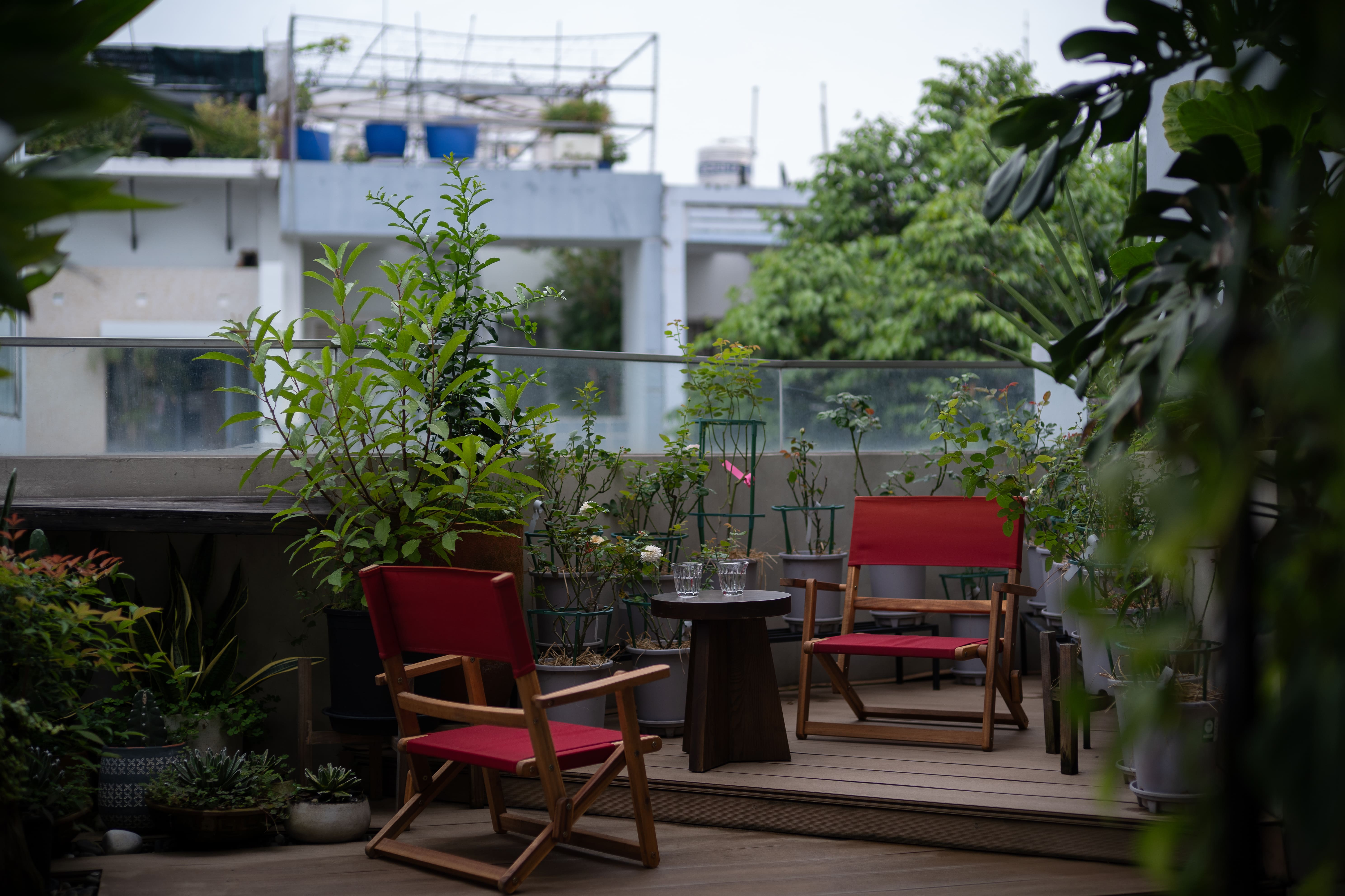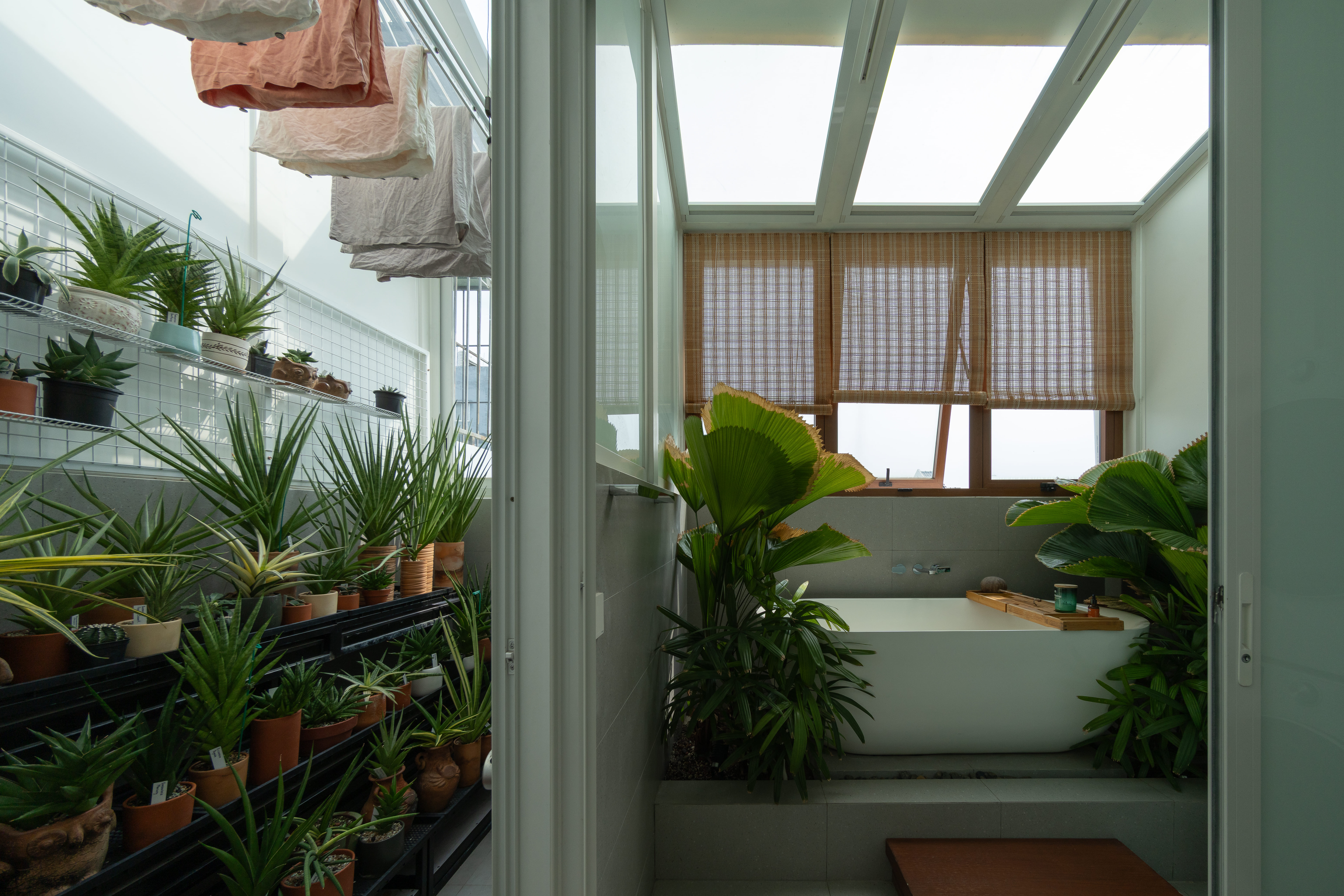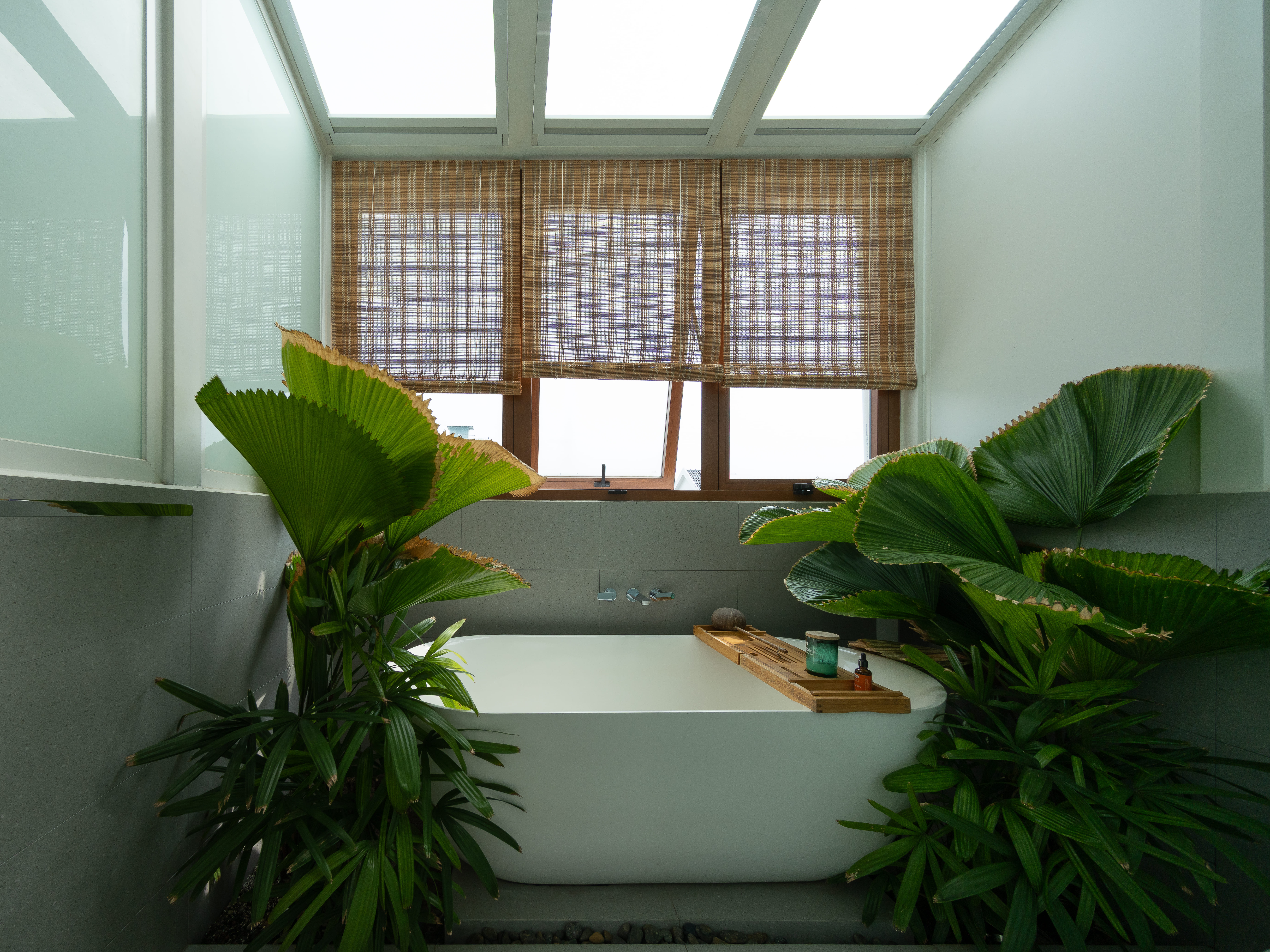 - 옥상은 반외부 욕실과 넉넉한 식재 공간을 갖춘 휴식의 장소로, 식물을 사랑하는 건축주의 취향이 반영된 공간이다.