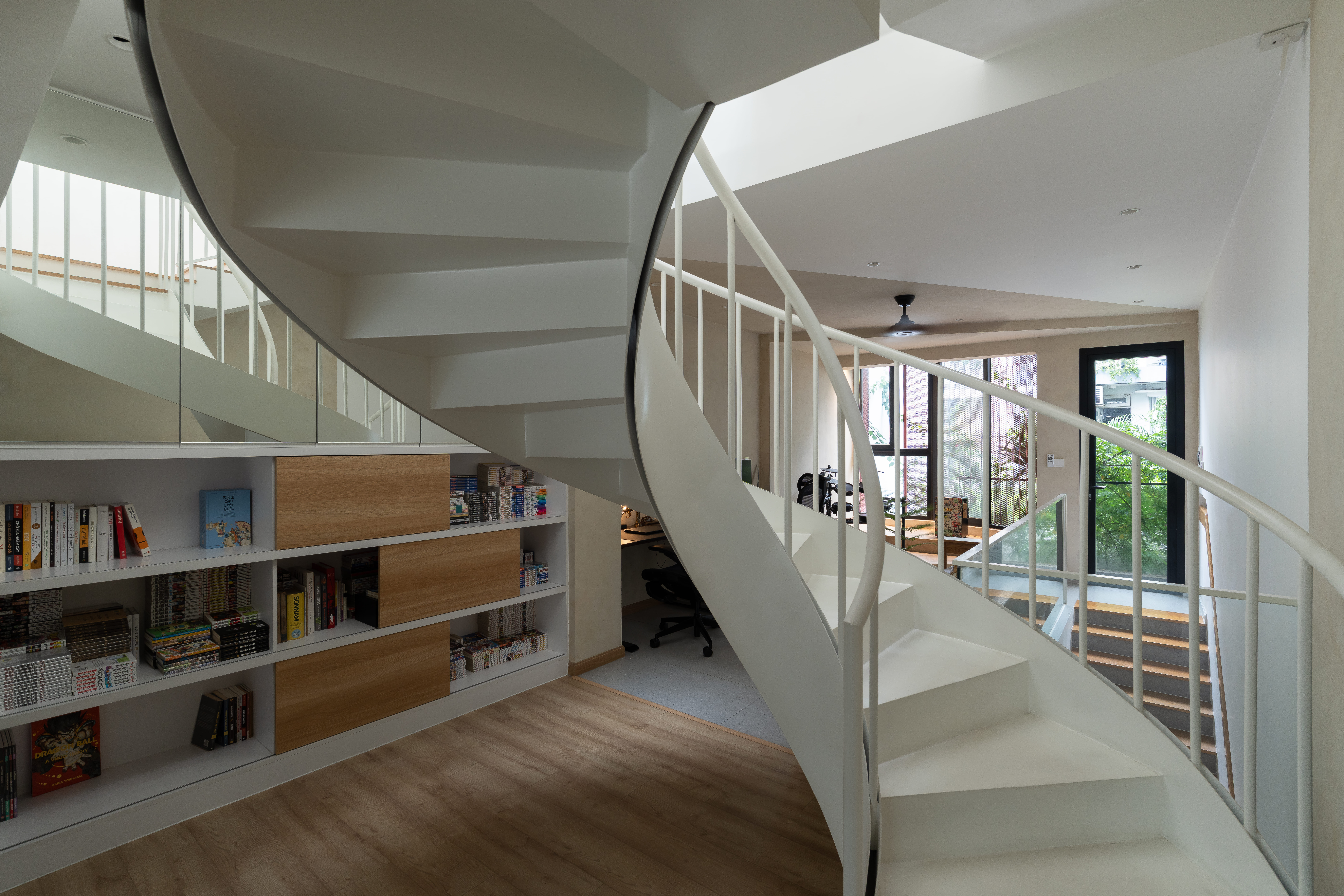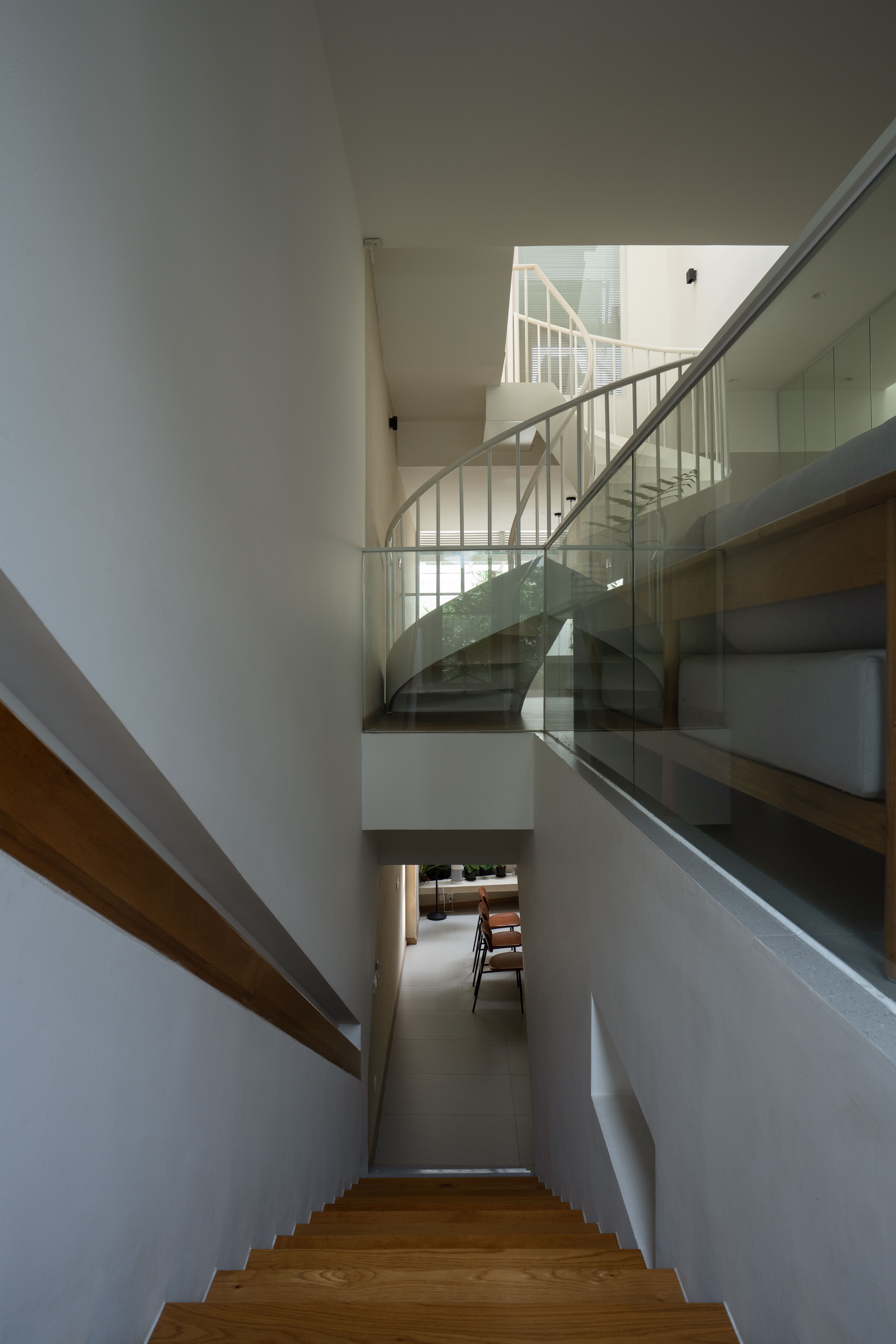 • 메자닌에는 거실이 자리하며, 곡선형 계단으로 연결된다. 이는 좁은 면적 안에서 동선을 부드럽게 만드는 장치다. 이 레벨은 휴식, 업무, 모임 등 다양한 활동을 수용하는 다목적 공간으로 활용되며, 거주자의 유연한 라이프스타일에 따라 분절되지 않은 공유 공간으로 작동한다.