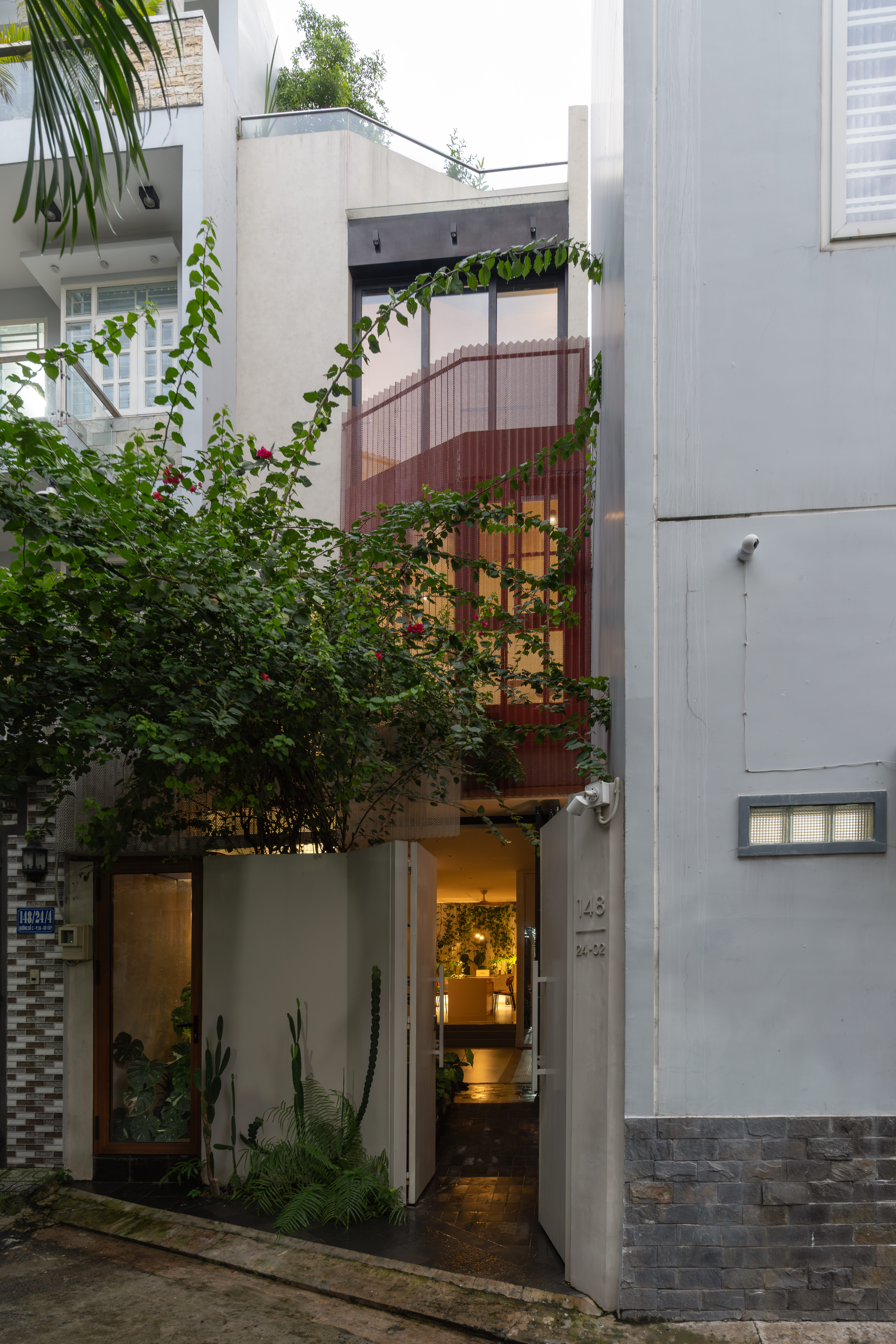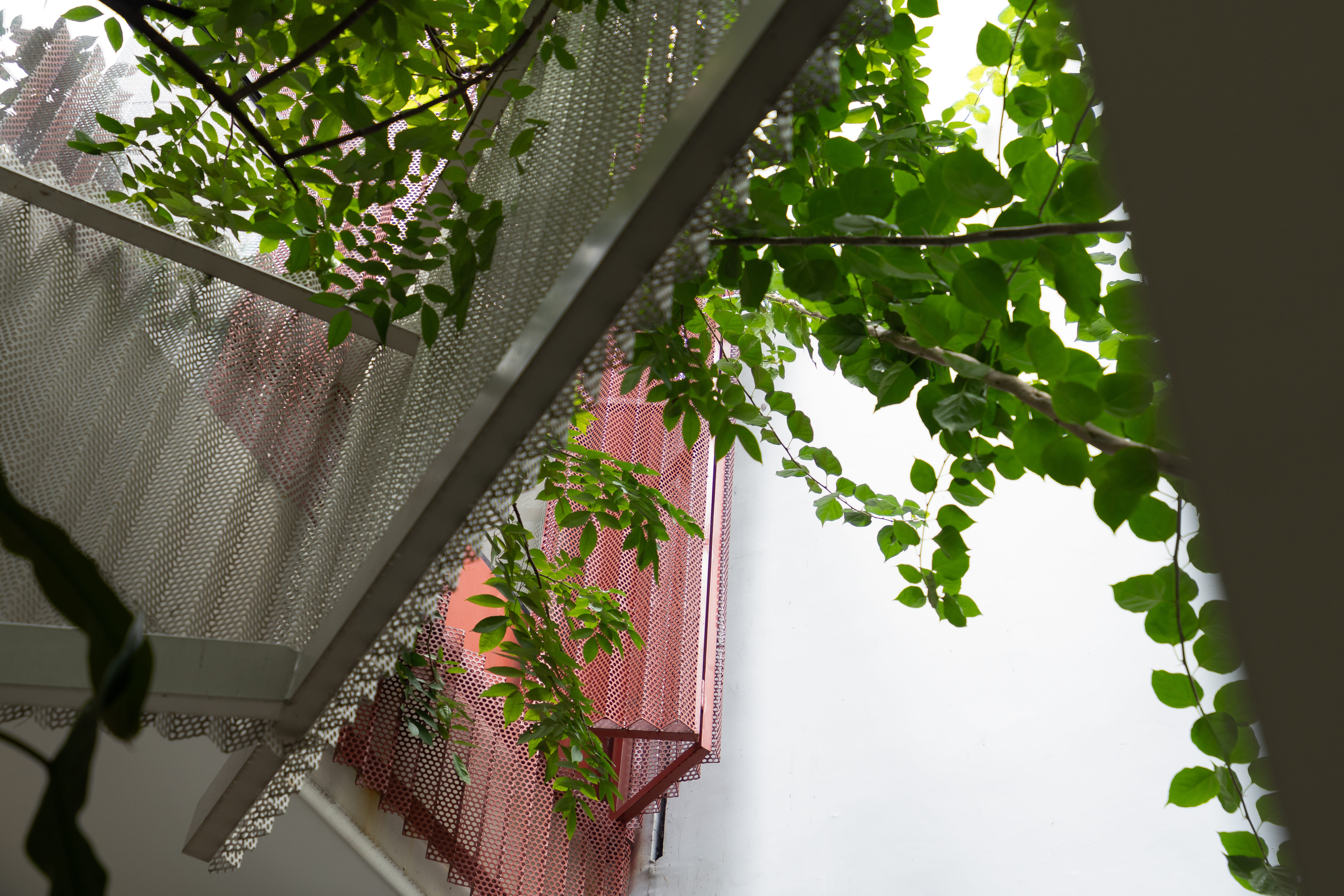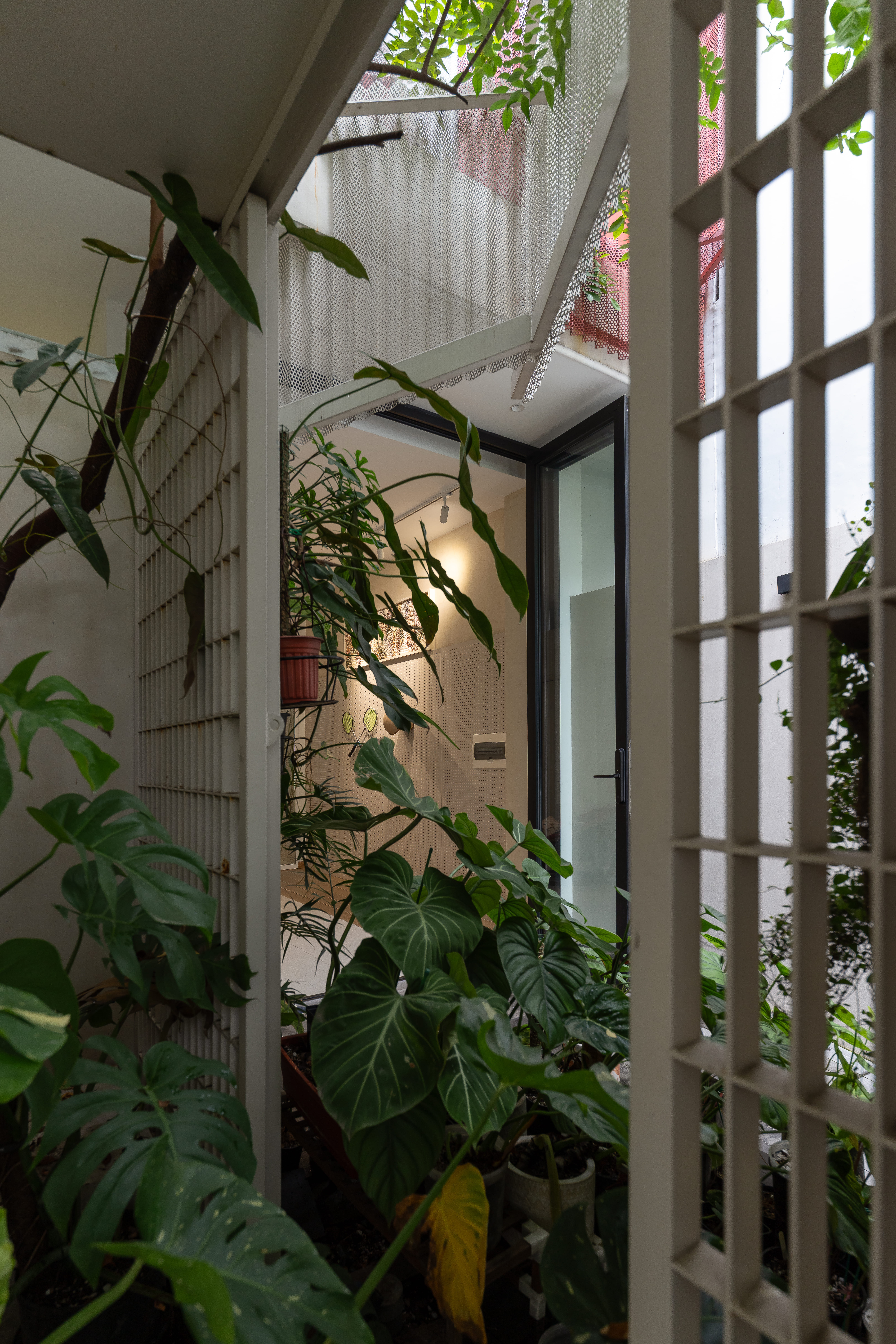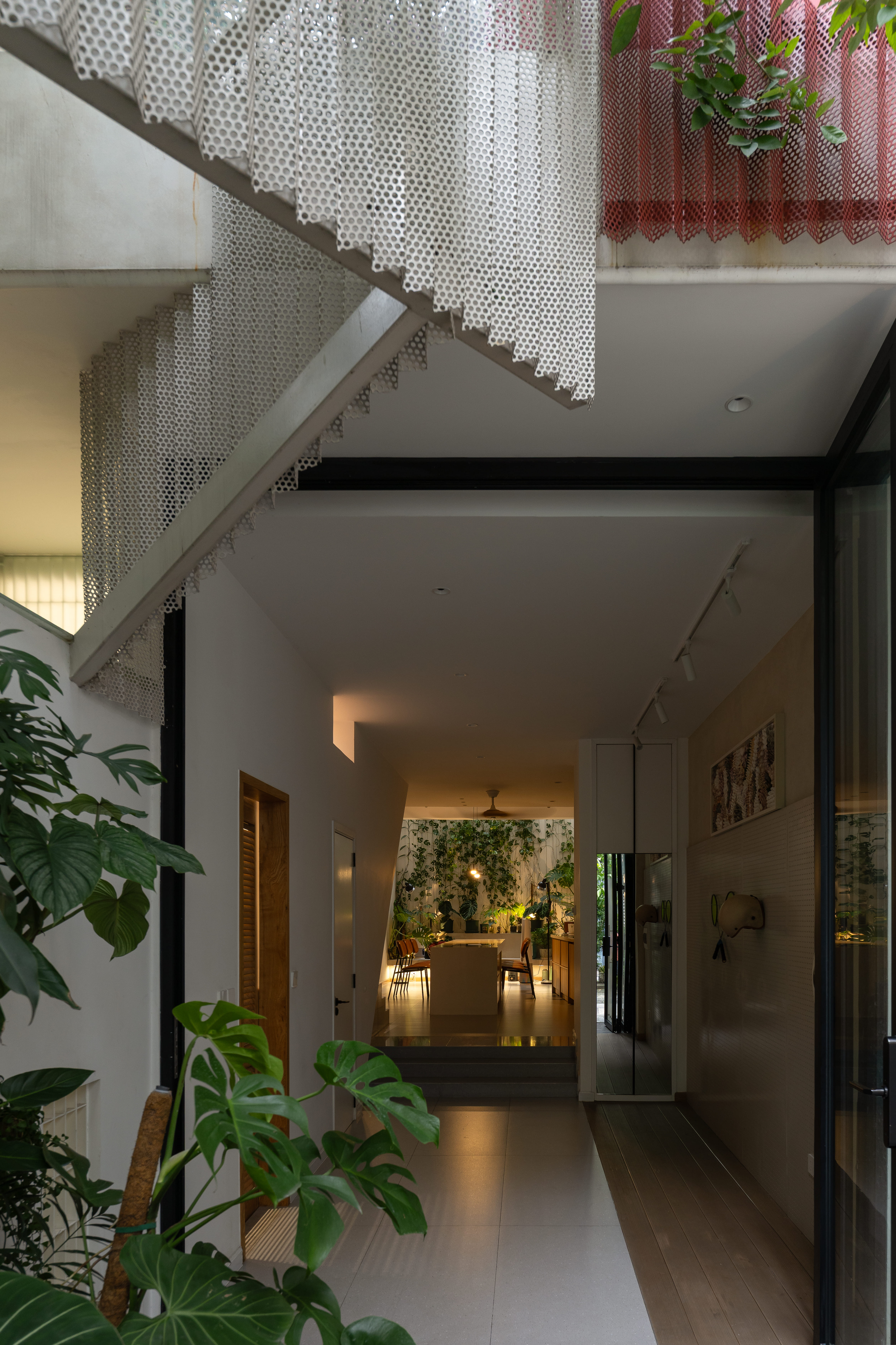 전면 파사드는 겹겹이 구성된 스틸 메쉬로 감싸져 있다. 이는 밀집된 주거 환경에서 시선을 차단하는 프라이버시 스크린이자, 비대칭적인 대지 형상을 시각적으로 정리하는 요소다. 동시에 직사광선을 완화해 전면 정원과 식재 공간에 적합한 환경을 조성한다.