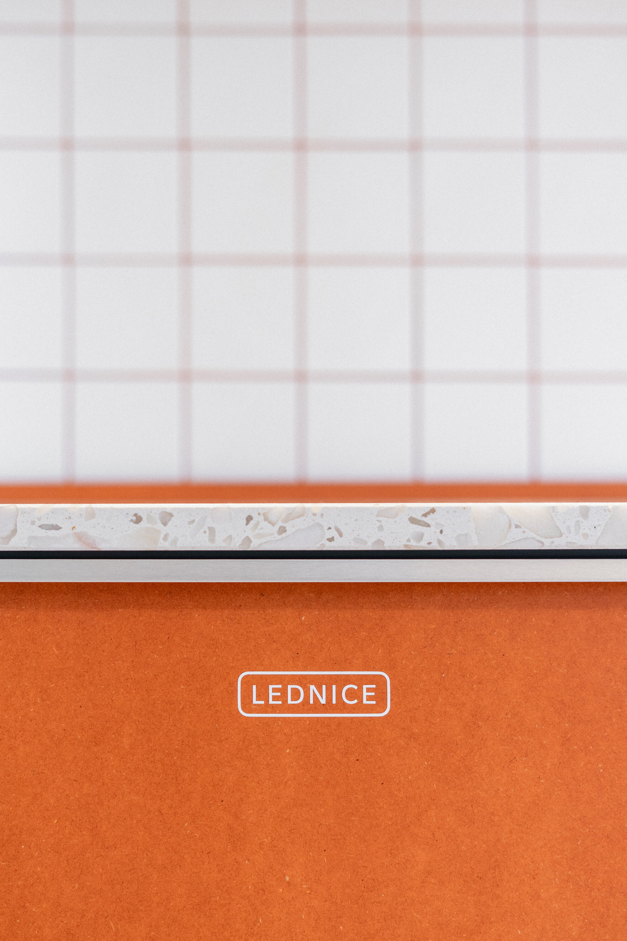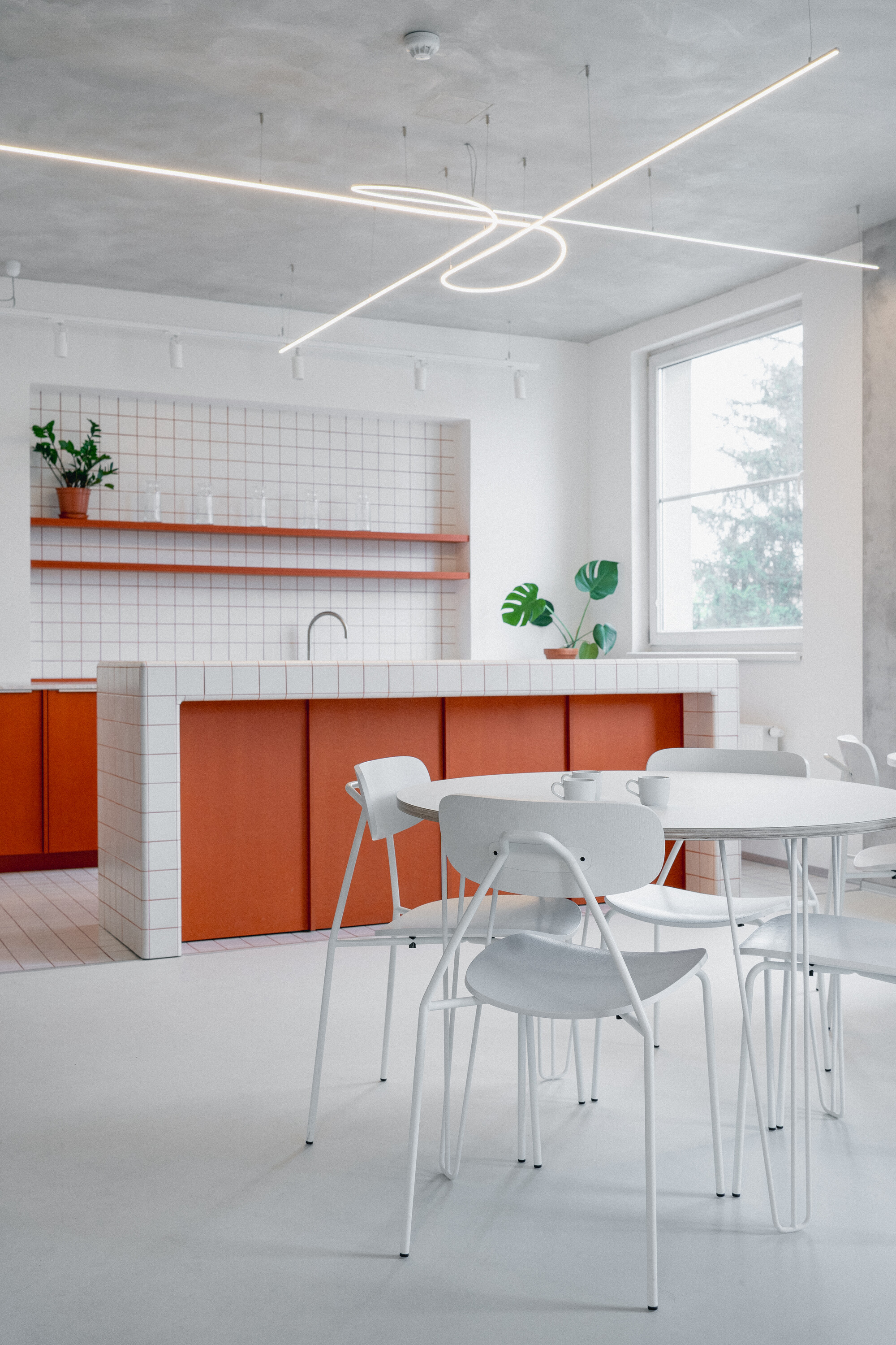 재료 선택 역시 공간의 정밀하고 현대적인 성격을 강조한다. 키친 공간에는 스테인리스 스틸 마감과 세라믹 아일랜드가 적용되었고, 회의실에는 로고 패턴이 반영된 맞춤형 MDF 패널이 설치되었다. 이와 같은 특수 제작 가구와 디테일 요소들은 브릭(Brick)사의 협업을 통해 구현되었다.