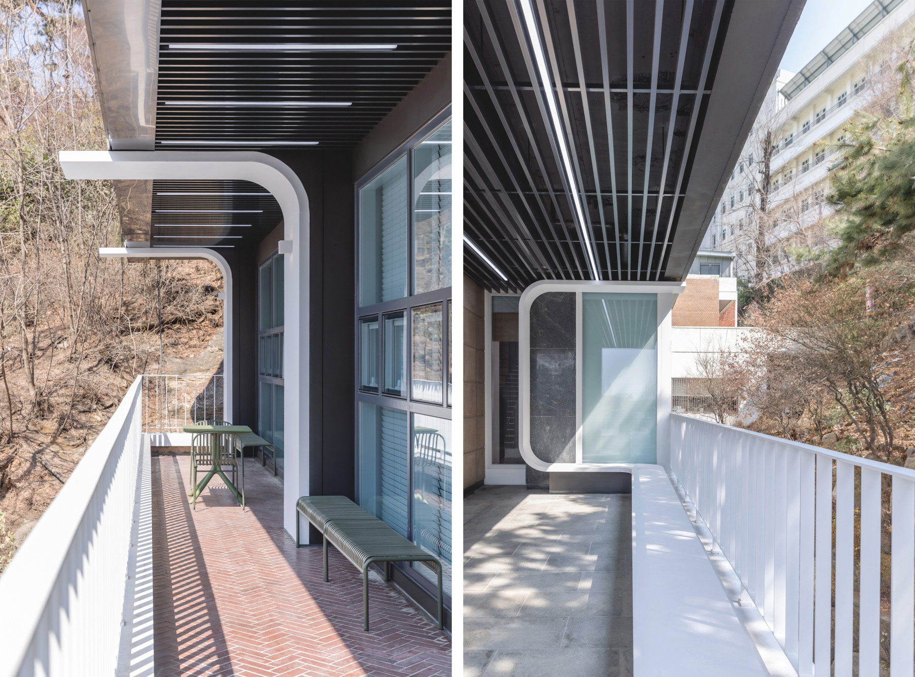 기존에 어둡고 활용도가 낮았던 광장 앞 테라스는 금속 루버와 라인 조명을 통해 빛의 확산을 유도하고, 녹색 야외 가구를 배치해 밝고 쾌적한 외부 휴게 공간으로 재구성되었다. 이 공간은 학생회관의 확장된 전면이자 캠퍼스 외부 공간과 내부를 잇는 중간 매개체로 기능한다.