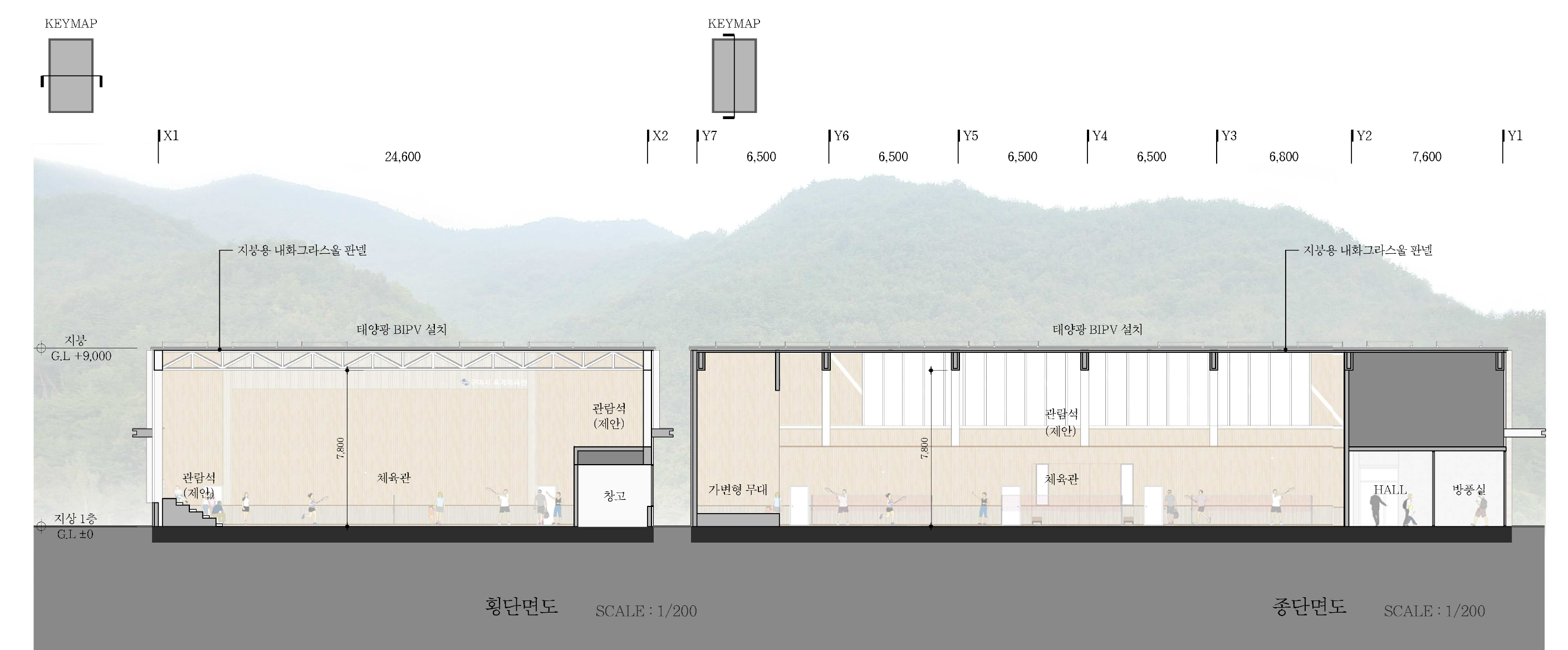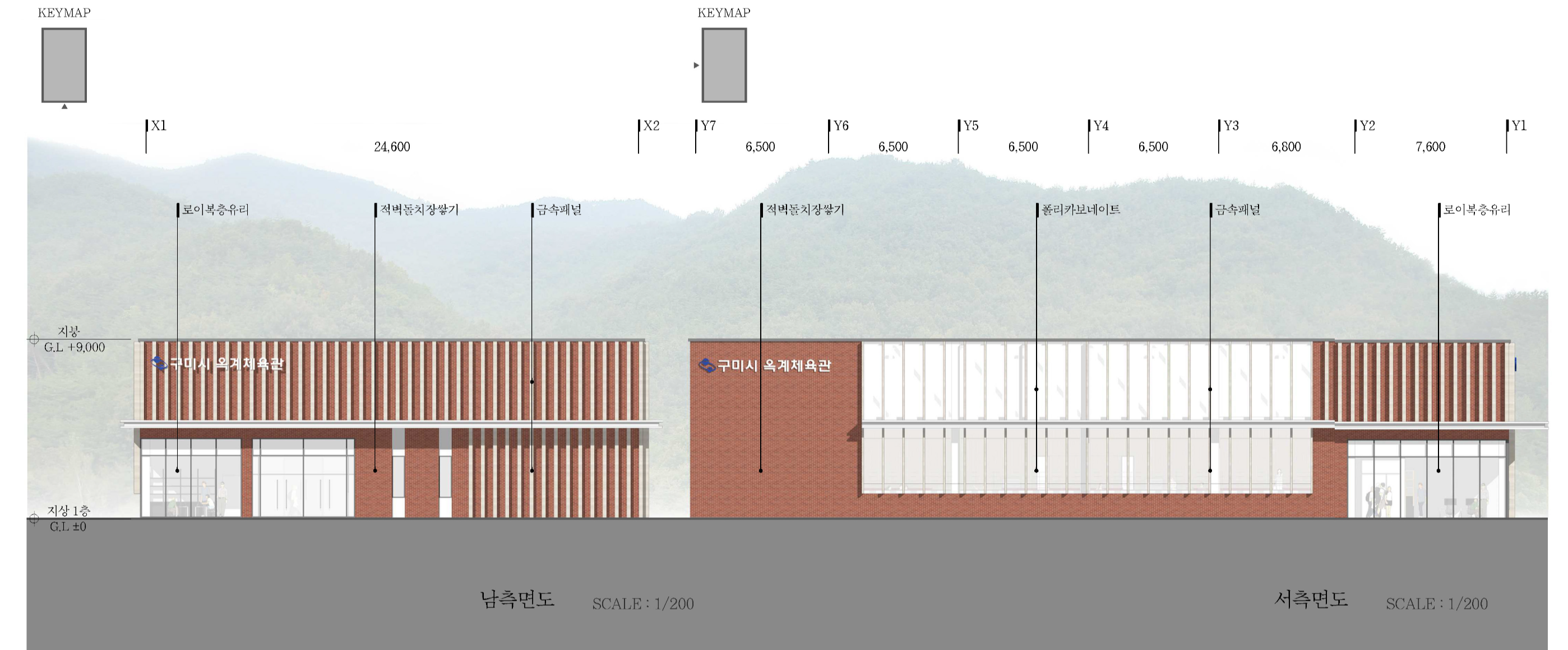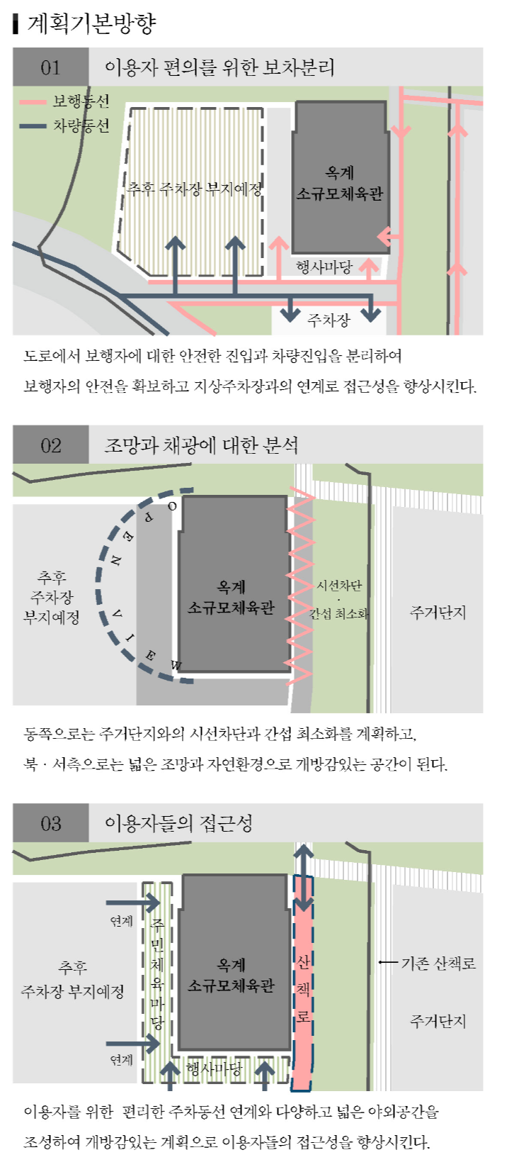 다수가 이용할 수 있는 개방형 공간으로 열린 체육센터를 계획하였다. 지역주민들은 이곳에 모여 다양한 체육활동들과 소통 · 교류의 공간을 조성하고 주변 맥락을 고려한 안정감있는 입면계획으로 옥계동의 상징성을 가지는 체육센터로 계획하였다.